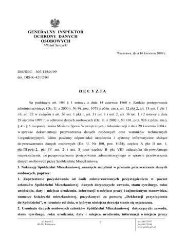 GENERALNY INSPEKTOR OCHRONY DANYCH OSOBOWYCH Michał Serzycki Warszawa, dnia 16 kwietnia 2009 r. DIS/DEC – 307/13545/09 dot. DIS-K-421/2/09 DECYZJA Na podstawie art. 104 § 1 ustawy z dnia 14 czerwca 1960 r. Kodeks postępowania administracyjnego (Dz. U. z 2000 r. Nr 98, poz. 1071 z późn. zm.), art. 12 pkt 2, art. 18 ust. 1 pkt 1 i 6, art. 22 w związku z art. 26 ust. 1 pkt 1, art. 31 ust. 1 i ust. 2, art. 36 ust. 1 i 2 ustawy z dnia 29 sierpnia 1997 r. o ochronie danych osobowych (Dz. U. z 2002 r. Nr 101, poz. 926 z późn. zm.), § 4 i § 5 rozporządzenia Ministra Spraw Wewnętrznych i Administracji z dnia 29 kwietnia 2004 r. w sprawie dokumentacji przetwarzania danych osobowych oraz warunków technicznych i organizacyjnych, jakim powinny odpowiadać urządzenia i systemy informatyczne służące do przetwarzania danych osobowych (Dz. U. Nr 100, poz. 1024), częścią A pkt II ust. 1, pkt III ppkt 2, pkt IV ust. 2 i ust. 3 oraz częścią B pkt VIII załącznika do powołanego rozporządzenia, po przeprowadzeniu postępowania administracyjnego w sprawie przetwarzania danych osobowych przez Spółdzielnię Mieszkaniową I. Nakazuję Spółdzielni Mieszkaniowej usunięcie uchybień w procesie przetwarzania danych osobowych, poprzez: 1. Zaprzestanie pozyskiwania od osób zainteresowanych przystąpieniem w poczet członków Spółdzielni Mieszkaniowej danych dotyczących: zawodu, stanu cywilnego, roku urodzenia, daty i miejsca urodzenia, informacji o miejscu pracy i zajmowanym stanowisku, numerze książeczki mieszkaniowej, pozyskanych za pomocą „Deklaracji przystąpienia do Spółdzielni”, w terminie od dnia, w którym niniejsza decyzja stanie się ostateczna. 2. Usunięcie danych osobowych członków Spółdzielni Mieszkaniowej dotyczących: zawodu, stanu cywilnego, roku urodzenia, daty i miejsca urodzenia, informacji o miejscu pracy ul. Stawki 2 00-193 Warszawa 1 tel. 860-70-97 fax 860-70-86 www.giodo.gov.pl i zajmowanym stanowisku, numeru książeczki mieszkaniowej, pozyskanych za pomocą „Deklaracji przystąpienia do Spółdzielni”, w terminie 2 miesięcy od dnia, w którym niniejsza decyzja stanie się ostateczna. 3. Wskazanie w umowie rozliczeniowej zawartej przez Spółdzielnię Mieszkaniową w dniu 21 czerwca 2000 r. z X zakresu przetwarzania przez X, danych osobowych członków Spółdzielni oraz osób niebędących członkami Spółdzielni a posiadających tytuł prawny do lokalu, w terminie 30 dni od dnia, w którym niniejsza decyzja stanie się ostateczna. 4. Zabezpieczenie dokumentacji składającej się na teczkę lokalu w taki sposób, aby dane osobowe osób, które w przeszłości posiadały tytuł prawny do danego lokalu, nie były dostępne osobom nieupoważnionym, tj. osobom, którym aktualnie przysługuje tytuł prawny do lokalu, w terminie 14 dni od dnia, w którym niniejsza decyzja stanie się ostateczna. 5. Zapewnienie, aby hasło służące do uwierzytelnienia użytkownika w systemie informatycznym o nazwie „Y” składało się co najmniej z 8 znaków, zawierało małe i wielkie litery oraz cyfry lub znaki specjalne i było zmieniane nie rzadziej niż co 30 dni, w terminie 14 dni od dnia, w którym niniejsza decyzja stanie się ostateczna. 6. Zapewnienie, aby komputer, na którym jest zainstalowany system informatyczny o nazwie „Y” został zabezpieczony przed utratą danych spowodowaną awarią zasilania lub zakłóceniami w sieci zasilającej, w terminie 14 dni od dnia, w którym niniejsza decyzja stanie się ostateczna. 7. Zapewnienie, aby dane osobowe członków Spółdzielni i osób niebędących członkami a posiadających tytuł prawny do lokalu przetwarzane w systemie informatycznym o nazwie „Y”, zostały zabezpieczone poprzez wykonywanie kopii zapasowych zbiorów danych oraz programów służących do przetwarzania danych, w terminie 14 dni od dnia, w którym niniejsza decyzja stanie się ostateczna. 8. Opracowanie i wdrożenie dokumentacji opisującej sposób przetwarzania danych osobowych oraz środki techniczne i organizacyjne zapewniające ochronę przetwarzanych danych osobowych odpowiednią do zagrożeń oraz kategorii danych objętych ochroną, tj. polityki bezpieczeństwa i instrukcji zarządzania systemem informatycznym służącym do przetwarzania danych osobowych, spełniającej wymogi określone § 4 i § 5 powołanego rozporządzenia, w terminie 30 dni od dnia, w którym niniejsza decyzja stanie się ostateczna. Uzasadnienie 2 Inspektorzy upoważnieni przez Generalnego Inspektora Ochrony Danych Osobowych, przeprowadzili kontrolę (sygn. akt DIS-K-421/2/09) w Spółdzielni Mieszkaniowej w celu ustalenia zgodności przetwarzania danych osobowych z przepisami o ochronie danych osobowych, tj. ustawą z dnia 29 sierpnia 1997 r. o ochronie danych osobowych (Dz. U. z 2002 r. Nr 101, poz. 926 z późn. zm.), zwaną dalej również ustawą, oraz rozporządzeniem Ministra Spraw Wewnętrznych i Administracji z dnia 29 kwietnia 2004 r. w sprawie dokumentacji przetwarzania danych osobowych oraz warunków technicznych i organizacyjnych, jakim powinny odpowiadać urządzenia i systemy informatyczne służące do przetwarzania danych osobowych (Dz. U. Nr 100, poz. 1024), zwanym dalej również rozporządzeniem. W toku kontroli odebrano od pracowników Spółdzielni ustne wyjaśnienia, skontrolowano systemy informatyczne oraz dokonano oględzin pomieszczeń, w których odbywa się przetwarzanie danych osobowych. Stan faktyczny został szczegółowo opisany w protokole kontroli, który został podpisany przez Prezesa Spółdzielni. Na podstawie tak zgromadzonego materiału dowodowego ustalono, że w procesie przetwarzania danych osobowych, Spółdzielnia jako administrator danych, naruszyła przepisy o ochronie danych osobowych. Uchybienia te polegały na: 1. Przetwarzaniu danych osobowych członków Spółdzielni, dotyczących zawodu, stanu cywilnego, roku urodzenia, daty i miejsca urodzenia, informacji o miejscu pracy i zajmowanym stan
