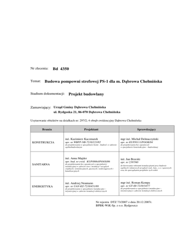 Nr zlecenia: Temat: Bd 4350 Budowa pompowni strefowej PS-1 dla m. Dąbrowa Chełmińska Stadium dokumentacji: Projekt budowlany Zamawiający: Urząd Gminy Dąbrowa Chełmińska ul. Bydgoska 21, 86-070 Dąbrowa Chełmińska Usytuowanie obiektów na działkach nr: 297/2; 4 obręb ewidencyjny Dąbrowa Chełmińska Branża KONSTRUKCJA Projektant inż. Kazimierz Kaczmarek mgr inż. Michał Delmaczyński upr. nr WBPP-NB-7210/123/82 upr. nr KUP/0111/POOK/04 do projektowania w specjalności kontr. -budowl. w zakresie ogólnobudowlanym do projektowania bez ograniczeń w specjalności konstrukcyjno – budowlanej inż. Anna Majder upr. bud. nr ewid. KUP/0064/POOS/06 SANITARNA ENERGETYKA Sprawdzający do projektowania bez ograniczeń w specjalności instalacyjnej w zakresie sieci, instalacji i urządzeń cieplnych, wentylacyjnych, gazowych, wodociągowych i kanalizacyjnych inż. Jan Brzeski upr. nr 2397/60 do kierowania robotami instalacyjnymi przy budowie ogólnych i domowych urządzeń wod., kan., c.o. i gazowych oraz do sporządzania projektów tych robót inż. Andrzej Neumann mgr inż. Roman Kempa upr. nr UAN-KZ-7210/451/88 upr. nr GT-III-7210/14/77 do projektowania w specjalności instalacyjno – inżynieryjnej w zakresie instalacji elektrycznych do projektowania w specjalności instalacyjno – inżynieryjnej w zakresie instalacji elektrycznych Nr rejestru DTZ 73/2007 z dnia 20.12.2007r. BPBK-WiK-Sp. z o.o. Bydgoszcz