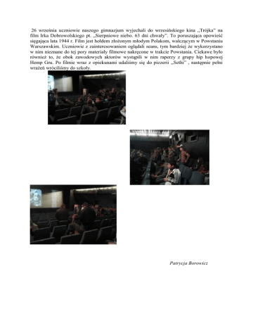 26 września uczniowie naszego gimnazjum wyjechali do wrzesińskiego kina „Trójka” na film Irka Dobrowolskiego pt. „Sierpniowe niebo. 63 dni chwały”. To poruszająca opowieść sięgająca lata 1944 r. Film jest hołdem złożonym młodym Polakom, walczącym w Powstaniu Warszawskim. Uczniowie z zainteresowaniem oglądali seans, tym bardziej że wykorzystano w nim nieznane do tej pory materiały filmowe nakręcone w trakcie Powstania. Ciekawe było również to, że obok zawodowych aktorów wystąpili w nim raperzy z grupy hip hopowej Hemp Gru. Po filmie wraz z opiekunami udaliśmy się do pizzerii ,,Sethi” , następnie pełni wrażeń wróciliśmy do szkoły. Patrycja Borowicz