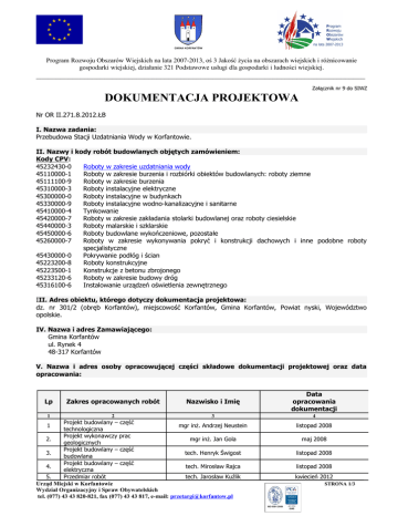 Program Rozwoju Obszarów Wiejskich na lata 2007-2013, oś 3 Jakość życia na obszarach wiejskich i różnicowanie gospodarki wiejskiej, działanie 321 Podstawowe usługi dla gospodarki i ludności wiejskiej. __________________________________________________________________________________ Załącznik nr 9 do SIWZ DOKUMENTACJA PROJEKTOWA Nr OR II.271.8.2012.ŁB I. Nazwa zadania: Przebudowa Stacji Uzdatniania Wody w Korfantowie. II. Nazwy i kody robót budowlanych objętych zamówieniem: Kody CPV: 45232430-0 Roboty w zakresie uzdatniania wody 45110000-1 Roboty w zakresie burzenia i rozbiórki obiektów budowlanych: roboty ziemne 45111100-9 Roboty w zakresie burzenia 45310000-3 Roboty instalacyjne elektryczne 45300000-0 Roboty instalacyjne w budynkach 45330000-9 Roboty instalacyjne wodno-kanalizacyjne i sanitarne 45410000-4 Tynkowanie 45420000-7 Roboty w zakresie zakładania stolarki budowlanej oraz roboty ciesielskie 45440000-3 Roboty malarskie i szklarskie 45450000-6 Roboty budowlane wykończeniowe, pozostałe 45260000-7 Roboty w zakresie wykonywania pokryć i konstrukcji dachowych i inne podobne roboty specjalistyczne 45430000-0 Pokrywanie podłóg i ścian 45223200-8 Roboty konstrukcyjne 45223500-1 Konstrukcje z betonu zbrojonego 45233120-6 Roboty w zakresie budowy dróg 45316100-6 Instalowanie urządzeń oświetlenia zewnętrznego III. Adres obiektu, którego dotyczy dokumentacja projektowa: dz. nr 301/2 (obręb Korfantów), miejscowość Korfantów, Gmina Korfantów, Powiat nyski, Województwo opolskie. IV. Nazwa i adres Zamawiającego: Gmina Korfantów ul. Rynek 4 48-317 Korfantów V. Nazwa i adres osoby opracowującej części składowe dokumentacji projektowej oraz data opracowania: Lp Zakres opracowanych robót Nazwisko i Imię Data opracowania dokumentacji 1 2 3 4 Projekt budowlany – część 1 mgr inż. Andrzej Neustein listopad 2008 technologiczna Projekt wykonawczy prac 2. mgr inż. Jan Gola maj 2008 geologicznych Projekt budowlany – część 3. tech. Henryk Świgost listopad 2008 budowlana Projekt budowlany – część 4. tech. Mirosław Rajca listopad 2008 elektryczna 5. Przedmiar robót tech. Jarosław Kuźlik kwiecień 2012 __________________________________________________________________________________________________ Urząd Miejski w Korfantowie STRONA 1/3 Wydział Organizacyjny i Spraw Obywatelskich tel. (077) 43 43 820-821, fax (077) 43 43 817, e-mail: [email protected] Program Rozwoju Obszarów Wiejskich na lata 2007-2013, oś 3 Jakość życia na obszarach wiejskich i różnicowanie gospodarki wiejskiej, działanie 321 Podstawowe usługi dla gospodarki i ludności wiejskiej. __________________________________________________________________________________ VI. Informacje dodatkowe: W zakres szczegółowy zamówienia wchodzi: Przebudowa istniejącej Stacji Uzdatniania Wody w Korfantowie (dz. nr 301/2 ), obejmująca m.in.: − wymianę wszystkich urządzeń technologicznych wraz z armaturą i orurowaniem, − wymianę zasilania energetycznego m.in. szafy, okablowania, − roboty modernizacyjne ogólnobudowlane budynku stacji m.in. ocieplenie dachu i elewacji, murowanie ścianek wewnętrznych, wymiana stolarki okiennej, drzwiowej, bram wjazdowych, wymiana posadzek, − zagospodarowanie terenu m.in. wymiana ogrodzenia, wykonanie oświetlenia wewnętrznego, przebudowa ciągów komunikacyjnych. − obsługa geodezyjna wraz z pomiarem geodezyjnym powykonawczym. Szczegółowy zakres robót budowlanych określają przedmiar robót, dokumentacja projektowa i specyfikacje techniczne wykonania i odbioru robót budowlanych. Zadanie objęte jest pomocą Unii Europejskiej ze środków Europejskiego Funduszu Rolnego na rzecz Rozwoju Obszarów Wiejskich w ramach działania 321 Podstawowe Usługi dla Gospodarki i Ludności Wiejskiej Programu Rozwoju Obszarów Wiejskich na lata 2007-2013 Materiały i urządzenia powinny odpowiadać co do jakości wymogom wyrobów dopuszczonych do obrotu i stosowania w budownictwie, określonych w art. 10 ustawy Prawo Budowlane, wymaganiom specyfikacji technicznej. Zakres prac ujęto w załączonym przedmiarze robót. Szczegółowy zakres robót budowlanych określają przedmiar robót, dokumentacja budowlana i specyfikacja wykonania i odbioru robót budowlanych. Oryginalny projekt budowlany dostępny do wglądu w siedzibie Zamawiającego w godzinach urzędowania. VII.Zawartość dokumentacji projektowej obejmuje: 1. Kserokopia fragmentu dokumentacji budowlanej* dotyczącej wykonania przebudowy stacji uzdatniani wody w Korfantowie. Branża architektoniczno-budowlana: a) opis techniczny zawierający m.in. informację dotycząca bezpieczeństwa i ochrony zdrowia, b) pozwolenia, uzgodnienia, warunki techniczne, decyzje itp. c) Plan terenu stacji wodociągowej, d) Plan orientacyjny lokalizacji SUW, e) Inwentaryzacja elewacji i rzutu dachu, f) Rzut przyziemia i przekroje, g) Elewacje, rzut dachu, h) cześć technologiczna – inwentaryzacja i) część technologiczno-elektryczna j) elektryczny schemat zasilania SUW k) schemat zasadniczy rozdzielni RG l) schemat wyprowadzenia obwodów Branża technologiczna: a) opis techniczny wykonania prac technologicznych, b) mapa poglądowa, c) mapa uzbrojenia terenu, d) rzut przyziemia części technologicznej, e) inwentaryzacja części technologicznej, __________________________________________________________________________________________________ Urząd Miejski w Korfantowie Wydział Organizacyjny i Spraw Obywatelskich tel. (077) 43 43 820-821, fax (077) 43 43 817, e-mail: [email protected] STRONA 2/3 Program Rozwoju Obszarów Wiejskich na lata 2007-2013, oś 3 Jakość życia na obszarach wiejskich i różnicowanie gospodarki wiejskiej, działanie 321 Podstawowe usługi dla gospodarki i ludności wiejskiej. __________________________________________________________________________________ f) projekt technologiczny wykonawczy, g) schemat technologiczny SUW, Branża elektryczna: a) opis techniczny wykonani