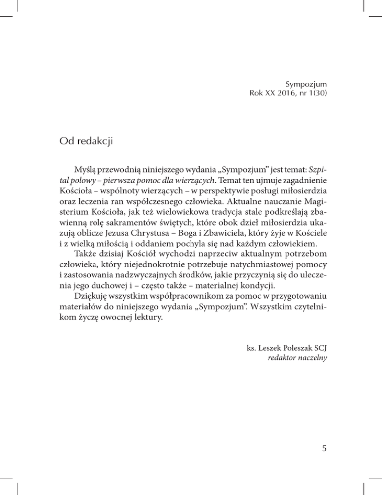 Sympozjum Rok XX 2016, nr 1(30) Od redakcji Myślą przewodnią niniejszego wydania „Sympozjum” jest temat: Szpital polowy – pierwsza pomoc dla wierzących. Temat ten ujmuje zagadnienie Kościoła – wspólnoty wierzących – w perspektywie posługi miłosierdzia oraz leczenia ran współczesnego człowieka. Aktualne nauczanie Magisterium Kościoła, jak też wielowiekowa tradycja stale podkreślają zbawienną rolę sakramentów świętych, które obok dzieł miłosierdzia ukazują oblicze Jezusa Chrystusa – Boga i Zbawiciela, który żyje w Kościele i z wielką miłością i oddaniem pochyla się nad każdym człowiekiem. Także dzisiaj Kościół wychodzi naprzeciw aktualnym potrzebom człowieka, który niejednokrotnie potrzebuje natychmiastowej pomocy i zastosowania nadzwyczajnych środków, jakie przyczynią się do uleczenia jego duchowej i – często także – materialnej kondycji. Dziękuję wszystkim współpracownikom za pomoc w przygotowaniu materiałów do niniejszego wydania „Sympozjum”. Wszystkim czytelnikom życzę owocnej lektury. ks. Leszek Poleszak SCJ redaktor naczelny 5