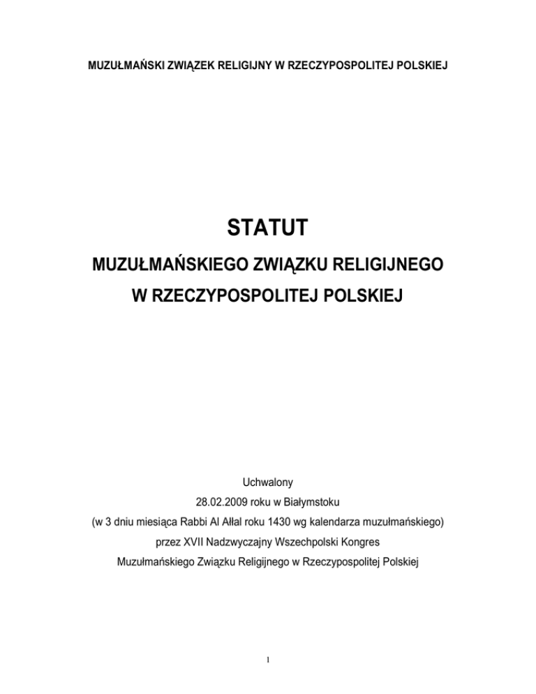MUZUŁMAŃSKI ZWIĄZEK RELIGIJNY W RZECZYPOSPOLITEJ POLSKIEJ STATUT MUZUŁMAŃSKIEGO ZWIĄZKU RELIGIJNEGO W RZECZYPOSPOLITEJ POLSKIEJ Uchwalony 28.02.2009 roku w Białymstoku (w 3 dniu miesiąca Rabbi Al Ałłal roku 1430 wg kalendarza muzułmańskiego) przez XVII Nadzwyczajny Wszechpolski Kongres Muzułmańskiego Związku Religijnego w Rzeczypospolitej Polskiej 1 W imię Boga Miłościwego, Miłosiernego, Litościwego. O Boże Przenajświętszy Wielkiego Miłosierdzia! Dołącz nas do tych, których prowadzisz, i prowadź właściwą drogą. O Boże Wszechmogący! Obdarz nas najcenniejszym zdrowiem oraz Łaską Bożą, jak obdarzasz swoje sługi, które są Ci wierne. Osądź nas w Dzień Sądu Ostatecznego, zgodnie ze swoim uznaniem, gdyż jedynie Ty, Boże, jesteś Jedynym Sędzią. Niech będzie chwała Bogu Jedynemu. 2 I. POSTANOWIENIA OGÓLNE §1 1. Muzułmański Związek Religijny w Rzeczypospolitej Polskiej, zwany dalej MZR, działa nieprzerwanie od 28 grudnia 1925 r. na podstawie 600-letniej tradycji istnienia islamu w Polsce. 2. Obszarem działania MZR jest Rzeczypospolita Polska. MZR może działać poza granicami Rzeczypospolitej Polskiej, z zachowaniem obowiązujących w tym zakresie przepisów. 3. Siedzibą władz naczelnych MZR jest Białystok. 4. MZR rządzi się przepisami swego wyznania, postanowieniami niniejszego Statutu oraz obowiązującym prawem państwowym. 5. Statut MZR przesyłany jest do wiadomości ministra, właściwego do spraw wyznań religijnych. 6. Podstawą przepisów religijnych jest Koran i Sunna. 7. MZR posiada własną wewnętrzną strukturę organizacyjną oraz samodzielny samorząd, który jest niezależny od jakichkolwiek władz państwowych, krajowych i zagranicznych. 8. MZR ma prawo powoływać i rozwiązywać gminy wyznania muzułmańskiego. 9. MZR może używać znaku, odznak i pieczęci, według wzorów zatwierdzonych przez Kongres MZR. 10. MZR prowadzi działalność wydawniczą oraz może posiadać własny organ prasowy, radiowy, telewizyjny oraz domenę internetową. 11. Członkiem MZR może być każdy obywatel RP, który wyznaje islam, oraz każdy muzułmanin, który posiada kartę stałego pobytu w Rzeczpospolitej Polskiej. 12. MZR może sprawować opiekę religijną nad obcokrajowcami wyznania muzułmańskiego, którzy czasowo przebywają w Rzeczypospolitej Polskiej. 13. MZR może prowadzić działalność gospodarczą, charytatywną, może powoływać fundacje, szkoły, centra kultury, domy opieki społecznej. 3 14. MZR może przyjmować między innymi subwencje, spadki, dotacje, darowizny krajowe i zagraniczne. 15. Przynależność do gminy muzułmańskiej, członek MZR określa poprzez złożenie deklaracji woli do zarządu tylko jednej gminy muzułmańskiej, zgodnie z podziałem administracyjnym kraju, dokonanym przez Kongres MZR. II. CELE I SPOSÓB ICH REALIZACJI §2 Muzułmański Związek Religijny dąży do realizacji następujących celów: a) Reprezentowanie interesów członków MZR wobec władz państwowych, samorządowych oraz organizacji pozarządowych. b) Reprezentowanie polskich wyznawców islamu wobec muzułmańskich ośrodków zagranicznych. c) Szerzenie idei islamu, naukę i utrwalanie zasad religii islamu. d) Pogłębianie wiedzy o nauce, kulturze i sztuce muzułmańskiej. e) Sprawowanie pieczy nad istniejącymi meczetami, centrami kultury, domami religijnymi i cmentarzami, które wraz z nieruchomościami gmin muzułmańskich stanowią nierozłączną całość, zwaną wakufem. f) Podejmowanie niezbędnych działań w zakresie budowy nowych obiektów religijnych, kulturalnych, oświatowych i wychowawczych i przygotowanie kadry do ich prowadzenia. g) Udzielanie pomocy członkom MZR oraz osobom ubogim i potrzebującym. §3 1. Realizacja celów stawianych Muzułmańskiemu Związkowi Religijnemu następuje poprzez: a) organizowanie wspólnych modlitw oraz udzielanie posług religijnych, b) naukę religii, c) czuwanie nad przestrzeganiem zasad zawartych w Koranie i wymogów szariatu, 4 d) organizowanie obchodów świąt muzułmańskich i innych ważniejszych wydarzeń związanych z islamem, e) organizowanie pielgrzymek do miejsc świętych, f) organizowanie kursów, obozów, odczytów seminariów, spotkań autorskich, wystaw, ekspozycji muzealnych, g) współudział w przygotowywaniu audycji radiowych, telewizyjnych oraz publikacji prasowych, internetowych i multimedialnych, h) prowadzenie działalności charytatywno-opiekuńczej, i) prowadzenie działalności oświatowo-wychowawczej, j) prowadzenie działalności wydawniczej, k) prowadzenie działalności gospodarczej, l) zakładanie spółek, fundacji, stowarzyszeń oraz innych organizacji, m) prowadzenie działań inwestycyjnych i remontowych, n) ochrona tożsamości, kultury i dziedzictwa Tatarów - muzułmanów polskich, o) prowadzenie działalności kulturalnej, p) prowadzenie działalności artystycznej. 2. W trakcie realizacji celów statutowych MZR może: a) zwracać się o pomoc do organizacji pozarządowych oraz organów administracji rządowej i samorządowej. b) nawiązywać kontakty i współdziałać z zagranicznymi ośrodkami wyznania muzułmańskiego. c) prowadzić publiczne zbiórki środków finansowych oraz wnioskować o dotacje z Unii Europejskiej i innych krajów. III. CZŁONKOWIE MZR, ICH PRAWA I OBOWIĄZKI §4 1. Członkiem zwyczajnym MZR może zostać osoba prawna, respektująca zasady działania i cele MZR oraz pełnoletnia osoba fizyczna, spełniająca warunki określone w § 1 pkt. 11. 5 2. Osoba wyznania muzułmańskiego, zrodzona z obojga lub jednego z rodziców tego wyznania, jeśli jest wychowywana w islamie, po osiągnięciu 18 roku życia składa deklarację przynależności do gminy muzułmańskiej w miejscu zamieszkania lub na terenie działania tejże gminy i staje się zwyczajnym członkiem MZR bez konieczności dokonania jakichkolwiek czynności związanych z przystąpieniem do MZR. Zarząd gminy obowiązany jest dokonać wpisania ta