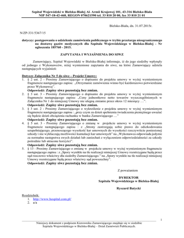 Szpital Wojewódzki w Bielsku-Białej Al. Armii Krajowej 101, 43-316 Bielsko-Biała NIP 547-18-42-468, REGON 070621590 tel. 33 810 20 00, fax 33 810 21 01 Bielsko-Biała, dn. 31.07.2015r. N/ZP-331/5367/15 dotyczy: postępowania o udzielenie zamówienia publicznego w trybie przetargu nieograniczonego na dostawę gazów medycznych dla Szpitala Wojewódzkiego w Bielsku-Białej - Nr ogłoszenia 185760 - 2015. ZAPYTANIA I WYJAŚNIENIA DO SIWZ Zamawiający, Szpital Wojewódzki w Bielsku-Białej informuje, iż do jego siedziby wpłynęły od jednego z Wykonawców, niżej wymienione zapytania do siwz, na które Zamawiający udziela następujących wyjaśnień: Dotyczy Załącznika Nr 5 do siwz – Projekt Umowy: 1. § 2 ust. 2 - Prosimy Zamawiającego o dopisanie do projektu umowy w wyżej wymienionym fragmencie następującego zapisu: „Otrzymanie zamówienia winno być każdorazowo potwierdzane przez Wykonawcę”. Odpowiedź: Zapisy siwz pozostają bez zmian. 2. § 3 ust. 3 - Prosimy Zamawiającego o dopisanie do projektu umowy w wyżej wymienionym fragmencie następującego zapisu: „Ceny jednostkowe netto towarów wyszczególnionych w Załączniku Nr 1 do niniejszej Umowy nie ulegną zmianie przez okres 12 miesięcy …”. Odpowiedź: Zapisy siwz pozostają bez zmian. 3. § 3 ust. 2 - Prosimy Zamawiającego o wykreślenie z projektu umowy w wyżej wymienionym fragmencie następującego zapisu : „przy czym za dzień spełnienia świadczenia pieniężnego uważać się będzie dzień obciążenia rachunku w banku Zamawiającego …” Odpowiedź: Zapisy siwz pozostają bez zmian. 4. § 5 ust. 3 - Prosimy Zamawiającego o zmianę w projekcie umowy w wyżej wymienionym fragmencie następującego zapisu : z „Strony zastrzegają sobie prawo do odszkodowania uzupełniającego, przenoszącego wysokość kar umownych do wysokości rzeczywiście poniesionej szkody i nie wykluczają możliwości kumulacji kar umownych” na „Wykonawca odpowiada jedynie za normalne następstwa swych działań lub zaniechań z wyłączeniem odpowiedzialności za szkody pośrednie lub utracone korzyści”. Odpowiedź: Zapisy siwz pozostają bez zmian. 5. § 13 - Prosimy Zamawiającego o zmianę w projekcie umowy w wyżej wymienionym fragmencie następującego zapisu : z „Spory wynikłe na tle realizacji niniejszej Umowy rozstrzygane będą przez sąd rzeczowo właściwy dla siedziby Zamawiającego.” na „Spory wynikłe na tle realizacji niniejszej Umowy rozstrzygane będą przez właściwy sąd powszechny”. Odpowiedź: Zapisy siwz pozostają bez zmian. Z poważaniem DYREKTOR Szpitala Wojewódzkiego w Bielsku-Białej Ryszard Batycki Rozdzielnik: 1. http://www.hospital.com.pl/ 2. a/a _______________________________________________________________________________________ Niniejszy dokument z podpisem Kierownika Zamawiającego znajduje się w siedzibie Szpitala Wojewódzkiego w Bielsku-Białej – Dział Zamówień Publicznych. 1