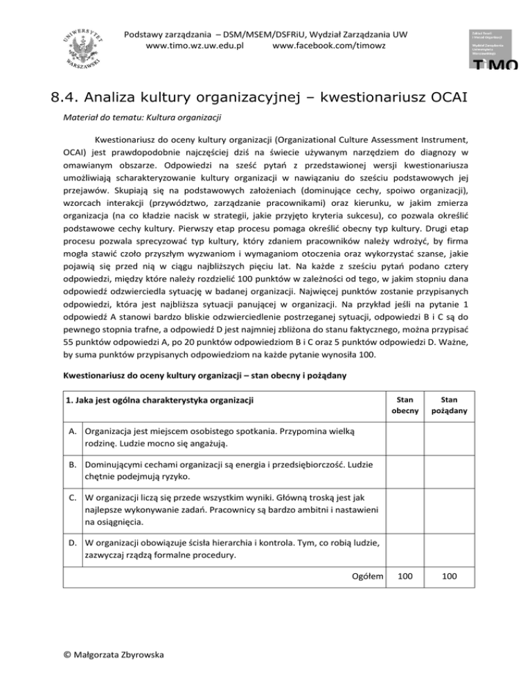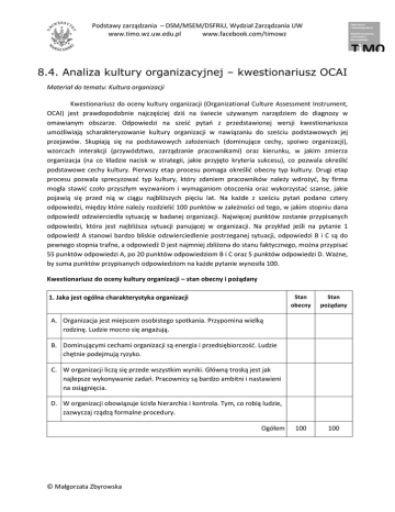 Podstawy zarządzania – DSM/MSEM/DSFRiU, Wydział Zarządzania UW www.timo.wz.uw.edu.pl www.facebook.com/timowz 8.4. Analiza kultury organizacyjnej – kwestionariusz OCAI Materiał do tematu: Kultura organizacji Kwestionariusz do oceny kultury organizacji (Organizational Culture Assessment Instrument, OCAI) jest prawdopodobnie najczęściej dziś na świecie używanym narzędziem do diagnozy w omawianym obszarze. Odpowiedzi na sześć pytań z przedstawionej wersji kwestionariusza umożliwiają scharakteryzowanie kultury organizacji w nawiązaniu do sześciu podstawowych jej przejawów. Skupiają się na podstawowych założeniach (dominujące cechy, spoiwo organizacji), wzorcach interakcji (przywództwo, zarządzanie pracownikami) oraz kierunku, w jakim zmierza organizacja (na co kładzie nacisk w strategii, jakie przyjęto kryteria sukcesu), co pozwala określić podstawowe cechy kultury. Pierwszy etap procesu pomaga określić obecny typ kultury. Drugi etap procesu pozwala sprecyzować typ kultury, który zdaniem pracowników należy wdrożyć, by firma mogła stawić czoło przyszłym wyzwaniom i wymaganiom otoczenia oraz wykorzystać szanse, jakie pojawią się przed nią w ciągu najbliższych pięciu lat. Na każde z sześciu pytań podano cztery odpowiedzi, między które należy rozdzielić 100 punktów w zależności od tego, w jakim stopniu dana odpowiedź odzwierciedla sytuację w badanej organizacji. Najwięcej punktów zostanie przypisanych odpowiedzi, która jest najbliższa sytuacji panującej w organizacji. Na przykład jeśli na pytanie 1 odpowiedź A stanowi bardzo bliskie odzwierciedlenie postrzeganej sytuacji, odpowiedzi B i C są do pewnego stopnia trafne, a odpowiedź D jest najmniej zbliżona do stanu faktycznego, można przypisać 55 punktów odpowiedzi A, po 20 punktów odpowiedziom B i C oraz 5 punktów odpowiedzi D. Ważne, by suma punktów przypisanych odpowiedziom na każde pytanie wynosiła 100. Kwestionariusz do oceny kultury organizacji – stan obecny i pożądany 1. Jaka jest ogólna charakterystyka organizacji Stan obecny Stan pożądany 100 100 A. Organizacja jest miejscem osobistego spotkania. Przypomina wielką rodzinę. Ludzie mocno się angażują. B. Dominującymi cechami organizacji są energia i przedsiębiorczość. Ludzie chętnie podejmują ryzyko. C. W organizacji liczą się przede wszystkim wyniki. Główną troską jest jak najlepsze wykonywanie zadań. Pracownicy są bardzo ambitni i nastawieni na osiągnięcia. D. W organizacji obowiązuje ścisła hierarchia i kontrola. Tym, co robią ludzie, zazwyczaj rządzą formalne procedury. Ogółem © Małgorzata Zbyrowska Podstawy zarządzania – DSM/MSEM/DSFRiU, Wydział Zarządzania UW www.timo.wz.uw.edu.pl www.facebook.com/timowz 2. Jaki jest styl przywództwa w organizacji Stan obecny Stan pożądany 100 100 Stan obecny Stan pożądany 100 100 Stan obecny Stan pożądany 100 100 A. Przywództwo w organizacji powszechnie utożsamia się ze służeniem radą i pomocą oraz roztaczaniem opieki. B. Przywództwo w organizacji powszechnie utożsamia się z przedsiębiorczością, nowatorstwem i podejmowaniem ryzyka. C. Przywództwo w organizacji powszechnie utożsamia się ze stanowczością, ekspansywnością, orientacją na wyniki. D. Przywództwo w organizacji powszechnie utożsamia się z koordynowaniem, sprawnym organizowaniem, stwarzaniem harmonijnych warunków do osiągania dobrych wyników. Ogółem 3. Jaki jest styl zarządzania pracownikami A. W organizacji preferuje się pracę zespołową, dąży do powszechnej zgody i uczestnictwa. B. W organizacji preferuje się samodzielne podejmowanie ryzyka, innowacyjność, swobodę i oryginalność. C. W organizacji preferuje się ostrą rywalizację, stawiane są wysokie wymagania i liczą się przede wszystkim osiągnięcia. D. W organizacji preferuje się bezpieczeństwo zatrudnienia, podporządkowanie, przewidywalność i niezmienność stosunków. Ogółem 4. Co zapewnia spójność organizacji A. Spójność organizacji jest zapewniona przez lojalność i wzajemne zaufanie. Wysoko ceni się zaangażowanie w sprawy organizacji. B. Spójność organizacji jest zapewniona przez zaangażowanie w innowacje i rozwój. Kładzie się nacisk na szukanie nowych dróg. C. Spójność organizacji jest zapewniona przez nacisk na wyniki i osiąganie celów. Powszechnymi motywami działania są ekspansywność i chęć zwyciężania. D. Spójność organizacji jest zapewniona przez formalne zasady i regulaminy. Najważniejsze jest sprawne funkcjonowanie. Ogółem © Małgorzata Zbyrowska Podstawy zarządzania – DSM/MSEM/DSFRiU, Wydział Zarządzania UW www.timo.wz.uw.edu.pl www.facebook.com/timowz 5. Na co kładzie się największy nacisk Stan obecny Stan pożądany 100 100 Stan obecny Stan pożądany 100 100 A. W organizacji kładzie się nacisk na rozwój osobisty. Obserwuje się duże zaufanie, otwartość i współuczestnictwo. B. W organizacji kładzie się nacisk na zdobywanie nowych zasobów i podejmowanie nowych wyzwań. Ceni się szukanie nowatorskich rozwiązań i możliwości. C. W organizacji kładzie się nacisk na działania konkurencyjne i wyniki. Liczy się osiąganie ambitnych celów i zwyciężanie na rynku. D. W organizacji kładzie się nacisk na trwałość i niezmienność. Ważne są sprawność, kontrola i praca bez zakłóceń. Ogółem 6. Jakie są kryteria sukcesu w organizacji A. Za miarę sukcesu uważa się rozwój zasobów ludzkich, pracę zespołową, zaangażowanie pracowników i troskę o ludzi. B. Za miarę sukcesu uważa się wytwarzanie najbardziej oryginalnych i nowatorskich produktów oraz osiągnięcie pozycji lidera w dziedzinie innowacyjności. C. Za miarę sukcesu uważa się wygraną na rynku i pokonywanie konkurentów. Najważniejsze jest osiągnięcie pozycji lidera na rynku. D. Za miarę sukcesu uważa się sprawność działania. Najważniejsze są: pewność dostaw, dotrzymywanie harmonogramów i 
