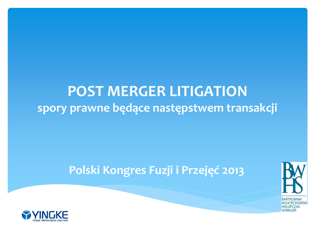POST MERGER LITIGATION spory prawne będące następstwem transakcji Polski Kongres Fuzji i Przejęć 2013 Spory prawne będące następstwem transakcji I. Spory dotyczące bezpośrednio transakcji M&A II. Spory będące dalszą konsekwencją transakcji oraz połączenia/podziału spółek III. Sukcesja w zakresie toczących się sporów I. Spory dotyczące bezpośrednio transakcji M&A Uchylenie się od skutków prawnych transakcji Spory dotyczące przejęcia kontroli nad spółką Spory z akcjonariuszami mniejszościowymi w ramach relacji korporacyjnych Spór z regulatorem co do warunków połączenia Spór dotyczący wynagrodzenia transakcyjnego uzależnionego od spełnienia określonych warunków II. Spory będące konsekwencją połączenia/podziału spółek Spory pracownicze (spory zbiorowe, zwolnienia grupowe) Spory z agentami handlowymi (świadczenie wyrównawcze) Spory z b. członkami zarządu Spory z kontrahentami (ustalenie istnienia oraz zakresu umów, rozwiązanie umów) III. Wejście w toczące się już spory Sukcesja materialna a formalna przy ograniczonym następstwie prawnym II CSK 280/08, V CSK 410/08, I Cz 7/09 – przy podziale przez wydzielenie w trybie art. 529 § 1 pkt 4 KSH, nowopowstała jednostka wstępuje do procesu w trybie art. 192 pkt 3 KPC (za zgodą drugiej strony) II CSK 356/11 z 25.04.2012r. – art. 192 pkt 3 nie stosuje się Kto ma dalej prowadzić sprawy? Rozłożenie ryzyka związanego z odpowiedzialnością za wynik sprawy – ewentualny regres Case study. Caveat emptor? Błąd co do cech akcji przy SPA – sprawa spółki P. W związku z zawarciem warunkowej SPA dotyczącej akcji spółki P., kupujący wpłacił sprzedającemu zadatek tytułem ceny akcji; W trakcie uprzedniego badania due dilligence nie poinformowano nabywcy o fakcie, że część historycznych umów zawartych w trybie przetargowym z jednym z kontrahentów (nie objętych bezpośrednio zakresem zapytań audytowych) została zabezpieczona przez CBŚ; 3 dni po wpłacie zadatku aresztowano kilku pracowników oraz dwóch członków zarządu P (zarzuty wyłudzenia środków unijnych), o czym kilku dniach poinformowały media; W rezultacie kupujący złożył sprzedającemu oświadczenie o uchyleniu się od skutków prawnych SPA, powołując się na błąd co do przedmiotu sprzedaży (fałszywe wyobrażenie o cechach nabywanych akcji), i wystąpił z powództwem o zwrot zadatku Błąd co do cech nabywanych akcji – orzeczenia SO i SA SO uwzględnił powództwo, uznając iż powód działał pod wpływem błędu (art. 84 KC) SA utrzymał wyrok, wskazując, iż: błąd polegał na fałszywym wyobrażeniu o cechach nabywanych akcji, związanych z renomą i prawną stabilnością spółki P.; Powód dokonał inwestycji w przeświadczeniu, że są to akcje spółki posiadającej konkretne cechy: ugruntowaną i niezagrożoną sytuację na rynku i wypracowaną renomę, pozwalające także w przyszłości na uzyskiwanie korzystnych kontraktów i osiąganie zysków; Sytuacja prawno-finansowa spółki P. była istotnym elementem umowy, o czym świadczył o tym m.in. zapis, gdzie kupujący zapewniał sprzedającego że sytuacja ta jest mu znana i nie będzie zgłaszał roszczeń, chyba że do dnia przeniesienia własności akcji zaistnieją zdarzenia, których efektem będzie jej pogorszenie Zarzuty skargi kasacyjnej kupujący akcje spółki, który nie przeprowadził pełnego due, nie może uchylić się następnie od skutków SPA wskutek ujawnienia nieznanych mu okoliczności, związanych z sytuacją ekonomiczną lub prawną spółki, leżących poza zakresem prowadzonego przezeń badania; w takiej bowiem sytuacji, postawa kupującego – godzącego się z sytuacją braku pełnej wiedzy na temat stanu spraw spółki - wyłącza błąd. Kupujący się nie myli, ponieważ ma pełną świadomość swojej ignorancji. Wyrok SN 29.10.2010 r., I CSK 595/09 Nie jest tak, że fakt uprzedniego przeprowadzenia badania due diligence wyklucza możliwość powoływania się na błąd. Kupujący akcje nie ma ustawowego obowiązku przeprowadzenia tego badania. Przyjmując nawet, że na kupującego akcje nałożone są pewne pozaustawowe obowiązki uboczne do zbadania przedmiotu sprzedaży, to niepodobna zgodzić się z poglądem, iż nieujawnienie określonej wiedzy w wyniku badania due diligence pozbawia kupującego, z tej tylko przyczyny, skutecznego powołania się na błąd Zarzuty skargi kasacyjnej – cd. Naruszenie art. 84 KC polegające na zakwalifikowaniu: ocen powódki kupującej akcje spółki co do braku zagrożeń dla jej sytuacji rynkowej, oraz oczekiwań powódki, że pozycja rynkowa oraz renoma spółki, której akcje nabywała, pozwolą na uzyskiwanie w przyszłości korzystnych kontraktów i osiąganie zysków, jako błędu co do treści czynności prawnej w postaci zawarcia umowy sprzedaży akcji spółki Wyrok SN 29.10.2010 r., I CSK 595/09 - brak prawnie doniosłego błędu Nie ma podstaw do twierdzenia, że samo zajęcie w dokumentów spółki P. oraz toczące się postępowanie karne w stosunku do członków zarządu już w chwili zawarcia SPA skutkowało obniżeniem pozycji i renomy spółki P. To chwila zawarcia umowy jest zaś rozstrzygająca dla oceny, czy powód działał pod wpływem błędu. Późniejsze upublicznienie tych zdarzeń, które po tej dacie mogące wpłynąć na obniżenie pozycji i renomy spółki PRK, jest bez znaczenie prawnego. Wyrok SN 29.10.2010 r., I CSK 595/09 posiadanie pozycji rynkowej i renomy nie jest jednoznaczne z brakiem istnienia ryzyk prawnych, związanych z dotychczasową działalnością spółki; o braku takich ryzyk można byłoby w istocie mówić jedynie wówczas, gdyby powód nabywał akcje, czy udziały spółki, która nigdy żadnej działalności nie prowadziła; jedynie w takiej sytuacji powód byłby uprawniony zasadnie zakładać, że nabywana przezeń spółka jest wolna od ryzyk związanych z prowadzoną dotychczas działalnością (w po