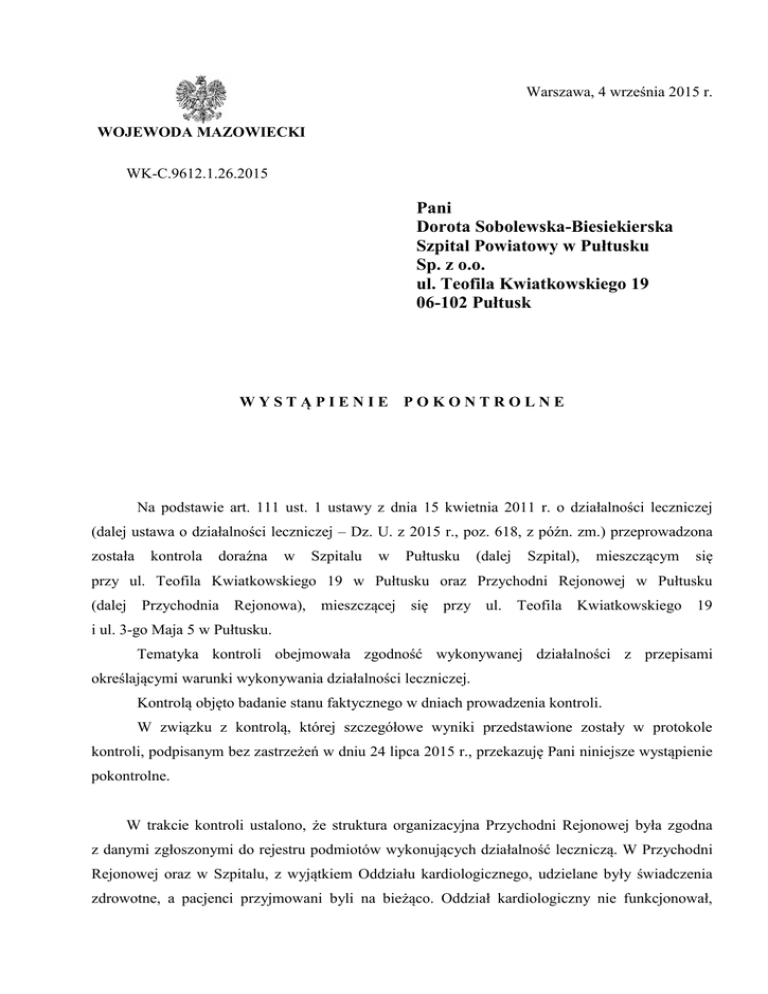 Warszawa, 4 września 2015 r. WOJEWODA MAZOWIECKI WK-C.9612.1.26.2015 Pani Dorota Sobolewska-Biesiekierska Szpital Powiatowy w Pułtusku Sp. z o.o. ul. Teofila Kwiatkowskiego 19 06-102 Pułtusk WYSTĄPIENIE POKONTROLNE Na podstawie art. 111 ust. 1 ustawy z dnia 15 kwietnia 2011 r. o działalności leczniczej (dalej ustawa o działalności leczniczej – Dz. U. z 2015 r., poz. 618, z późn. zm.) przeprowadzona została kontrola doraźna w Szpitalu w Pułtusku (dalej Szpital), mieszczącym się przy ul. Teofila Kwiatkowskiego 19 w Pułtusku oraz Przychodni Rejonowej w Pułtusku (dalej Przychodnia Rejonowa), mieszczącej się przy ul. Teofila Kwiatkowskiego 19 i ul. 3-go Maja 5 w Pułtusku. Tematyka kontroli obejmowała zgodność wykonywanej działalności z przepisami określającymi warunki wykonywania działalności leczniczej. Kontrolą objęto badanie stanu faktycznego w dniach prowadzenia kontroli. W związku z kontrolą, której szczegółowe wyniki przedstawione zostały w protokole kontroli, podpisanym bez zastrzeżeń w dniu 24 lipca 2015 r., przekazuję Pani niniejsze wystąpienie pokontrolne. W trakcie kontroli ustalono, że struktura organizacyjna Przychodni Rejonowej była zgodna z danymi zgłoszonymi do rejestru podmiotów wykonujących działalność leczniczą. W Przychodni Rejonowej oraz w Szpitalu, z wyjątkiem Oddziału kardiologicznego, udzielane były świadczenia zdrowotne, a pacjenci przyjmowani byli na bieżąco. Oddział kardiologiczny nie funkcjonował, a podmiot leczniczy prowadził negocjacje z NFZ w celu uzyskania kontraktu na procedury kardiologiczne. Podmiot posiadał umowę ubezpieczenia odpowiedzialności cywilnej, zgodnie z obowiązkiem ustalonym w art. 25 ust. 1 pkt 1 i ust. 2 ustawy o działalności leczniczej. W dokumentacji podmiotu zgromadzono dokumenty potwierdzające prawo wykonywania zawodu aktualnie zatrudnionej kadry lekarskiej, pielęgniarskiej oraz położnych. W Szpitalu oraz Przychodni Rejonowej umieszczono informację o prawach pacjenta, zgodnie z wymogiem określonym w art. 11 ust. 1 ustawy z dnia 6 listopada 2008 r. o prawach pacjenta i Rzeczniku Praw Pacjenta (Dz. U. z 2012 r., poz. 159, z późn. zm.). Dokumentacja medyczna przechowywana była zgodnie z normami ustalonymi w rozporządzeniu Ministra Zdrowia z dnia 21 grudnia 2010 r. w sprawie rodzajów i zakresu dokumentacji medycznej oraz sposobu jej przetwarzania (dalej rozporządzenie w sprawie rodzajów i zakresu dokumentacji medycznej – Dz. U. z 2014 r., poz. 177, z późn. zm.). Z analizy Księgi chorych Pododdziału chirurgii urazowo-ortopedycznej oraz Księgi zabiegów ortopedycznych wynika, że w Pododdziale przyjmowani byli pacjenci od 1 do 30 stycznia 2015 r., a następnie od 7 czerwca 2015 r. do dnia zakończenia kontroli. Od 7 czerwca 2015 r. opiekę lekarską w Pododdziale zapewniało 3 lekarzy specjalistów w dziedzinie ortopedii i traumatologii narządu ruchu. W wyniku kontroli stwierdzono następujące nieprawidłowości: 1. Niezaktualizowanie w Regulaminie organizacyjnym struktury organizacyjnej Szpitala i Przychodni Rejonowej. W Regulaminie został ujęty II Oddział chorób wewnętrznych o profilu kardiologicznym, który nie funkcjonował od 19 maja 2015 r., oraz komórki organizacyjne, które zakończyły działalność 6 lipca 2015 r., tj. poradnie: okulistyczna, chirurgii urazowoortopedycznej dla dzieci, promocji zdrowia, chirurgii naczyniowej, leczenia bólu, preluksacyjna, nefrologiczna, chirurgii dziecięcej oraz Zespół długoterminowej opieki domowej, Dział diagnostyki laboratoryjnej, Pracownia bakteriologii, Pracownia kolposkopii, Dyspozytornia medyczna, Miejsce wyczekiwania zespołu P, Zespół wyjazdowy wypadkowy ,,W” – Podstawowy, Zespół wyjazdowy reanimacyjny ,,R” – Specjalistyczny. Takim działaniem naruszony został art. 24 ust. 1 pkt 3 ustawy o działalności leczniczej. 2. Nieprowadzenie Księgi zabiegów dla gabinetów diagnostyczno-zabiegowych funkcjonujących w ramach Poradni urologicznej, Poradni onkologicznej oraz oddziałów: anestezjologii i intensywnej terapii, pediatrii i chorób wewnętrznych. Takie działanie jest niezgodne z § 40 pkt 3 lit. d oraz § 12 pkt 2 lit. g rozporządzenia w sprawie rodzajów i zakresu dokumentacji medycznej. 2 3. Nieprawidłowe prowadzenie indywidualnej i zbiorczej dokumentacji medycznej – zakres nieprawidłowości został szczegółowo ustalony w załączniku Nr 3 do protokołu kontroli, znak WK-C.9612.1.26.2015. Przedstawiając powyższe ustalenia, zobowiązuję Panią do podjęcia działań w celu wyeliminowania stwierdzonych w trakcie kontroli nieprawidłowości, a w szczególności do: 1. Zaktualizowania w Regulaminie organizacyjnym podmiotu leczniczego informacji, o których mowa w punkcie 1. niniejszego wystąpienia. 2. Prowadzenia dokumentacji medycznej w szczegółowości ustalonej w przepisach rozporządzenia w sprawie rodzajów i zakresu dokumentacji medycznej. W podmiocie należy prowadzić Księgi zabiegów gabinetów diagnostyczno-zabiegowych funkcjonujących w ramach poradni urologicznej i onkologicznej oraz oddziałów: anestezjologii i intensywnej terapii, pediatrii i chorób wewnętrznych. Jednocześnie pragnę zwrócić uwagę Pani na konieczność zaktualizowania struktury organizacyjnej przedsiębiorstwa podmiotu leczniczego pn. Szpital w Pułtusku zgłoszonej do rejestru podmiotów wykonujących działalność leczniczą w zakresie Oddziału kardiologicznego (w przypadku niezawarcia umowy z NFZ o udzielanie świadczeń opieki zdrowotnej w ww. oddziale). W Szpitalu w Pułtusku nie funkcjonował Oddział kardiologiczny (jak wyżej wskazano prowadzone były negocjacje z NFZ o udzielenie kontraktu), co nie zostało zgłoszone do organu prowadzącego rejestr. Takim działaniem naruszony został art. 107 ust. 1 ustawy o działalności leczniczej. Zgodnie z art. 107 ust. 2 ustawy o działalności leczniczej, w przypadku niezgłoszenia zmiany danych objętych rejestrem w terminie 1