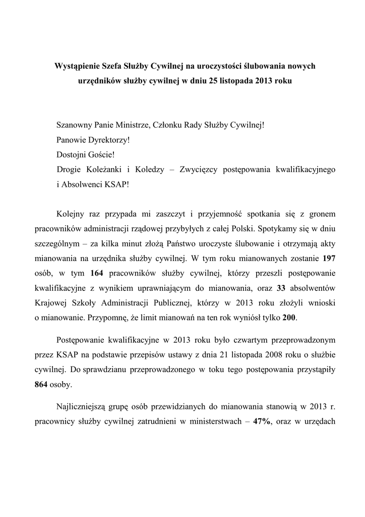 Wystąpienie Szefa Służby Cywilnej na uroczystości ślubowania nowych urzędników służby cywilnej w dniu 25 listopada 2013 roku Szanowny Panie Ministrze, Członku Rady Służby Cywilnej! Panowie Dyrektorzy! Dostojni Goście! Drogie Koleżanki i Koledzy – Zwycięzcy postępowania kwalifikacyjnego i Absolwenci KSAP! Kolejny raz przypada mi zaszczyt i przyjemność spotkania się z gronem pracowników administracji rządowej przybyłych z całej Polski. Spotykamy się w dniu szczególnym – za kilka minut złożą Państwo uroczyste ślubowanie i otrzymają akty mianowania na urzędnika służby cywilnej. W tym roku mianowanych zostanie 197 osób, w tym 164 pracowników służby cywilnej, którzy przeszli postępowanie kwalifikacyjne z wynikiem uprawniającym do mianowania, oraz 33 absolwentów Krajowej Szkoły Administracji Publicznej, którzy w 2013 roku złożyli wnioski o mianowanie. Przypomnę, że limit mianowań na ten rok wyniósł tylko 200. Postępowanie kwalifikacyjne w 2013 roku było czwartym przeprowadzonym przez KSAP na podstawie przepisów ustawy z dnia 21 listopada 2008 roku o służbie cywilnej. Do sprawdzianu przeprowadzonego w toku tego postępowania przystąpiły 864 osoby. Najliczniejszą grupę osób przewidzianych do mianowania stanowią w 2013 r. pracownicy służby cywilnej zatrudnieni w ministerstwach – 47%, oraz w urzędach terenowych – 36%. Odsetek pracowników urzędów centralnych wynosi 9%, zaś na urzędy wojewódzkie przypada 7%. Wśród pracowników urzędów terenowych przeważają przedstawiciele administracji skarbowej – jest to 25% ogółu mianowanych. Jeszcze nieco statystyki. Jeżeli chodzi o strukturę wiekową osób dziś mianowanych, to najliczniejszą grupę stanowią osoby w wieku 30 lat i mniej – 53%. Kolejną grupę pod względem liczebności stanowią osoby w wieku od 31 do 40 lat – 38%. Na przedział wiekowy od 41 do 50 lat przypada w tym roku 6%. Osoby najstarsze – w wieku nie niższym niż 51 lat – stanowią 3%. Gratuluję zdecydowania, a ze względu na mój wiek, mam chyba prawo to powiedzieć! Najmłodsza osoba ma 26 lat, zaś najstarsza – 61 lat. Średni wiek wyniósł ponad 32 lata. Natomiast struktura według płci jest bardzo wyrównana, bowiem kobiety stanowią 47%, a mężczyźni 53%. Jak już wspomniałem, blisko połowa osób mianowanych w tym roku pracuje w ministerstwach. Ta szczególnie odpowiedzialna praca niejednokrotnie związana jest z opracowywaniem projektów aktów prawnych, które Rada Ministrów – w ramach przysługującej jej inicjatywy ustawodawczej – kieruje później do Sejmu. Jesteśmy zatem współodpowiedzialni za jakość stanowionego prawa. W przypadku aktów wykonawczych, wydawanych przez organy administracji rządowej, nasza odpowiedzialność jest jeszcze większa. Nie zapominajmy jednak, że najważniejsze jest osiągnięcie celu, któremu ta legislacja ma służyć. Tego oczekują od nas polityczni przełożeni. Z kolei osoby zatrudnione w urzędach terenowych w największym stopniu rzutują na wizerunek służby cywilnej wśród obywateli – wszak mają bezpośredni kontakt z klientami (80% członków korpusu służby cywilnej ze 122 tysięcy). Mianowanie na urzędników służby cywilnej stanowi kolejny krok w Państwa zawodowej karierze. Oznacza ono także podjęcie nowych zobowiązań. Mianowani urzędnicy muszą sprostać wyższym wymaganiom niż pozostali członkowie korpusu służby cywilnej. Oczekuje się od nich między innymi większej dyspozycyjności oraz przyjęcia istotnych ograniczeń w zakresie działalności pozasłużbowej. Muszą między innymi zaniechać podejmowania lub prowadzenia działalności politycznej, a na jakiekolwiek dodatkowe zajęcia zarobkowe uzyskiwać zgodę przełożonych. Praca w służbie cywilnej – podobnie jak praca w Policji, wymiarze sprawiedliwości, organach kontroli państwowej albo pełnienie służby wojskowej – jest czymś innym niż zatrudnienie w sektorze prywatnym. Charakter zadań wykonywanych przez członków korpusu służby cywilnej oraz znaczenie i społeczne skutki ich działań powodują, że istotą ich zawodowej aktywności jest pełnienie służby na rzecz państwa polskiego i jego obywateli w imię nadrzędnej idei służby w interesie publicznym. Wiąże się ona z obowiązkiem zachowania szczególnej lojalności nie tylko wobec konkretnego urzędu, ale przede wszystkim wobec naszego państwa. W tym momencie czuję się zobowiązany podziękować Państwu za obywatelską postawę i zrozumienie trudnej sytuacji finansów publicznych i wynikające z niej zamrożenie budżetów na wynagrodzenia. Wiem, że trwający od kilku lat spadek realnego poziomu naszych zarobków jest przez wielu członków korpusu służby cywilnej odbierany boleśnie. Tym większy zatem należy się Państwu szacunek i uznanie za obywatelską dojrzałość. Nie zapominajmy także, że ujawniane ostatnio zdarzenia korupcyjne, chociaż wykryte w administracji, tylko w niewielkim stopniu dotyczą członków korpusu służby cywilnej. System służby cywilnej broni się lepiej przed ta chorobą! Trzeba pamiętać, że postawa etyczna i poziom wiedzy oraz umiejętności zawodowych członków korpusu służby cywilnej stanowią punkt odniesienia dla innych urzędników – między innymi samorządowców czy też pracowników urzędów administracji państwowej pozostających poza systemem służby cywilnej. To dla nich właśnie powinni Państwo być wzorem do naśladowania. Dotyczy to szczególnie tych spośród Państwa, którzy zajmują lub zajmować będą stanowiska kierownicze. Na dzień 31 grudnia ubiegłego roku 41% wyższych stanowisk w służbie cywilnej zajmowali mianowani urzędnicy. Urzędnicy służby cywilnej – niezależnie od rzetelnego wykonywania obowiązków służbowych – powinni wykazywać się również zaangażowaniem w doskonalenie polskiej administracji. Środowisko nasze, świetnie znające praktyczne aspekty jej