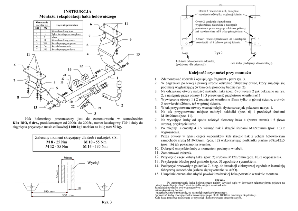 Otwór 3 wiercić na ø11, następnie rozwiercić ø26 tylko w górnej ścianie. INSTRUKCJA MontaŜu i eksploatacji haka holowniczego Oznaczenie zacisku wg ISO PN 1 L 2 + 3 31 4 R 5 58R 6 54 7 58L Kierunkowskazy lewe Tylne światła przeciwmgłowe Masa Kierunkowskazy prawe Światła pozycyjne prawe Światła hamowania Światła pozycyjne lewe 7 6 Otwór 1 wiercić przelotowo ø11, następnie rozwiercić ø18 tylko w górnej ścianie. 9 8 4 11 Otwór 2 znajduje się pod matą wygłuszającą. Odszukać a następnie przewiercić przez niego przelotowo, później zaś rozwiercić na ø18 tylko górną ścianę 11 6 Łączenie przewodów Rys 2. 13 Łeb śrub od mocowania zderzaka, (podajemy dla orientacji). 12 16 7 Kolejność czynności przy montaŜu 24 22 23 9 1 1. 2. 5 8 13 10 22 Łeb śruby (podajemy dla orientacji). 2 21 3 Hak holowniczy przeznaczony jest do zamontowania w samochodzie: KIA RIO, 5 drz., produkowanym od 2000r. do 2005r., numer katalogowy T39 i słuŜy do ciągnięcia przyczep o masie całkowitej 1100 kg i nacisku na kulę max 50 kg. Zalecany moment skręcający dla śrub i nakrętek 8,8: M 8 - 25 Nm M 10 - 55 Nm M 12 - 85 Nm M 14 - 135 Nm 50mm Zdemontować zderzak i wyciąć jego fragment - patrz rys. 3. W bagaŜniku po lewej i prawej stronie odszukać fabryczny otwór, który znajduje się pod matą wygłuszającą (w tym celu pomocny będzie rys. 2). 3. Na odszukane otwory nałoŜyć nakładki haka (poz. 6) otworem 2 jak pokazano na rys. 2, a następnie przez otwory 1 i 3 przewiercić przelotowo wiertłem ø11. 4. Wywiercone otwory 1 i 2 rozwiercić wiertłem ø18mm tylko w górnej ścianie, a otwór 3 rozwiercić ø26mm, teŜ w górnej ścianie. 5. W tak przygotowane otwory wsunąć tulejki dystansowe jak pokazano na rys. 1. 6. Na tak przygotowane miejsce nałoŜyć nakładki (poz. 6) i przełoŜyć śrubami M10x90mm (poz. 11). 7. Na wystające śruby od spodu nałoŜyć elementy haka 4 (prawa strona) i 5 (lewa strona), przykręcić luźno. 8. Po między elementy 4 i 5 wsunąć hak i skręcić śrubami M12x35mm (poz. 13) z wyposaŜenia. 9. Przez otwory w tylnej części wsporników kuli skręcić hak z uchem holowniczym samochodu śrubą M10x75mm (poz. 12) wykorzystując podkładki płaskie ø58xø12x5 (poz. 16) jak pokazano na rysunku. 10. Dokręcić wszystkie śruby z momentem podanym w tabeli. 11. Zamontować zderzak. 12. Przykręcić część kulistą haka (poz. 2) śrubami M12x75mm (poz. 10) z wyposaŜenia. 13. Przykręcić blachę pod gniazdo (poz. 3) zgodnie z rysunkiem. Wyciąć 14. Podłączyć przewody z gniazdka 7- bieg. do instalacji elektrycznej zgodnie z instrukcją fabryczną samochodu (zaleca się wykonanie w ASO). 15. Uzupełnić ewentualne ubytki powłoki malarskiej haka powstałe w trakcie montaŜu. UWAGA Po zamontowaniu haka holowniczego naleŜy uzyskać wpis w dowodzie rejestracyjnym pojazdu na „stacji kontroli pojazdów” właściwej dla miejsca zamieszkania. Samochód powinien być wyposaŜony w : -kierunkowskazy boczne -lusterka boczne o rozstawie, co najmniej szerokości przyczepy. Sprawdzać śruby mocujące haka holowniczego po około 1000 km przebiegu eksploatacji. Kula haka musi być utrzymana w czystości i konserwowana smarem stałym. Rys. 3 PPUH AUTO-HAK S.J. WyposaŜenie haka: Produkcja Haków Holowniczych Henryk & Zbigniew Nejman 76-200 SŁUPSK ul. Słoneczna 16K tel/fax (059) 8-414-414; 8-414-413 E-mail: [email protected] www. autohak.com.pl ø25xø13, L=49 ø17,2x2,35, L=49 ø17,2x2,35, L=58 Hak holowniczy bez wyposaŜenia elektrycznego Klasa: A50-X Nr kat. T39 Przeznaczony do zamontowania w samochodzie: Producent: KIA Model: RIO Typ: 5 drz. produkowanym od 2000r. do 2005r. Dane techniczne: Wartość siły D: 6,4 kN maksymalna masa przyczepy: 1100 kg maksymalny nacisk na kulę: 50 kg Numer homologacji zgodnie z wytycznymi regulaminu EKG/ONZ 55.01: E20-55R-01 1403 KARTA GWARANCYJNA Producent udziela gwarancji niniejszą kartą gwarancyjną na okres 24 miesięcy licząc od dnia zakupu haka holowniczego do samochodu: KIA RIO 5 drz. produkowanego od 2000r. do 2005r. Data produkcji .............................. Data zakupu.................................. Zakres gwarancji obejmuje wyłącznie wady jakościowe wynikające z winy producenta. Gwarancja nie obejmuje natomiast uszkodzeń zawinionych przez nabywcę, wynikających z niewłaściwego montaŜu, uŜytkowania lub konserwacji, uszkodzeń mechanicznych, normalnego zuŜycia podczas eksploatacji itp. Gwarancja udzielona na zakupiony towar nie wyłącza, nie ogranicza ani nie zawiesza uprawnień kupującego wynikających z niezgodności towaru z umową. Reklamacje naleŜy zgłaszać w punkcie sprzedaŜy, składając jednocześnie kartę gwarancyjną. Usunięcie "wady" następuje po stwierdzeniu przez punkt sprzedaŜy wspólnie z producentem słuszności złoŜonej reklamacji. Reklamacja powinna być załatwiona w ciągu 14 dni od dnia uznania reklamacji. Karta gwarancyjna jest niewaŜna jeŜeli nie jest wypełniona i podpisana. Data zgłoszenia reklamacji: ................................................................... INFORMACJA WSTĘPNA Hak holowniczy jest skonstruowany zgodnie z zasadami bezpieczeństwa ruchu drogowego. Hak holowniczy jest elementem wpływającym na bezpieczeństwo jazdy i moŜe zostać zainstalowany wyłącznie przez personel wyspecjalizowany. Niedopuszczalne jest dokonywanie jakichkolwiek zmian w konstrukcji haka. Powoduje to wygaśniecie dopuszczenia do stosowania. W przypadku obecności masy izolacyjnej lub osłony podwozia w miejscu przylegania haka, naleŜy ją usunąć. Nieosłonięte miejsca karoserii oraz wywiercone otwory naleŜy pomalować farbą antykorozyjną. Informacjami wiąŜącymi odnośnie wartości obciąŜeń są dane podawane przez producenta samochodu, względnie wartości maksymalnej masy przyczepy oraz maksymalnego nacisku na kulę, przy czym wartości parametrów haka holowniczego nie mogą być przekroczone. Wzór do obliczania warto