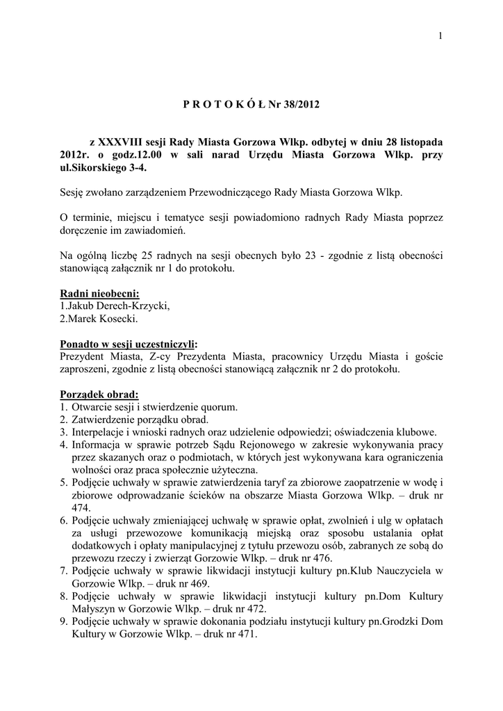 1 P R O T O K Ó Ł Nr 38/2012 z XXXVIII sesji Rady Miasta Gorzowa Wlkp. odbytej w dniu 28 listopada 2012r. o godz.12.00 w sali narad Urzędu Miasta Gorzowa Wlkp. przy ul.Sikorskiego 3-4. Sesję zwołano zarządzeniem Przewodniczącego Rady Miasta Gorzowa Wlkp. O terminie, miejscu i tematyce sesji powiadomiono radnych Rady Miasta poprzez doręczenie im zawiadomień. Na ogólną liczbę 25 radnych na sesji obecnych było 23 - zgodnie z listą obecności stanowiącą załącznik nr 1 do protokołu. Radni nieobecni: 1.Jakub Derech-Krzycki, 2.Marek Kosecki. Ponadto w sesji uczestniczyli: Prezydent Miasta, Z-cy Prezydenta Miasta, pracownicy Urzędu Miasta i goście zaproszeni, zgodnie z listą obecności stanowiącą załącznik nr 2 do protokołu. Porządek obrad: 1. Otwarcie sesji i stwierdzenie quorum. 2. Zatwierdzenie porządku obrad. 3. Interpelacje i wnioski radnych oraz udzielenie odpowiedzi; oświadczenia klubowe. 4. Informacja w sprawie potrzeb Sądu Rejonowego w zakresie wykonywania pracy przez skazanych oraz o podmiotach, w których jest wykonywana kara ograniczenia wolności oraz praca społecznie użyteczna. 5. Podjęcie uchwały w sprawie zatwierdzenia taryf za zbiorowe zaopatrzenie w wodę i zbiorowe odprowadzanie ścieków na obszarze Miasta Gorzowa Wlkp. – druk nr 474. 6. Podjęcie uchwały zmieniającej uchwałę w sprawie opłat, zwolnień i ulg w opłatach za usługi przewozowe komunikacją miejską oraz sposobu ustalania opłat dodatkowych i opłaty manipulacyjnej z tytułu przewozu osób, zabranych ze sobą do przewozu rzeczy i zwierząt Gorzowie Wlkp. – druk nr 476. 7. Podjęcie uchwały w sprawie likwidacji instytucji kultury pn.Klub Nauczyciela w Gorzowie Wlkp. – druk nr 469. 8. Podjęcie uchwały w sprawie likwidacji instytucji kultury pn.Dom Kultury Małyszyn w Gorzowie Wlkp. – druk nr 472. 9. Podjęcie uchwały w sprawie dokonania podziału instytucji kultury pn.Grodzki Dom Kultury w Gorzowie Wlkp. – druk nr 471. 2 10. Podjęcie uchwały w sprawie nadania statutu instytucji kultury pod nazwą Grodzki Dom Kultury w Gorzowie Wlkp. – druk nr 475. 11. Podjęcie uchwały w sprawie zmiany statutu instytucji kultury pn.Klub Myśli Twórczej „Lamus” w Gorzowie Wlkp. –druk nr 470. 12. Podjęcie uchwały w sprawie uchwalenia Miejskiego Programu Przeciwdziałania Narkomanii na rok 2013 – druk nr 456. 13. Podjęcie uchwały w sprawie uchwalenia Miejskiego Programu Profilaktyki i Rozwiązywania Problemów Alkoholowych na rok 2013 – druk nr 457. 14. Podjęcie uchwały w sprawie uchwalenia Programu Współpracy Miasta Gorzowa Wlkp. z organizacjami pozarządowymi i innymi podmiotami na rok 2013 – druk nr 458. 15. Podjęcie uchwały w sprawie przyjęcia Gminnego programu przeciwdziałania przemocy w rodzinie oraz ochrony ofiar przemocy w rodzinie w Gorzowie Wlkp. na lata 2012-2014 –druk nr 468. 16. Podjęcie uchwały w sprawie ustalenia wysokości kwoty stanowiącej podstawę do ustalenia wysokości dotacji na działalność Centrum Integracji Społecznej w Gorzowie Wlkp. w 2013 – druk nr 461. 17. Podjęcie uchwały zmieniającej uchwałę w sprawie Wieloletniego programu gospodarowania mieszkaniowym zasobem Miasta Gorzowa Wlkp. na lata 20122016 – druk nr 473. 18. Podjęcie uchwały w sprawie zmiany uchwały budżetowej na 2012 rok miasta Gorzowa Wlkp. – druk nr 477. 19. Podjęcie uchwały w sprawie zmiany uchwały budżetowej na 2012 rok miasta Gorzowa Wlkp. – druk nr 478. 20. Podjęcie uchwały w sprawie zmiany uchwały budżetowej na 2012 rok miasta Gorzowa Wlkp. – druk nr 479. 21. Podjęcie uchwały w sprawie zmiany uchwały budżetowej na 2012 rok miasta Gorzowa Wlkp. – druk nr 480. 22. Podjęcie uchwały w sprawie zmiany Wieloletniej Prognozy Finansowej Miasta Gorzowa Wlkp. na lata 2012-2086 – druk nr 481. 23. Podjęcie uchwały w sprawie zaciągnięcia zobowiązania na rok 2013 – druk nr 462. 24. Podjęcie uchwały w sprawie zaciągnięcia zobowiązania na rok 2013 – druk nr 465. 25. Podjęcie uchwały w sprawie zaciągnięcia zobowiązania na rok 2013 – druk nr 466. 26. Podjęcie uchwały zmieniającej uchwałę w sprawie ustalenia jednostkowych stawek dotacji przedmiotowej na rok 2012 dla Zakładu Gospodarki Mieszkaniowej w Gorzowie Wlkp. – druk nr 459. 27. Podjęcie uchwały w sprawie wyrażenia zgody na darowiznę nieruchomości – druk nr 460. 28. Podjęcie uchwały w sprawie wyrażenia zgody na zawarcie kolejnej umowy najmu lokalu – druk nr 467. 29. Podjęcie uchwały w sprawie rozstrzygnięcia skargi. – druk nr 482. 30. Podjęcie uchwały w sprawie rozstrzygnięcia skargi. – druk nr 483. 3 31. Podjęcie uchwały zmieniającej uchwałę w sprawie ustalenia składów osobowych stałych komisji Rady Miasta Gorzowa Wlkp. – druk nr 463. 32. Informacja z bieżącej działalności Prezydenta Miasta. 33. Odpowiedzi na interpelacje z XXXVI sesji Rady Miasta z dnia 24 października 2012r. 34. Przyjęcie protokołu z XXXVI i XXXVII sesji Rady Miasta Gorzowa Wlkp. 35. Sprawy różne, wolne wnioski. 36. Zakończenie obrad. Ad.1 Otwarcie sesji i stwierdzenie quorum. Sesję otworzył i jej obradom przewodniczył Przewodniczący Rady Miasta – Jerzy Sobolewski, który po powitaniu stwierdził wymagane quorum do obradowania i podejmowania prawomocnych uchwał. Ad.2 Zatwierdzenie porządku obrad. Jerzy Sobolewski - wpłynął wniosek Prezydenta Miasta o poszerzenie porządku obrad o projekt uchwały w sprawie zmiany uchwały budżetowej na 2012r. miasta Gorzowa Wlkp. - druk nr 484. Komisja Gospodarki i Rozwoju wnioskuje o poszerzenie porządku obrad o projekt uchwały w sprawie przyjęcia zmiany Statutu Związku Celowego Gmin MG-6 – druk nr 439 i Komisja Rewizyjna wnosi o poszerzenie porządku o stanowisko w sprawie CEA-Filharmonia Gorzowska. W głosowaniu jawnym za poszerzeniem porządku o projekt uchwały w sprawie zmiany uchwały budżetowej na 2012r. miasta Gorzowa Wlkp., głosowało 18 radnych, przy braku głosów przeciw