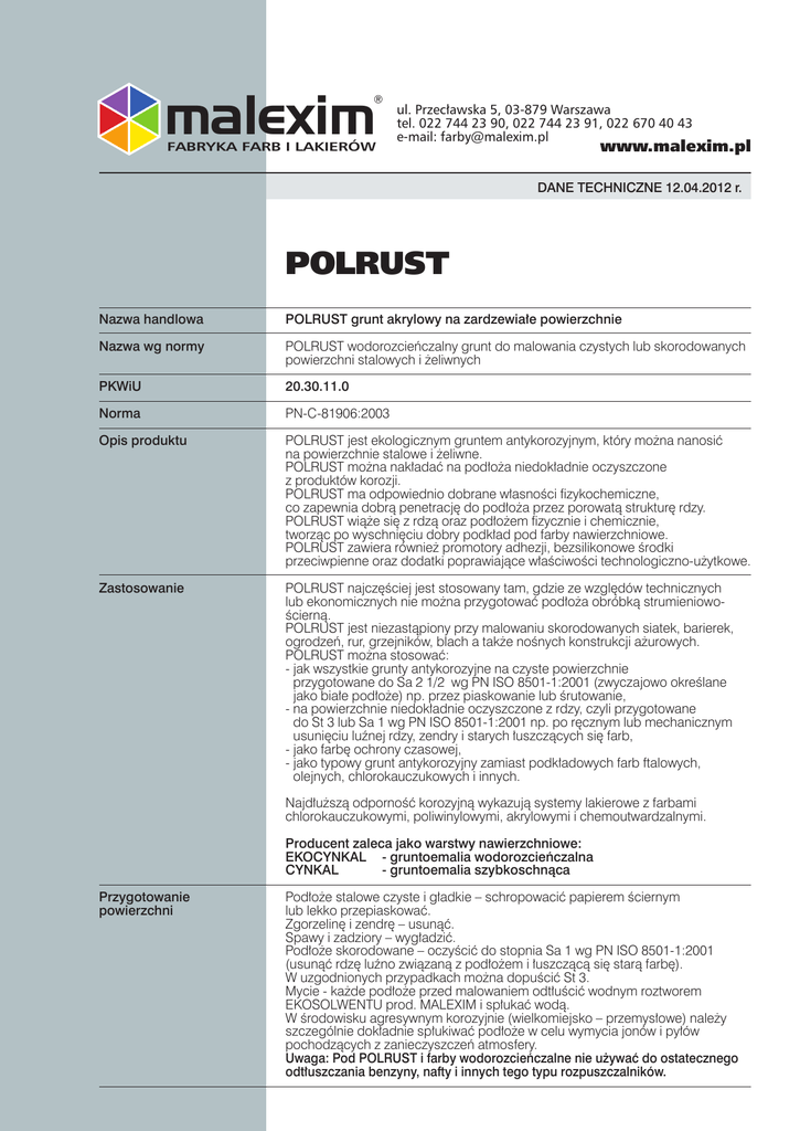 malexim ® FABRYKA FARB I LAKIERÓW ul. Przecławska 5, 03-879 Warszawa tel. 022 744 23 90, 022 744 23 91, 022 670 40 43 e-mail: [email protected] www.malexim.pl DANE TECHNICZNE 12.04.2012 r. POLRUST Nazwa handlowa POLRUST grunt akrylowy na zardzewiałe powierzchnie Nazwa wg normy POLRUST wodorozcieńczalny grunt do malowania czystych lub skorodowanych powierzchni stalowych i żeliwnych PKWiU 20.30.11.0 Norma PN-C-81906:2003 Opis produktu POLRUST jest ekologicznym gruntem antykorozyjnym, który można nanosić na powierzchnie stalowe i żeliwne. POLRUST można nakładać na podłoża niedokładnie oczyszczone z produktów korozji. POLRUST ma odpowiednio dobrane własności fizykochemiczne, co zapewnia dobrą penetrację do podłoża przez porowatą strukturę rdzy. POLRUST wiąże się z rdzą oraz podłożem fizycznie i chemicznie, tworząc po wyschnięciu dobry podkład pod farby nawierzchniowe. POLRUST zawiera również promotory adhezji, bezsilikonowe środki przeciwpienne oraz dodatki poprawiające właściwości technologiczno-użytkowe. Zastosowanie POLRUST najczęściej jest stosowany tam, gdzie ze względów technicznych lub ekonomicznych nie można przygotować podłoża obróbką strumieniowościerną. POLRUST jest niezastąpiony przy malowaniu skorodowanych siatek, barierek, ogrodzeń, rur, grzejników, blach a także nośnych konstrukcji ażurowych. POLRUST można stosować: - jak wszystkie grunty antykorozyjne na czyste powierzchnie przygotowane do Sa 2 1/2 wg PN ISO 8501-1:2001 (zwyczajowo określane jako białe podłoże) np. przez piaskowanie lub śrutowanie, - na powierzchnie niedokładnie oczyszczone z rdzy, czyli przygotowane do St 3 lub Sa 1 wg PN ISO 8501-1:2001 np. po ręcznym lub mechanicznym usunięciu luźnej rdzy, zendry i starych łuszczących się farb, - jako farbę ochrony czasowej, - jako typowy grunt antykorozyjny zamiast podkładowych farb ftalowych, olejnych, chlorokauczukowych i innych. Najdłuższą odporność korozyjną wykazują systemy lakierowe z farbami chlorokauczukowymi, poliwinylowymi, akrylowymi i chemoutwardzalnymi. Producent zaleca jako warstwy nawierzchniowe: EKOCYNKAL - gruntoemalia wodorozcieńczalna CYNKAL - gruntoemalia szybkoschnąca Przygotowanie powierzchni Podłoże stalowe czyste i gładkie – schropowacić papierem ściernym lub lekko przepiaskować. Zgorzelinę i zendrę – usunąć. Spawy i zadziory – wygładzić. Podłoże skorodowane – oczyścić do stopnia Sa 1 wg PN ISO 8501-1:2001 (usunąć rdzę luźno związaną z podłożem i łuszczącą się starą farbę). W uzgodnionych przypadkach można dopuścić St 3. Mycie - każde podłoże przed malowaniem odtłuścić wodnym roztworem EKOSOLWENTU prod. MALEXIM i spłukać wodą. W środowisku agresywnym korozyjnie (wielkomiejsko – przemysłowe) należy szczególnie dokładnie spłukiwać podłoże w celu wymycia jonów i pyłów pochodzących z zanieczyszczeń atmosfery. Uwaga: Pod POLRUST i farby wodorozcieńczalne nie używać do ostatecznego odtłuszczania benzyny, nafty i innych tego typu rozpuszczalników. malexim ® FABRYKA FARB I LAKIERÓW POLRUST str. 2 Sposób użycia Przygotowanie farby Farbę wymieszać. Do ustawienia lepkości stosować wodę destylowaną lub przegotowaną. Podłoże skorodowane najkorzystniej jest malować, gdy jest niecałkowicie wyschnięte po myciu. Uwaga: Najkorzystniej jest malować w temp. 15-300C. W upały należy schłodzić podłoże zimną wodą do temp. poniżej 300C. Właściwości POLRUST przynosi wymierne efekty ekonomiczne, gdyż pozwala wyeliminować część wydatków na mechaniczne lub chemiczne przygotowanie powierzchni przed malowaniem do stopnia Sa 2 ½ jak dla tradycyjnych farb antykorozyjnych. Kolor Lepka beżowa ciecz bez wytrąceń stałych, dopuszczalne lekkie rozwarstwienie ustępujące po wymieszaniu. Opakowania 0,05; 0,3; 0,7; 2,5; 10 litrów Wydajność Zawartość części stałych: 40 ± 2% obj. lub 420 ± 2% wag. Grubość warstwy powłoki mokrej, µm - 100 Grubość warstwy powłoki suchej, µm - 37 Zużycie teoretyczne przy grubości 40 µm suchej powłoki 0,10 dcm³/m² lub 0,11 kg/m² Zalecana ilość warstw: 1 Wydajność praktyczna uzależniona jest od warunków i techniki malowania oraz kształtu i chropowatości powierzchni. Czas wysychania Czasy wysychania w temp. 23±20C przy DTF 40 µm: Pyłosuchość - 0,5 godz. Suchość w dotyku - 2 godz. Kolejne malowanie farbami nawierzchniowymi po 12 godz. Czasy schnięcia i ponownego malowania zależą od grubości warstwy, temperatury, wilgotności względnej powietrza i wentylacji. Rozcieńczalnik Woda pitna Sposób nanoszenia POLRUST można nanosić pędzlem, wałkiem, natryskiem lub przez zanurzenie. Uwaga! Na powłokę POLRUST można nanosić prawie wszystkie materiały malarskie. Jeżeli wykonawca zamierza nanosić na POLRUST farby lub szpachle nitro, chemoodporne, szybko schnące lub inne zawierające dużo agresywnych rozpuszczalników należy wydłużyć czas schnięcia lub przeprowadzić próbne wymalowania, żeby uniknąć odspajania powłok od podłoża. Parametry techniczne Lepkość umowna wg kubka Forda Φ 4 Gęstość, max najwyżej LZO maksymalna zawartość 65 – 110 sek. 1,10 g/cm3 10 g/l Atesty i Certyfikaty Atest PZH Wskazówki BHP i ppoż. Należy przestrzegać zasad i przepisów BHP i ppoż. zawartych w Karcie Charakterystyki Mieszaniny Chemicznej, ze szczególnym uwzględnieniem wentylacji pomieszczeń. Transport i przechowywanie Farbę należy przechowywać i transportować w szczelnie zamkniętych opakowaniach z dala od ognia i źródeł ciepła w temp. 5-250C. Okres przydatności do użycia 24 miesiące od daty produkcji.