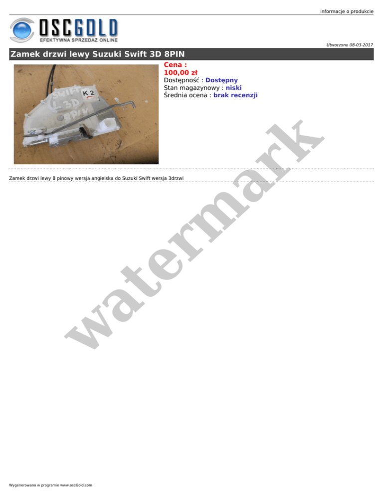 Informacje o produkcie Utworzono 08-03-2017 Zamek drzwi lewy Suzuki Swift 3D 8PIN Cena : 100,00 zł er m ar k Dostępność : Dostępny Stan magazynowy : niski Średnia ocena : brak recenzji w at Zamek drzwi lewy 8 pinowy wersja angielska do Suzuki Swift wersja 3drzwi Wygenerowano w programie www.oscGold.com
