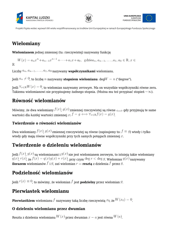 Wielomiany Równość wielomianów Twierdzenie o dzieleniu