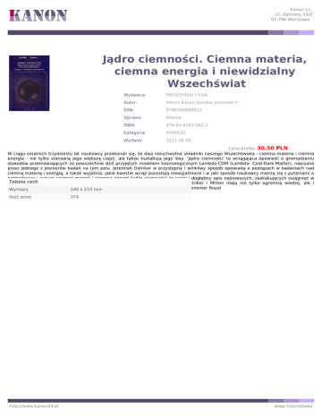 Kanon s.c. Ul. Zamiany 16/2 02-786 Warszawa Jądro ciemności. Ciemna materia, ciemna energia i niewidzialny Wszechświat Wydawca: PRÓSZYŃSKI I S-KA Autor: Mitton Simon,Ostriker Jeremiah P. EAN: 9788380690622 Oprawa: Miękka ISBN: 978-83-8069-062-2 Kategoria: POWIEŚĆ Wydano: 2015-08-05 Cena brutto: 30,50 PLN W ciągu ostatnich trzydziestu lat naukowcy przekonali się, że dwa nieuchwytne składniki naszego Wszechświata - ciemna materia i ciemna energia - nie tylko stanowią jego większą część, ale także kształtują jego losy. 'Jądro ciemności' to wciągająca opowieść o gromadzeniu dowodów przemawiających za powszechnie dziś przyjętym modelem kosmologicznym Lambda-CDM (Lambda- Cold-Dark-Matter), napisana przez jednego z pionierów badań na tym polu. Jeremiah Ostriker w przystępny i wnikliwy sposób opowiada o postępach w badaniach nad ciemną materią i energią, a także wyjaśnia, jakie kwestie wciąż pozostają niewyjaśnione i w jaki sposób naukowcy mierzą się z pytaniami o pochodzenie i naturę ciemnej materii i ciemnej energii.'Jądro ciemności' to jasny i dogłębny opis najnowszych, zaskakujących osiągnięć w Tabela cech badaniach Wszechświata i kwestii, które wciąż pozostają dla nas tajemnicą. Ostriker i Mitton mają nie tylko ogromną wiedzę, ale i wyśmienity Master of Trinity Wymiary styl.Martin Rees, 140 x 210 mm College, University of Cambridge, Astronomer Royal Ilość stron http://www.kanon24.pl 374 sklep internetowy