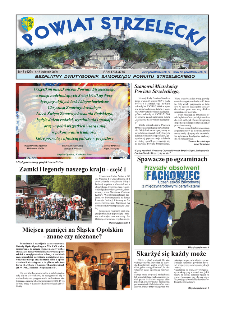 Wszystkim mieszkañcom Powiatu Strzeleckiego z okazji nadchodz¹cych wi¹t Wielkiej Nocy ¿yczymy obfitych ³ask i b³ogos³awieñstw Chrystusa Zmartwychwsta³ego. Niech wiêto Zmartwychwstania Pañskiego, bêdzie dniem radoci, wytchnienia i spokoju oraz wype³ni wszystkich wiar¹ i si³¹ w pokonywaniu trudnoci, które pozwol¹ z ufnoci¹ patrzeæ w przysz³oæ Wicestarosta Strzelecki Waldemar Gaida Przewodnicz¹cy Rady Henryk Bartoszek Starosta Strzelecki Józef Swaczyna Strzelce Opolskie, Wielkanoc 2009 Szanowni Mieszkañcy Powiatu Strzeleckiego, Na sesji Rady Powiatu Strzeleckiego w dniu 25 marca 2009 r. Rada Powiatu Strzeleckiego podjê³a uchwa³ê Nr XXVIII/256/09 w sprawie zasad nadawania tytu³u Honorowy Obywatel Powiatu Strzeleckiegooraz uchwa³ê Nr XXVIII/257/09 w sprawie zasad nadawania tytu³u Zas³u¿ony dla Powiatu Strzeleckiego Wielu mieszkañców Powiatu Strzeleckiego zas³uguje na wyró¿nienie. Niejednokrotnie spotykamy w swoich rodowiskach osoby, których dzia³alnoæ na niwie spo³ecznej, gospodarczej poprzez swoje dzia³ania w istotny sposób przyczyniaj¹ siê do rozwoju Powiatu Strzeleckiego. Warto te osoby za ich pracê, powiêcenie i zaanga¿owanie doceniæ. Warto, ¿eby dziêki przyznaniu im tytu³ów w sposób szczególny zosta³y docenione, przez nas wszystkich mieszkañców powiatu. Mam nadziejê, ¿e przyznanie tytu³u bêdzie zarówno podziêkowaniem dla tych osób, jak równie¿ inspiracj¹ do podjêcia ro¿nego rodzaju inicjatyw przez inne osoby. Wiem, znaj¹c lokalne rodowiska, ¿e pretendentów do tytu³u na terenie naszej ma³ej ojczyzny nie zabraknie. Na zg³aszanie kandydatur czekamy do 31 padziernika. Starosta Strzeleckiego Józef Swaczyna Wiêcej o tytu³ach Honorowy Obywatel Powiatu Strzeleckiego i Zas³u¿ony dla Powiatu Strzeleckiego czytaj na str. 7 Spawacze po egzaminach Miêdzynarodowy projekt licealistów Zamki i legendy naszego kraju - czêæ 1 Cz³onkowie klubu Activa z LO im. Mieszka I w Zawadzkiem od 1 do 9 kwietnia w okolicach Wis³y i Istebnej wspólnie z rówienikami z ukraiñskiego U¿gorodu bêd¹ realizowaæ miêdzynarodowy projekt, finansowany przez Narodowe Centrum Kultury. Wspó³organizatorem projektu jest Stowarzyszenie na Rzecz Rozwoju Edukacji i Kultury w Powiecie Strzeleckim. Natomiast we wrzeniu klubowicze pojad¹ na Ukrainê. Za³o¿eniem wymiany jest integracja m³odzie¿y poprzez gry i zabawy edukacyjne oraz warsztaty. Zak³adamy opracowanie regulaminu poWiêcej czytaj na str. 4 Miejsca pamiêci na l¹sku Opolskim - znane czy nieznane? Pobudzanie i rozwijanie zainteresowania histori¹ l¹ska Opolskiego w XIX i XX wieku, inspirowanie do zajêcia czynnej postawy wobec otaczaj¹cej rzeczywistoci i kszta³towania przysz³oci z uwzglêdnieniem bolesnych dowiadczeñ przesz³oci, rozwijanie umiejêtnoci prowadzenia dialogu oraz radzenia sobie z uprzedzeniami i stereotypami - to g³ówne cele konkursu pt. ,,Obozy w Lamsdorf/£ambinowicach (1870-1946). Historia i wspó³czesnoæ. Dla uczniów liceum wszystkie te za³o¿enia okaza³y siê na tyle ciekawe, ¿e zaanga¿owali siê w wielomiesiêczne przygotowania do konkursu dotycz¹cego dziejów obozów jenieckich (1870-1945) i obozu pracy w Lamsdorf/£ambinowicach (19451946). Wiêcej czytaj na str. 4 Skar¿yæ siê ka¿dy mo¿e Tak¿e pisaæ wnioski. Do dowolnego urzêdu. Równie¿ do starosty. I na starostê. Wa¿ne jest, by wiedzieæ, gdzie skargê skierowaæ, bo niew³aciwy adres opóni jej za³atwienie. Skarga mo¿e dotyczyæ zaniedbania lub nienale¿ytego wykonywanie zadañ przez w³aciwe organy albo przez ich pracowników, naruszenia praworz¹dnoci lub interesów skar¿¹cych, a tak¿e przewlek³ego lub biu- rokratycznego za³atwiania spraw. Wniosek natomiast powinien zawieraæ propozycjê rozwi¹zania jakiej sprawy. Niezale¿nie od tego, czy wystêpujemy ze skarg¹ czy z wnioskiem, jaki odzew ze strony adresata bêdzie na pewno (inna rzecz czy dla nas satysfakcjonuj¹cy), bo udzielenie odpowiedzi jest obowi¹zkowe. Wiêcej czytaj na str. 6