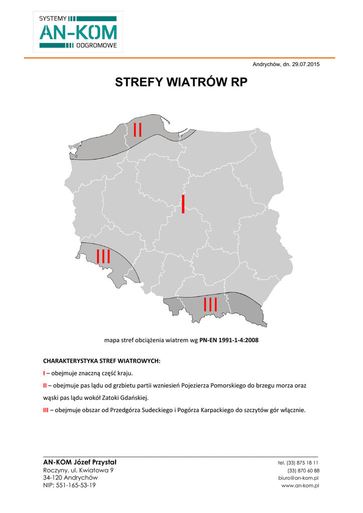 Andrychów, dn. 29.07.2015 STREFY WIATRÓW RP mapa stref obciążenia wiatrem wg PN-EN 1991-1-4:2008 CHARAKTERYSTYKA STREF WIATROWYCH: I – obejmuje znaczną część kraju. II – obejmuje pas lądu od grzbietu partii wzniesień Pojezierza Pomorskiego do brzegu morza oraz wąski pas lądu wokół Zatoki Gdańskiej. III – obejmuje obszar od Przedgórza Sudeckiego i Pogórza Karpackiego do szczytów gór włącznie. __________________________________________________________________________________ AN-KOM Józef Przystał tel. (33) 875 18 11 Roczyny, ul. Kwiatowa 9 34-120 Andrychów NIP: 551-165-53-19 (33) 870 60 88 [email protected] www.an-kom.pl maszty wolnostojące z oferty AN-KOM serii: AN-80, AN-81, AN-82, AN-83 wszystkie serie w/w masztów (wolnostojących) posiadają obciążniki dobrane do strefy wiatrów na podstawie wykonanych badań i obliczeń w Laboratorium Inżynierii Wiatrowej Politechniki Krakowskiej w Krakowie __________________________________________________________________________________ AN-KOM Józef Przystał tel. (33) 875 18 11 Roczyny, ul. Kwiatowa 9 34-120 Andrychów NIP: 551-165-53-19 (33) 870 60 88 [email protected] www.an-kom.pl