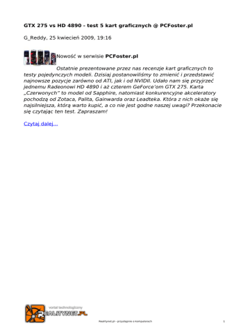 GTX 275 vs HD 4890 - test 5 kart graficznych @ PCFoster.pl G_Reddy, 25 kwiecień 2009, 19:16 Nowość w serwisie PCFoster.pl Ostatnie prezentowane przez nas recenzje kart graficznych to testy pojedynczych modeli. Dzisiaj postanowiliśmy to zmienić i przedstawić najnowsze pozycje zarówno od ATI, jak i od NVIDII. Udało nam się przyjrzeć jednemu Radeonowi HD 4890 i aż czterem GeForce’om GTX 275. Karta „Czerwonych” to model od Sapphire, natomiast konkurencyjne akceleratory pochodzą od Zotaca, Palita, Gainwarda oraz Leadteka. Która z nich okaże się najsilniejsza, którą warto kupić, a co nie jest godne naszej uwagi? Przekonacie się czytając ten test. Zapraszam! Czytaj dalej... Realitynet.pl - przystępnie o komputerach 1