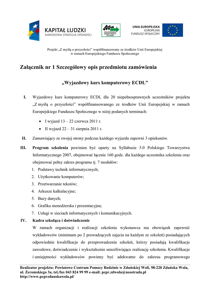 Projekt „Z myślą o przyszłości” współfinansowany ze środków Unii Europejskiej w ramach Europejskiego Funduszu Społecznego Załącznik nr 1 Szczegółowy opis przedmiotu zamówienia „Wyjazdowy kurs komputerowy ECDL” I. Wyjazdowy kurs komputerowy ECDL dla 20 niepełnosprawnych uczestników projektu „Z myślą o przyszłości” współfinansowanego ze środków Unii Europejskiej w ramach Europejskiego Funduszu Społecznego w niżej podanych terminach: I wyjazd 13 – 22 czerwca 2011 r. II wyjazd 22 – 31 sierpnia 2011 r. II. III. Zamawiający ze swojej strony podczas każdego wyjazdu zapewni 3 opiekunów. Program szkolenia powinien być oparty na Syllabusie 5.0 Polskiego Towarzystwa Informatycznego 2007, obejmować łącznie 160 godz. dla każdego uczestnika szkolenia oraz obejmować pełny zakres programu tj. 7 modułów: 1. Podstawy technik informatycznych; 2. Użytkowanie komputerów; 3. Przetwarzanie tekstów; 4. Arkusze kalkulacyjne; 5. Bazy danych; 6. Grafika menedżerska i prezentacyjna; 7. Usługi w sieciach informatycznych i komunikacyjnych. IV. Kadra szkoląca i doświadczenie W ramach organizacji i realizacji szkolenia wykonawca ma obowiązek zapewnić wykładowców (minimum po 2 prowadzących zajęcia na każdym ze szkoleń) posiadających odpowiednie kwalifikacje do przeprowadzenia szkoleń, którzy posiadają kwalifikacje zawodowe, doświadczenie i wykształcenie umożliwiające realizację szkolenia. Kwalifikacje i umiejętności wykładowców powinny być adekwatne do zakresu programowego Realizator projektu: Powiatowe Centrum Pomocy Rodzinie w Zduńskiej Woli, 98-220 Zduńska Wola, ul. Żeromskiego 3a, tel./fax 043 824 99 99 e-mail: [email protected] http://www.pcprzdunskawola.pl/ Projekt „Z myślą o przyszłości” współfinansowany ze środków Unii Europejskiej w ramach Europejskiego Funduszu Społecznego prowadzonych przez nich zajęć. Wykonawca musi wykazać, że zrealizował należycie (zakończył) w okresie ostatnich 3 lat, co najmniej 2 szkolenia na kwotę (brutto) każdego ze szkoleń nie mniejszą niż 35.000,00 zł. V. Wymagania W ramach organizacji i realizacji szkolenia wykonawca ma obowiązek zapewnić pełną obsługę certyfikacji ECDL w imieniu i na rzecz każdego z uczestników szkoleń kończących się egzaminem i przeprowadzenie ECDL na egzaminów odpowiednim certyfikacyjnych poziomie dla poprzez: każdego zorganizowanie uczestnika zgodnie z obowiązującymi zasadami w tym zakresie wraz z co najmniej jednym egzaminem powtórkowym z każdego modułu oraz wydanie Europejskiego Certyfikatu Umiejętności Komputerowych (ECDL) wszystkim uczestnikom, którzy pomyślnie zdali wymagane egzaminy. Wykonawca ma obowiązek zapewnić na wszystkie egzaminy tj. z każdego modułu egzaminatorów posiadających upoważnienia egzaminatorów ECDL. VI. Wymagania dotyczące miejsca szkolenia 1. Wykonawca zobowiązany jest zorganizować dla 23 osobowej grupy w tym 3 opiekunów z ramienia PCPR pobyt: 1) w I terminie w Zakopanem, 2) w II terminie w okolicach Władysławowa, w ośrodkach przystosowanych do przyjmowania osób niepełnosprawnych, zapewniających: 1) zakwaterowanie w pokojach 2 - osobowych (każdy pokój z pełnym węzłem sanitarnym: prysznic, umywalka oraz wc). 2) Korzystanie ze stołówki: całodzienne wyżywienie oraz serwis kawowy. Przez całodzienne wyżywienie, rozumie się trzy posiłki, tj.: Realizator projektu: Powiatowe Centrum Pomocy Rodzinie w Zduńskiej Woli, 98-220 Zduńska Wola, ul. Żeromskiego 3a, tel./fax 043 824 99 99 e-mail: [email protected] http://www.pcprzdunskawola.pl/ Projekt „Z myślą o przyszłości” współfinansowany ze środków Unii Europejskiej w ramach Europejskiego Funduszu Społecznego śniadanie (szwedzki stół), w godzinach od 7.30 do 8.30, minimum dwa dania ciepłe, zimne przekąski, pieczywo ciemne i jasne, napoje gorące i zimne, warzywa, owoce, soki, obiad dwudaniowy z deserem, kolacja (szwedzki stół) minimum dwa dania ciepłe, zimne przekąski, pieczywo ciemne i jasne, napoje gorące i zimne, warzywa, owoce, soki, w tym minimum 3 kolacje integracyjne umożliwiające integrację grupy np.: w formie grilla/ogniska podczas którego zostaną podane kiełbaski, szaszłyki, kaszanka, mięsa, warzywa, pieczywo, napoje gorące i zimne. Ponadto, Zamawiający przewiduje podczas zajęć dwie przerwy kawowe (godziny do uzgodnienia z trenerem): kawa, herbata, soki, woda, owoce, słodkości w sali, gdzie będą przeprowadzane zajęcia. 3) Możliwość korzystania z sali konferencyjnej, na wyłączność grupy przez cały czas trwania usługi, wyposażonej w: stoły i krzesła, w ilości dostosowanej do liczby uczestników, z możliwością dowolnej aranżacji ich ustawienia, flipchart’a sprzęt audio – video, rzutnik multimedialny i ekran oraz tablica interaktywna, 12 godzinny dostęp do komputerów z łączem internetowym Zajęcia muszą być przeprowadzone w pomieszczeniach z odpowiednim oświetleniem, ogrzewaniem i wentylacją, dostosowanych do prowadzenia zajęć szkoleniowych, z zapewnionym zapleczem, posiadające odpowiednie warunki sanitarne, bezpieczeństwa i higieny pracy, których powierzchnia, ilość stanowisk oraz wyposażenie w sprzęt i pomoce dydaktyczne dostosowana będzie do liczby uczestników zajęć. 4) możliwość korzystania z infrastruktury sportowo – rekreacyjnej ośrodka. Realizator projektu: Powiatowe Centrum Pomocy Rodzinie w Zduńskiej Woli, 98-220 Zduńska Wola, ul. Żeromskiego 3a, tel./fax 043 824 99 99 e-mail: [email protected] http://www.pcprzdunskawola.pl/ Projekt „Z myślą o przyszłości” współfinansowany ze środków Unii Europejskiej w ramach Europejskiego Funduszu Społecznego 2. Wykonawca zobowiązany jest do zapewnienia 20 stanowisk komputerowych wraz z oprogramowaniem niezbędnym do przeprowadzenia szkolenia oraz dostępem do Internetu (1 osoba – 1 komputer) oraz 2 stanowiska rezerwowe z oprogramowaniem niezbędnym do przeprowadzenia szkoleni