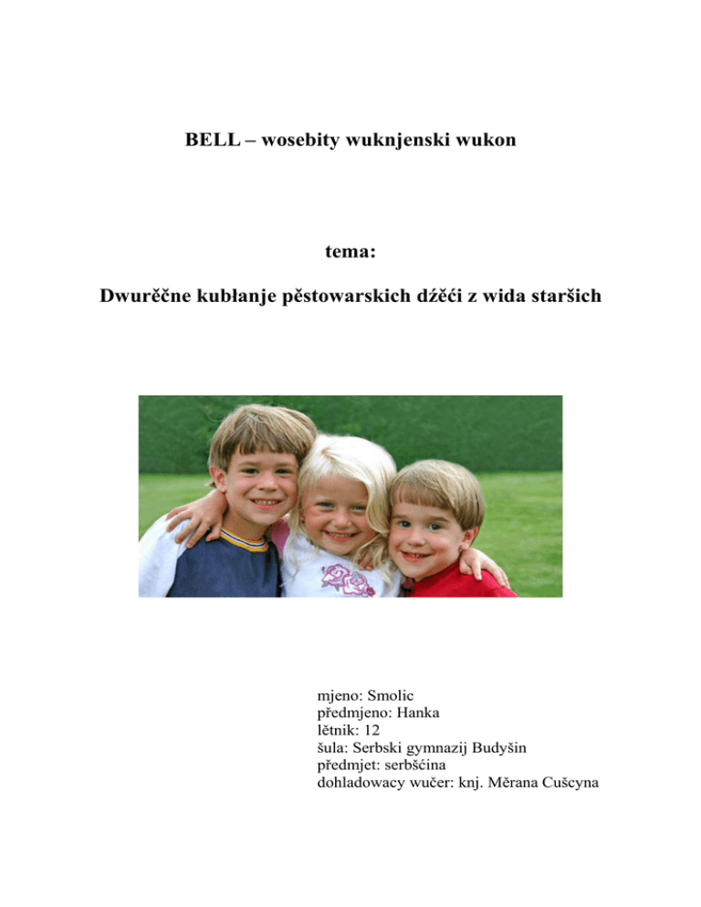 BELL – wosebity wuknjenski wukon tema: Dwurěčne kubłanje pěstowarskich dźěći z wida staršich mjeno: Smolic předmjeno: Hanka lětnik: 12 šula: Serbski gymnazij Budyšin předmjet: serbšćina dohladowacy wučer: knj. Měrana Cušcyna Rozrjadowanje 1 Zawod...............................................................................................................................................3 2 Serbsko-němska dwurěčnosć............................................................................................................3 2.1 Zapřijeće dwurěčnosće..................................................................................................................4 2.2 Přiswojenje rěčow w zažnym dźěćatstwje.....................................................................................6 2.3 Lěpšiny zažneho dwurěčneho kubłanja.........................................................................................7 2.4 Čehodla přiběra wědomje za dwurěčne kubłanje? ......................................................................7 2.5 Móžnosće staršich za wobwliwowanje dwurěčneho wuwića dźěsća ..........................................8 3 WITAJ – modelowy projekt.............................................................................................................9 3.1 Zasady a metodika.......................................................................................................................10 3.2 Přehlad z ličbami.........................................................................................................................12 4 Přepytowane pěstowarnje...............................................................................................................14 4.1 Malešecy......................................................................................................................................14 4.2 Myšecy.........................................................................................................................................14 4.3 Worklecy......................................................................................................................................14 5 Kak mysla starši wo dwurěčnym kubłanju? (wuhódnoćenje naprašnikow)...................................15 5.1 Postupowanje...............................................................................................................................15 5.2 Analyza........................................................................................................................................15 5.3 Zjeće............................................................................................................................................38 6 Žórła................................................................................................................................................40 2 / 41 1 Zawod Temu: „Dwurěčne kubłanje pěstowarskich dźěći z wida staršich” sym sej wupytała, dokelž mje nastajenje staršich ke kubłanju swojich dźěći zajimuje. Kak mysla starši wo lěpšinach dwurěčnosće a z kotreje přičiny dadźa starši swoje dźěći do wěsteje pěstowarnje, to stej w tutym zwisku wažnej prašeni. Nimo toho chcu zwěsćić, kak daloko je WITAJ-projekt rozšěrjeny, abo kak derje su starši woprawdźe wo koncepće informowani, hač wědźa, zo njejedna so tu jenož wo zapřijeće za wěsty projekt, ale zo so za tym wjace chowa. WITAJ je doprědkarski koncept, puć do žiweje dwurěčnosće a dobry zakład za optimalne wuwiće dźěsća. Wosebje zajimawe pak je za mnje wid staršich – wosebje němskich – na to, kak derje jich dźěći hižo serbsce rozumja a rěča. Na spočatku mojeho dźěła steješe studij wotpowědneje literatury wo dwurěčnym kubłanju a wo WITAJ-projekće. Dale sym so pola Jadwigi Kaulfürstoweje, wědomostneje sobudźěłaćerki w Rěčnym centrumje WITAJ, a pola Ludmile Budarjoweje, předsydki Serbskeho šulskeho towarstwa, informowała. Za přepytowanje wuzwolich sej tři pěstowarnje, z toho dwě, kotrejž dźěłatej po WITAJ-metodźe – stej to Malešecy a Myšecy. Malešanska je WITAJ-pěstowarnja, tam so wšitke dźěći na projekće wobdźěleja. W Myšecach mamy němsku pěstowarnju z WITAJ-skupinu. Nimo toho sym sej Worklečansku pěstowarnju wuzwoliła, kotraž je dwurěčna, ale WITAJ njeposkićuje. Tak chcu rozdźěle přepytować a hižo někotre wuslědki k wuwiću dźěsća předstajić. Přichodny krok při tutym dźěle bě nastajenje naprašnika ze zawodnym listom. W nim sym so skrótka předstajiła a zaměr naprašnika kaž tež wotmysł jedneje BELL wopisała. Naprašnik je wězo w serbskej kaž tež w němskej rěči nastajeny, přetož w pěstowarnjach njejsu jenož serbsce rěčacy starši. Dalše informaciske žórło běštej dwě konferency, na kotrymajž so wobdźělich. Tam zajimowachu mje wosebje praktiske nazhonjenja pěstowarkow a wučerjow, kotrež so tam nazhornje předstajichu. W časowym wotrězku, w kotrymž mějachu starši čas na naprašnik wotmołwić, sym teoretiski dźěl dźěła napisała. Jako mějach naprašniki zaso wróćo, sym tute wuhódnoćiła a wuslědki z pomocu diagramow zwobrazniła. 2 Serbsko-němska dwurěčnosć Na swěće wotrosćetej dwě třećinje wobydlerstwa z dwěmaj rěčomaj abo samo z wjacorymi. Dwurěčnosć potajkim za wjetšinu ludnosće ničo wosebite njeje. Wona je za nich normalna a woni přiswojeja sej druhu rěč sami wot so, njewědomje, dokelž wotrostu w dwu- abo wjacerěčnym wobswěće. W diskusijach mjez wědomostnikami, mjeze staršimi ale tež w medijach jewja so w poslednich lětdźesatkach husćišo prašenja wědomeho kubłanja dźěći w dwěmaj rěčomaj. Tole přitrjechi tež za Serbow, dokelž dźe wo zachowanje žiweje serbšćiny a kultury. Serbsko-němska dwurěčnosć wotpowěduje přiběracej potrjebje hospodarstwa 