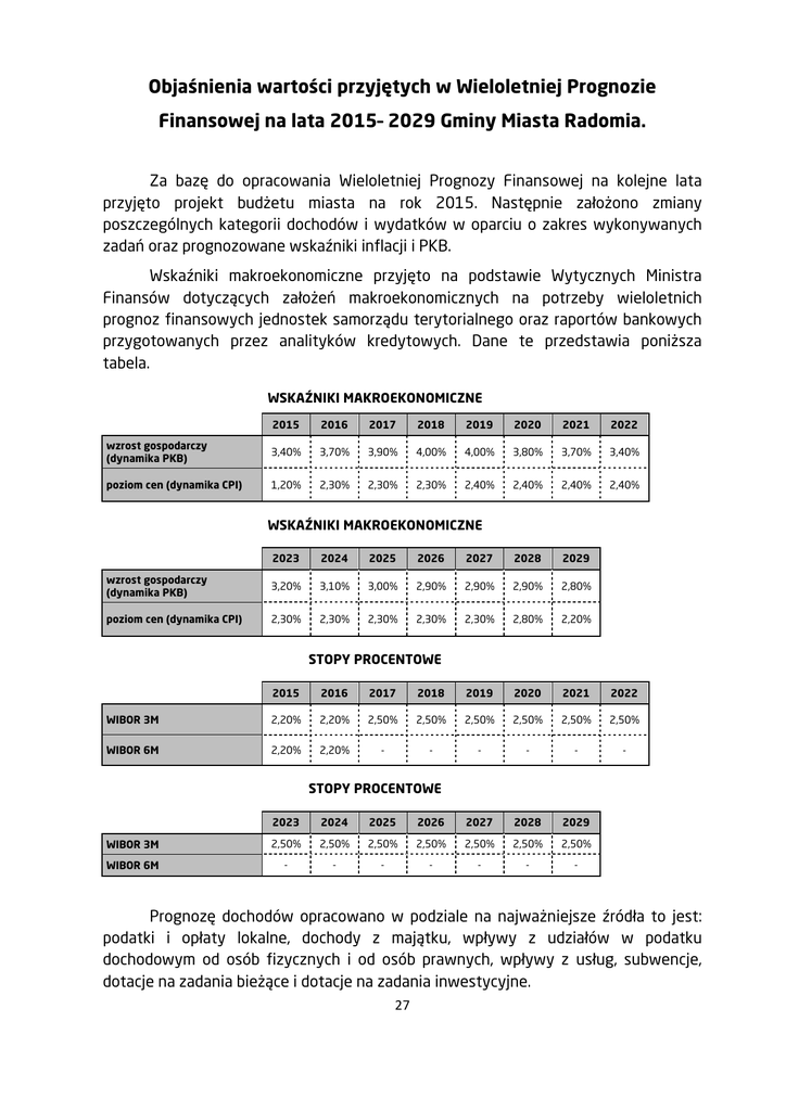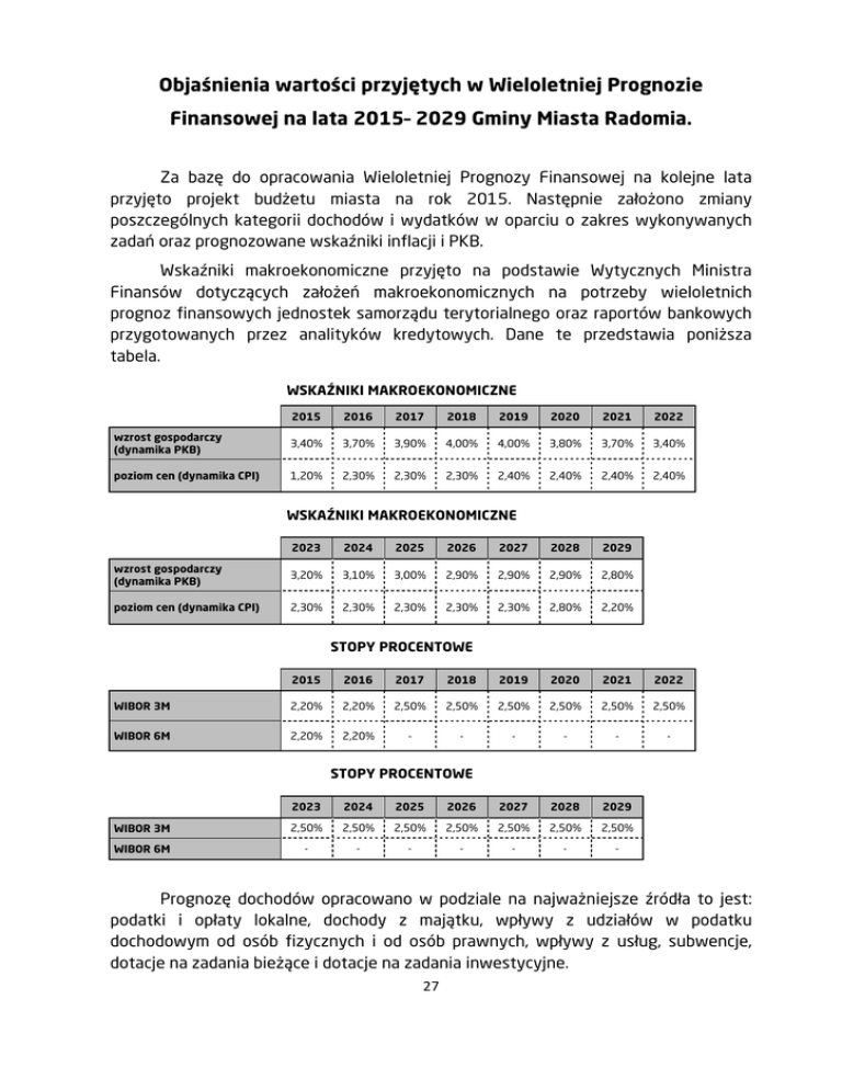 Objaśnienia wartości przyjętych w Wieloletniej Prognozie Finansowej na lata 2015– 2029 Gminy Miasta Radomia. Za bazę do opracowania Wieloletniej Prognozy Finansowej na kolejne lata przyjęto projekt budżetu miasta na rok 2015. Następnie założono zmiany poszczególnych kategorii dochodów i wydatków w oparciu o zakres wykonywanych zadań oraz prognozowane wskaźniki inflacji i PKB. Wskaźniki makroekonomiczne przyjęto na podstawie Wytycznych Ministra Finansów dotyczących założeń makroekonomicznych na potrzeby wieloletnich prognoz finansowych jednostek samorządu terytorialnego oraz raportów bankowych przygotowanych przez analityków kredytowych. Dane te przedstawia poniższa tabela. WSKAŹNIKI MAKROEKONOMICZNE 2015 2016 2017 2018 2019 2020 2021 2022 wzrost gospodarczy (dynamika PKB) 3,40% 3,70% 3,90% 4,00% 4,00% 3,80% 3,70% 3,40% poziom cen (dynamika CPI) 1,20% 2,30% 2,30% 2,30% 2,40% 2,40% 2,40% 2,40% WSKAŹNIKI MAKROEKONOMICZNE 2023 2024 2025 2026 2027 2028 2029 wzrost gospodarczy (dynamika PKB) 3,20% 3,10% 3,00% 2,90% 2,90% 2,90% 2,80% poziom cen (dynamika CPI) 2,30% 2,30% 2,30% 2,30% 2,30% 2,80% 2,20% STOPY PROCENTOWE 2015 2016 2017 2018 2019 2020 2021 2022 WIBOR 3M 2,20% 2,20% 2,50% 2,50% 2,50% 2,50% 2,50% 2,50% WIBOR 6M 2,20% 2,20% - - - - - - STOPY PROCENTOWE 2023 2024 2025 2026 2027 2028 2029 WIBOR 3M 2,50% 2,50% 2,50% 2,50% 2,50% 2,50% 2,50% WIBOR 6M - - - - - - - Prognozę dochodów opracowano w podziale na najważniejsze źródła to jest: podatki i opłaty lokalne, dochody z majątku, wpływy z udziałów w podatku dochodowym od osób fizycznych i od osób prawnych, wpływy z usług, subwencje, dotacje na zadania bieżące i dotacje na zadania inwestycyjne. 27 Poniżej zaprezentowano założenia dla najważniejszych dochodów budżetowych wskazując zastosowane współczynniki wzrostu oraz spodziewany realny wzrost w kolejnych latach prognozy finansowej. 1. Dochody z podatku od nieruchomości: Planuje się, że wartość dochodów z tego tytułu w latach 2016-2019 będzie się zmieniała odpowiednio do prognozowanego wskaźnika PKB oraz inflacji. Od 2020 roku do końca okresu prognozowanego wartość wzrostu dochodów z podatku od nieruchomości będzie odpowiadać dynamice PKB i połowy wartości poziomu cen. Zakłada się okresowe podwyższanie stawek podatkowych w kolejnych latach prognozy. Ponadto przewiduje się wzrost podstaw opodatkowania w związku z przyrostem powierzchni przeznaczonych na prowadzenie działalności gospodarczej. 2. Dochody z podatku od środków transportowych: Przyjęto założenie, że dochody te będą się zmieniały w tempie odpowiadającym prognozowanemu PKB oraz 10% wskaźnika inflacji w każdym roku prognozy. Dla uzyskania założonych wzrostów przyjęto okresowy wzrost stawek podatkowych. 3. Dochody z podatku od czynności cywilno-prawnych: Dochody te zaplanowano zgodnie z prognozowaną dynamiką PKB i połową zmiany wartości inflacji. 4. Dochody z opłaty skarbowej: Przyjęto założenie, że w kolejnych latach dochody będą rosnąć w stopniu odpowiadającym prognozowanej wielkości wzrostu gospodarczego oraz 10% prognozowanego wskaźnika inflacji. 5. Dochody ze sprzedaży mienia komunalnego: Z uwagi na malejący zasób nieruchomości komunalnych będących w dyspozycji miasta, dla potrzeb prognozy przyjęto redukcję dochodów z tytułu sprzedaży majątku średnio o 5% nominalnie, uwzględniając wzrost cen transakcyjnych o wskaźnik inflacji. 6. Dochody z dzierżawy i najmu składników majątkowych: Przewiduje się, że w okresie prognozy dochody te będą zmieniały się odpowiednio do prognozowanego wskaźnika inflacji oraz 50% PKB. Dochody z tego tytułu w kolejnych latach uzależnione są od kształtowania się popytu i poziomu cen na rynku nieruchomości. 7. Dochody z opłat za użytkowanie wieczyste: Dla dochodów z tego tytułu przyjęto niewielki wzrost nominalny odpowiadający planowanej inflacji. Przyjęto założenie, ze dochody te będą spadały z roku na rok w wyniku przekształcania prawa użytkowania wieczystego w prawo własności. 28 Zakłada się jednak okresowe przeszacowanie wartości nieruchomości, będącej podstawą do ustalenia opłaty za użytkowanie wieczyste. 8. Udziały w podatku dochodowym od osób fizycznych: W założeniach na lata 2016-2017 przyjęto planowany wzrost poziomu wynagrodzeń oraz zatrudnienia w gospodarce narodowej powiększony o połowę wskaźnika wzrostu PKB. W kolejnych latach prognozy przyjęto założenie, że dochody te będą zmieniały się w tempie odpowiadającym prognozowanemu wskaźnikowi inflacji. 9. Udziały w podatku dochodowym od osób prawnych: Wzrost tych dochodów zaplanowany jest w wielkości prognozowanego wskaźnika inflacji i częściowo wskaźnika PKB w stopniu odpowiadającym 50% prognozowanego wzrostu gospodarczego. 10.Subwencje: Wzrost dochodów z subwencji oświatowej na lata 2016-2020 przyjęto na poziomie wskaźnika wzrostu PKB. W kolejnych latach wartość tych dochodów zmienia się zgodnie z prognozowanym wskaźnikiem inflacji. Za podstawę ustalenia dochodów z pozostałych subwencji na kolejne lata trwania prognozy przyjęto 2015 rok powiększony o wskaźnik inflacji. 11.Dotacje na zadania własne (bieżące): Za podstawę do ustalenia wysokości tych dotacji dla lat objętych prognozą przyjęto wzrost indeksowany odpowiednio do wskaźnika inflacji. 12.Dotacje na zadania zlecone (bieżące): Za podstawę do ustalenia wysokości tych dotacji w roku 2016-2020 przyjęto zasadę ich wzrostu o wskaźnik inflacji powiększony o 1 p.p. od 2021 roku wzrost dotacji prognozowany jest odpowiednio do wskaźnika inflacji. 13.Dotacje na inwestycje: Za kwotę bazową dla tego tytułu dla roku 2016 przyjęto poziom dotacji inwestycyjnych zgodny z planem 2014 roku na dzień sporządzania prognozy, z wyłączeniem dotacji z Narodowego Programu Budowy Dróg Lokalnych. Kwoty obejmujące dotacje inwestycyjne na zadania własne i w ramach porozumień po