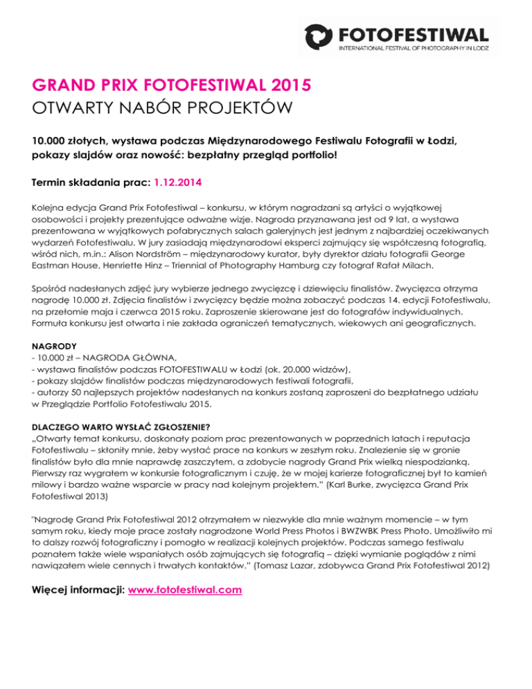 GRAND PRIX FOTOFESTIWAL 2015 OTWARTY NABÓR PROJEKTÓW 10.000 złotych, wystawa podczas Międzynarodowego Festiwalu Fotografii w Łodzi, pokazy slajdów oraz nowość: bezpłatny przegląd portfolio! Termin składania prac: 1.12.2014 Kolejna edycja Grand Prix Fotofestiwal – konkursu, w którym nagradzani są artyści o wyjątkowej osobowości i projekty prezentujące odważne wizje. Nagroda przyznawana jest od 9 lat, a wystawa prezentowana w wyjątkowych pofabrycznych salach galeryjnych jest jednym z najbardziej oczekiwanych wydarzeń Fotofestiwalu. W jury zasiadają międzynarodowi eksperci zajmujący się współczesną fotografią, wśród nich, m.in.: Alison Nordström – międzynarodowy kurator, były dyrektor działu fotografii George Eastman House, Henriette Hinz – Triennial of Photography Hamburg czy fotograf Rafał Milach. Spośród nadesłanych zdjęć jury wybierze jednego zwycięzcę i dziewięciu finalistów. Zwycięzca otrzyma nagrodę 10.000 zł. Zdjęcia finalistów i zwycięzcy będzie można zobaczyć podczas 14. edycji Fotofestiwalu, na przełomie maja i czerwca 2015 roku. Zaproszenie skierowane jest do fotografów indywidualnych. Formuła konkursu jest otwarta i nie zakłada ograniczeń tematycznych, wiekowych ani geograficznych. NAGRODY - 10.000 zł – NAGRODA GŁÓWNA, - wystawa finalistów podczas FOTOFESTIWALU w Łodzi (ok. 20.000 widzów), - pokazy slajdów finalistów podczas międzynarodowych festiwali fotografii, - autorzy 50 najlepszych projektów nadesłanych na konkurs zostaną zaproszeni do bezpłatnego udziału w Przeglądzie Portfolio Fotofestiwalu 2015. DLACZEGO WARTO WYSŁAĆ ZGŁOSZENIE? „Otwarty temat konkursu, doskonały poziom prac prezentowanych w poprzednich latach i reputacja Fotofestiwalu – skłoniły mnie, żeby wysłać prace na konkurs w zeszłym roku. Znalezienie się w gronie finalistów było dla mnie naprawdę zaszczytem, a zdobycie nagrody Grand Prix wielką niespodzianką. Pierwszy raz wygrałem w konkursie fotograficznym i czuję, że w mojej karierze fotograficznej był to kamień milowy i bardzo ważne wsparcie w pracy nad kolejnym projektem.” (Karl Burke, zwycięzca Grand Prix Fotofestiwal 2013) "Nagrodę Grand Prix Fotofestiwal 2012 otrzymałem w niezwykle dla mnie ważnym momencie – w tym samym roku, kiedy moje prace zostały nagrodzone World Press Photos i BWZWBK Press Photo. Umożliwiło mi to dalszy rozwój fotograficzny i pomogło w realizacji kolejnych projektów. Podczas samego festiwalu poznałem także wiele wspaniałych osób zajmujących się fotografią – dzięki wymianie poglądów z nimi nawiązałem wiele cennych i trwałych kontaktów.” (Tomasz Lazar, zdobywca Grand Prix Fotofestiwal 2012) Więcej informacji: www.fotofestiwal.com JURY Alison Nordström – międzynarodowy kurator, były dyrektor działu fotografii George Eastman House, USA Henriette Hinz – Triennial of Photography Hamburg, Niemcy Peggy Sue Amison – dyrektor artystyczna East Wing Dubai, Zjednoczone Emiraty Arabskie Krzysztof Candrowicz – dyrektor FOTOFESTIWALU Międzynarodowego Festiwalu Fotografii w Łodzi, Polska Alessandra Copadacqua – Studio Maragoni we Florencji, Włochy Anna-Kaisa Rastenberger – Fińskie Muzeum Fotografii, Finlandia Bill Kouwenhoven – niezależny krytyk fotografii, kurator, Wielka Brytania Erik Vroons – redaktor magazynu „GUP”, Holandia Adam Mazur – kurator, redaktor naczelny magazynu „SZUM”, Polska Rafał Milach – fotograf, współzałożyciel kolektywu Sputnik, Polska Marta Szymańska – Fundacja Archeologii Fotografii, Polska Jakub Śwircz – kurator i wykładowca, Polska ZWYCIĘZCY POPRZEDNICH EDYCJI GRAND PRIX FOTOFESTIWAL 2014 David Favrod „Gaijin” 2013 Karl Burke „Harvest of Death, vol.1” 2012 Tomasz Lazar „Linia życia” 2011 nagroda nie została przyznana 2010 Katrin Trautner „Morning Love” 2009 Christien Jaspars „Do“ 2008 Eric Vazzoler „Face me“ 2007 Arja Hyytiainen „Distance-Now" 2006 Andreas Pein „Wading“, Kai Bornhöft „True Colours“ WARUNKI UCZESTNICTWA Do nadsyłania zdjęć zapraszamy wszystkich fotografów. Program Grand Prix nie zakłada żadnych ograniczeń dotyczących tematu, techniki wykonania zdjęć lub ich ilości. Prosimy jednak o nieprzysyłanie pojedynczych zdjęć. Zależy nam na całych projektach – już skończonych lub będących na ukończeniu. Zgłoszenie należy przesyłać: - e-mailem na adres: [email protected] pliki graficzne muszą być w formacie jpg/tiff, a ich łączny rozmiar nie może przekroczyć 5 MB albo - osobiście lub pocztą, na adres: FUNDACJA EDUKACJI WIZUALNEJ ul. Tymienieckiego 3 90-365 Łódź Każda płyta musi być podpisana imieniem i nazwiskiem artysty; na kopercie prosimy umieścić napis Grand Prix 2015. W przypadku dostarczenia zgłoszenia pocztą decyduje data stempla pocztowego. Zgłoszenie powinno zawierać: - wypełniony formularz wraz z opisem projektu (dostępny na stronie www.fotofestiwal.com), - wszystkie prace wchodzących w skład projektu, - potwierdzenie opłaty (wydruk, skan). Jesteśmy organizacją non-profit i program Grand Prix jest projektem samofinansującym się (crowdfunding), dlatego też warunkiem uczestnictwa jest wniesienie opłaty rejestracyjnej w wysokości 100 zł (lub 35$ lub 25€). Opłata rejestracyjna powinna zostać wniesiona: - PRZELEWEM BANKOWYM na konto bankowe Organizatora PL 11 1050 1461 1000 0022 7202 7042 Nr BIC (SWIFT) INGBPLPW - PAY PAL lub KARTĄ KREDYTOWĄ Tytuł przelewu "Grand Prix 2015 - imię i nazwisko". Osoby posiadające konto w polskim banku prosimy o opłatę przelewem bankowym. Szczegółowe warunki uczestnictwa znajdują się w regulaminie. FOTOFESTIWAL – Międzynarodowy Festiwal Fotografii w Łodzi – spotkania, wystawy w całym mieście, dyskusje o fotografii, wyjątkowi ludzi, niezwykłe industrialne przestrzenie. FOTOFESTIWAL to miejsce spotkań dla wszystkich, dla których fotografia jest sposobem na życie. FOTOFESTIWAL je