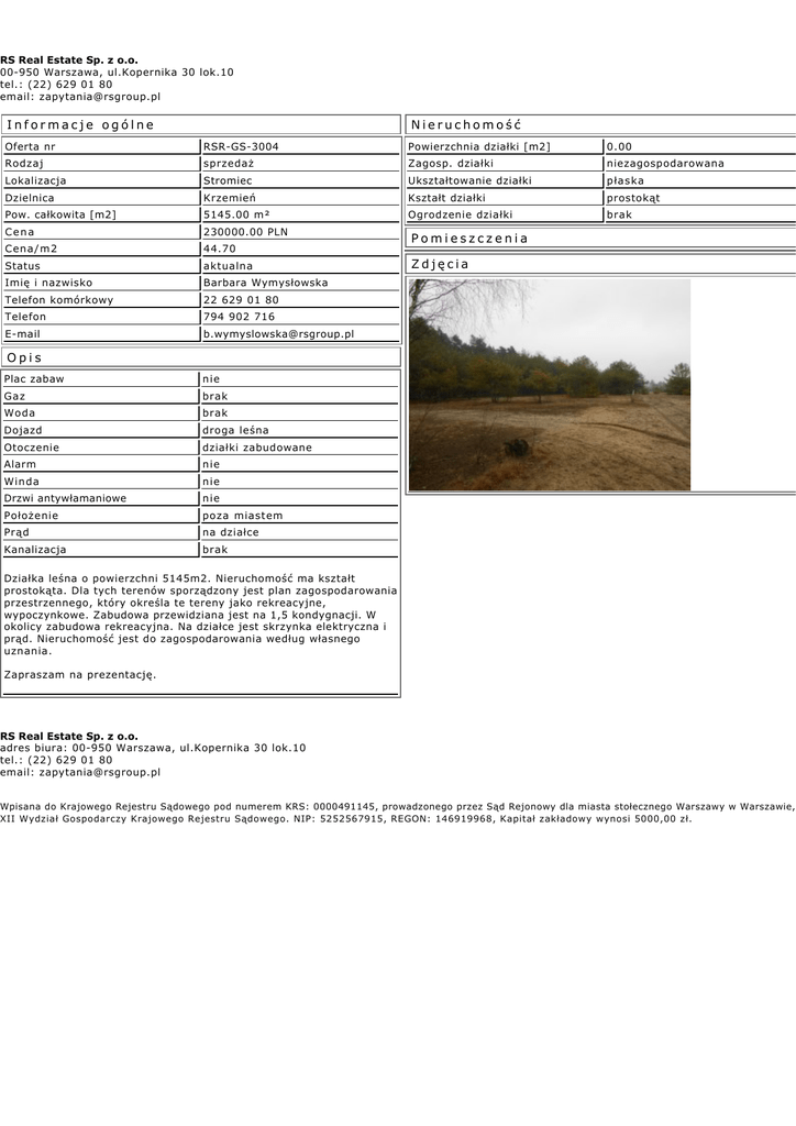 RS Real Estate Sp. z o.o. 00-950 Warszawa, ul.Kopernika 30 lok.10 tel.: (22) 629 01 80 email: [email protected] Informacje ogólne Nieruchomość Oferta nr RSR-GS-3004 Powierzchnia działki [m2] 0.00 Rodzaj sprzedaż Zagosp. działki niezagospodarowana Lokalizacja Stromiec Ukształtowanie działki płaska Dzielnica Krzemień Kształt działki prostokąt Pow. całkowita [m2] 5145.00 m² Ogrodzenie działki brak Cena 230000.00 PLN Cena/m2 44.70 Status aktualna Imię i nazwisko Barbara Wymysłowska Telefon komórkowy 22 629 01 80 Telefon 794 902 716 E-mail [email protected] Pomieszczenia Zdjęcia Opis Plac zabaw nie Gaz brak Woda brak Dojazd droga leśna Otoczenie działki zabudowane Alarm nie Winda nie Drzwi antywłamaniowe nie Położenie poza miastem Prąd na działce Kanalizacja brak Działka leśna o powierzchni 5145m2. Nieruchomość ma kształt prostokąta. Dla tych terenów sporządzony jest plan zagospodarowania przestrzennego, który określa te tereny jako rekreacyjne, wypoczynkowe. Zabudowa przewidziana jest na 1,5 kondygnacji. W okolicy zabudowa rekreacyjna. Na działce jest skrzynka elektryczna i prąd. Nieruchomość jest do zagospodarowania według własnego uznania. Zapraszam na prezentację. RS Real Estate Sp. z o.o. adres biura: 00-950 Warszawa, ul.Kopernika 30 lok.10 tel.: (22) 629 01 80 email: [email protected] Wpisana do Krajowego Rejestru Sądowego pod numerem KRS: 0000491145, prowadzonego przez Sąd Rejonowy dla miasta stołecznego Warszawy w Warszawie, XII Wydział Gospodarczy Krajowego Rejestru Sądowego. NIP: 5252567915, REGON: 146919968, Kapitał zakładowy wynosi 5000,00 zł.