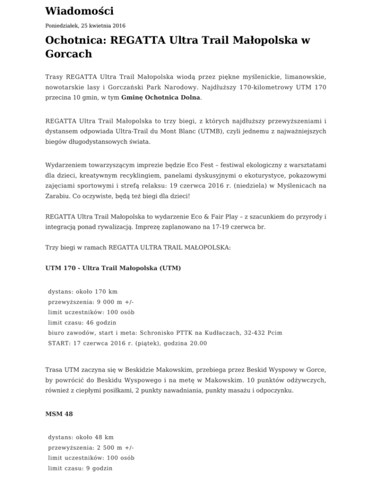 Wiadomości Poniedziałek, 25 kwietnia 2016 Ochotnica: REGATTA Ultra Trail Małopolska w Gorcach Trasy REGATTA Ultra Trail Małopolska wiodą przez piękne myślenickie, limanowskie, nowotarskie lasy i Gorczański Park Narodowy. Najdłuższy 170-kilometrowy UTM 170 przecina 10 gmin, w tym Gminę Ochotnica Dolna. REGATTA Ultra Trail Małopolska to trzy biegi, z których najdłuższy przewyższeniami i dystansem odpowiada Ultra-Trail du Mont Blanc (UTMB), czyli jednemu z najważniejszych biegów długodystansowych świata. Wydarzeniem towarzyszącym imprezie będzie Eco Fest – festiwal ekologiczny z warsztatami dla dzieci, kreatywnym recyklingiem, panelami dyskusyjnymi o ekoturystyce, pokazowymi zajęciami sportowymi i strefą relaksu: 19 czerwca 2016 r. (niedziela) w Myślenicach na Zarabiu. Co oczywiste, będą też biegi dla dzieci! REGATTA Ultra Trail Małopolska to wydarzenie Eco & Fair Play – z szacunkiem do przyrody i integracją ponad rywalizacją. Imprezę zaplanowano na 17-19 czerwca br. Trzy biegi w ramach REGATTA ULTRA TRAIL MAŁOPOLSKA: UTM 170 - Ultra Trail Małopolska (UTM) dystans: około 170 km przewyższenia: 9 000 m +/limit uczestników: 100 osób limit czasu: 46 godzin biuro zawodów, start i meta: Schronisko PTTK na Kudłaczach, 32-432 Pcim START: 17 czerwca 2016 r. (piątek), godzina 20.00 Trasa UTM zaczyna się w Beskidzie Makowskim, przebiega przez Beskid Wyspowy w Gorce, by powrócić do Beskidu Wyspowego i na metę w Makowskim. 10 punktów odżywczych, również z ciepłymi posiłkami, 2 punkty nawadniania, punkty masażu i odpoczynku. MSM 48 dystans: około 48 km przewyższenia: 2 500 m +/limit uczestników: 100 osób limit czasu: 9 godzin biuro zawodów, start i meta: Schronisko PTTK na Kudłaczach, 32-432 Pcim START: 18 czerwca 2016 r. (sobota), godzina 10.00 Trasa jest pętlą z 2 punktami odżywczymi i 2 punktami nawadniania. M10 dystans: około 10 km przewyższenia: 300 m +/limit uczestników: 100 osób limit czasu: 2 godziny biuro zawodów, start i meta: Myślenice – Zarabie START: 19 czerwca 2016 r. (niedziela), godzina 12.00 M10 jest dla osób, które rozpoczynają przygodę biegowa w górach. Zapisy i więcej informacji: www.ultratrailmalopolska.pl www.facebook.pl/UltraTrailMalopolska Patronat honorowy nad wydarzeniem objął Pan Jacek Krupa Marszałek Województwa Małopolskiego. Głównym Partnerem Sprzętowym imprezy jest Regatta – Polska Sp. z o.o. Patronem medialnym wydarzenia jest Ultra Trail Runner Magazyn oraz www.pieninyinfo.pl.