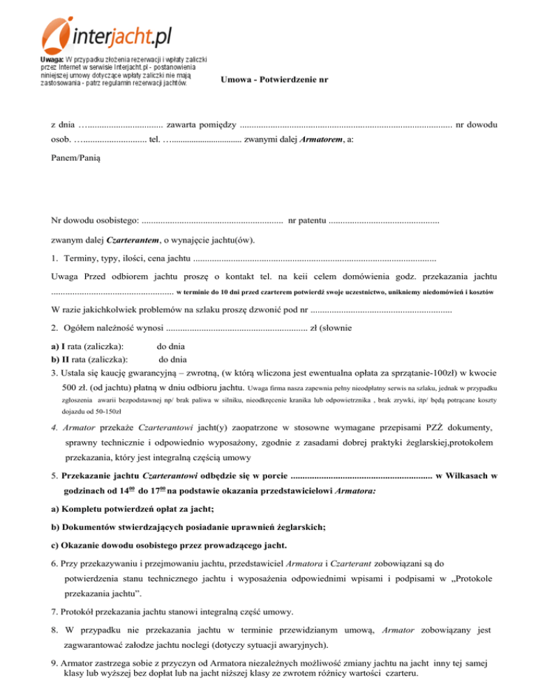 .................................................... w terminie do 10 dni przed czarterem potwierdź swoje uczestnictwo, unikniemy niedomówień i kosztów