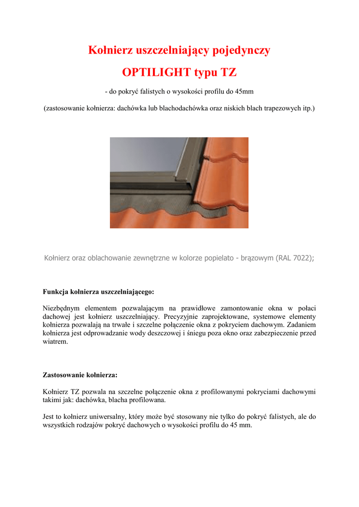 Kołnierz uszczelniający pojedynczy OPTILIGHT typu TZ - do pokryć falistych o wysokości profilu do 45mm (zastosowanie kołnierza: dachówka lub blachodachówka oraz niskich blach trapezowych itp.) Kołnierz oraz oblachowanie zewnętrzne w kolorze popielato - brązowym (RAL 7022); Funkcja kołnierza uszczelniającego: Niezbędnym elementem pozwalającym na prawidłowe zamontowanie okna w połaci dachowej jest kołnierz uszczelniający. Precyzyjnie zaprojektowane, systemowe elementy kołnierza pozwalają na trwałe i szczelne połączenie okna z pokryciem dachowym. Zadaniem kołnierza jest odprowadzanie wody deszczowej i śniegu poza okno oraz zabezpieczenie przed wiatrem. Zastosowanie kołnierza: Kołnierz TZ pozwala na szczelne połączenie okna z profilowanymi pokryciami dachowymi takimi jak: dachówka, blacha profilowana. Jest to kołnierz uniwersalny, który może być stosowany nie tylko do pokryć falistych, ale do wszystkich rodzajów pokryć dachowych o wysokości profilu do 45 mm. Budowa kołnierza: Kołnierz składa się z czterech podstawowych elementów (dolny element, dwa boczne i górny element). Dolny element kołnierza zakończony elastycznym fartuchem, posiada podklejoną od spodu masę plastyczną pozwalającą na przyklejenie kołnierza do pokrycia dachowego, przez co zapewniona jest szczelność połączenia. Wyposażony jest ponadto w rynienkę odwadniająca mającą na celu odprowadzenie skroplin pary wodnej z folii wstępnego krycia poza okno oraz boczne kliny uszczelniające zapewniające ochronę przed nawiewaniem pyłu, liści i śniegu. Elementy kołnierza: 1 — dolny element kołnierza z elastycznym fartuchem do profilowania (pozwala na wyprofilowanie elementu do pokryć falistych) 2 — elementy boczne 3 — górny element kołnierza 4 — paski z blachy do mocowania kołnierza 5 — rynienka odprowadzająca wodę 6 — kliny uszczelniające Kołnierz uszczelniający dopasowany jest wyłącznie do okien OptiLight www.oknadachowe.info.pl Źródło KRONMAT Sp. z o.o. gr. FAKRO