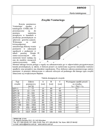 senco Karta katalogowa Zwężki Venturiego Koryta pomiarowe Venturiego zgodne z katalogiem UNIKLAR 77 przeznaczone są do pomiaru natężenia przepływu w kanałach o przekroju prostokątnym ze spływem grawita-cyjnym. Wykonane ze stali kwasoodpornej umożliwiają dokony-wanie pomiarów w zakresach zgodnych z podanymi w tabeli poniżej. Dzięki samo-czyszczącym własnościom koryt nadają się one do mediów niosących zanieczyszczenia stałe. Montaż takiego koryta polega z reguły na zabetonowaniu go w odpowiednio przygotowanym kanale prostokątnym, tj. takim, w którym przed i za zachowane są pewne minimalne wartości spadków oraz przepływ ma charakter uspokojony. Przy doborze zakresu pomiarowego należy pamiętać, iż pomiary dokonywane w zakresie niższym od podanego dla danego typu zwężki obarczone są zwiększonym błędem. Tabela dostępnych zwężek Typ zwężki KPV I KPV II KPV III KPV IV KPV V KPV VI KPV VII KPV VIII KPV IX KPV X KPV XI Zakres pomiarowy [m3/h] 1 – 73 22 – 175 55 - 395 94 – 529 101 – 725 179 – 1241 533 – 2126 402 – 3402 426 – 4914 1171 – 6909 1825 10129 A [cm] B [cm] C [cm] 15 20 30 40 50 60 80 100 120 150 180 40 60 70 70 80 90 120 150 160 180 180 67 90 135 180 230 270 360 450 570 715 850 Wymagane spadki przed i za zwężką Ido< [‰] < Iod 8,7 8 7 6 6 6 5 4,5 4,0 3,5 3,5 senco sp. z o.o. ul. Adama Asnyka 23/1, 51-143 Wrocław Tel. 071 325-34-83, 071 325-12-25, Fax. 071 325-29-28, Tel. Kom. 600 37-94-62 e-mail: [email protected] www.senco.com.pl