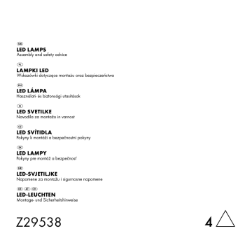 LED Lamps A ssembly and safety advice L ampki LED Wskazówki dotyczące montażu oraz bezpieczeństwa L ED lámpa H asználati- és biztonsági utasítások LED svetilke N avodila za montažo in varnost LED svítidla P okyny k montáži a bezpečnostní pokyny LED lampy P okyny pre montáž a bezpečnosť LED-svjetiljke N apomene za montažu i sigurnosne napomene LED-Leuchten M ontage- und Sicherheitshinweise Z 29538 4 GB PL HU SI CZ SK HR DE / AT / CH Assembly and safety advice Wskazówki dotyczące montażu oraz bezpieczeństwa Használati- és biztonsági utasítások Navodila za montažo in varnost Pokyny k montáži a bezpečnostní pokyny Pokyny pre montáž a bezpečnosť Napomene za montažu i sigurnosne napomene Montage- und Sicherheitshinweise Page 4 Strona 8 Oldal 12 Stran 16 Strana 20 Strana 24 Stranica28 Seite 32 A 5 + + - - + + + - 3 x 1 B 3 x 2 3 x 3 + 4 C 3 3 + 4 + - + - + - - + 2 + 3 Introduction LED lamps Q Q Introduction The instructions for use are to be considered as part of the product. They contain important information concerning safety, use and disposal. Before using the product, please familiarise yourself with all of the safety information and instructions for use. The product must only be used as described and for the stated fields of application. If you pass the product on to third parties, please give them all of the documentation as well. Q Intended Use This LED lamp set is suitable exclusively for providing illumination in dry interior rooms in a private, domestic environment. The light is intended for battery operation only. Other uses or changes to the product are considered to be contrary to the intended use and may harbour risks of injury and damage. The manufacturer does not accept any liability for injury or damage resulting from use of this product contrary to its intended use. The product is not intended to be used for commercial purposes. 4 GB 1 2 3 4 5 Q Description of parts LED lamp Battery compartment Battery compartment cover Self-adhesive pad Bulb Technical data Illuminant:3 x LEDs, LED class 2 (the LEDs cannot be replaced) Batteries:3 x 1.5 V , AAA Type (not included) CAUTION! RISK OF INJURY TO EYES! The LEDs used comply with LED class 2. Never look into the beam of the LED. LED RADIATION DO NOT STARE INTO THE BEAM! LED CLASS 2 EN 60825–1: 1994+A2:2001+A1:2002 P < 0.32 mW λ = 447 nm Q Includes Immediately after unpacking please check the package contents for completeness and if all parts and the product are in good condition. Do not under any circumstances use the product if the delivery is incomplete. 3 x LED lamps 1 x Instruction manual General Safety Instructions Keep all the safety advice and instructions in a safe place for future reference! J Warning! DANGER OF DEATH AND ACCIDENTS FOR TODDLERS AND CHILDREN! Never leave children unsupervised with the packaging material. The packaging material represents a danger of suffocation. Children frequently underestimate the dangers. Always keep children away from the packaging material. This is not a toy. J Children or other individuals who do not know or have no experience of handling this device, or whose physical, sensory or mental abilities are restricted, must not use the device without supervision or instruction by an individual Introduction / General Safety Instructions responsible for their safety. Children must be supervised in order to ensure that they do not play with the device. m CAUTION! RISK OF INJURY! Please do not use this device if you find that it is damaged in any way. J Check whether all of the parts are correctly fitted. If the device is not correctly assembled there is a danger of injury. J Keep the product away from humidity. J CAUTION! LED RADIATION! Avoid damage to the eyes! Never look into the beam of the LED. Never use optical devices such as magnifying glasses or similar to look into the beam of the LED. Protect yourself and your environment by taking proper precautions. J Never point the LED beam at reflective surfaces, people or animals. This could result in blindness or irritation of the eyes. Even weak LED radiation could lead to eye injuries. J Do not subject the device to any extreme temperatures or severe mechanical stress. Otherwise this may result in deformation of the product. GB 5 General Safety Instructions / Bringing into use attery Safety B Instructions Warning! DANGER TO LIFE! Keep batteries out of the reach of children. Do not leave batteries lying around. There is a risk of children or animals swallowing them. Consult a doctor immediately if a battery is swallowed. J EXPLOSION HAZARD! Never recharge nonrechargeable batteries, short-circuit and / or open batteries. This can cause them to overheat, burn or burst. Never throw batteries into fire or water. The batteries may explode. J Remove spent batteries from the product immediately. Otherwise there is an increased risk of leakage. J Always replace all batteries at the same time and only use batteries of the same type. J Do not use different types of batteries or mix used and new batteries together. J Check regularly that the batteries are not leaking. J Leaked or damaged batteries can cause chemical burns if they come into contact with the skin; in such cases you must wear suitable protective gloves. J Remove the batteries from the product if it is not in use for any length of time. J Make sure that the polarity is correct when you insert the batteries. This is indicated in the battery compartment. The batteries can otherwise explode. 6 GB J R emove used batteries from the device. Very old or used batteries may leak. The chemical fluid can damage the product. Q Bringing into use Q Inserting/replacing the batteries j T urn the battery compartment cover 3 anticlockwise and take it off the battery compartment 2 (see Fig. A). j Insert the (new) batteries into the battery compartment 2 . Note: Make sure you fit the batteries the right way round (polarity). The correct polarity is shown inside the batte