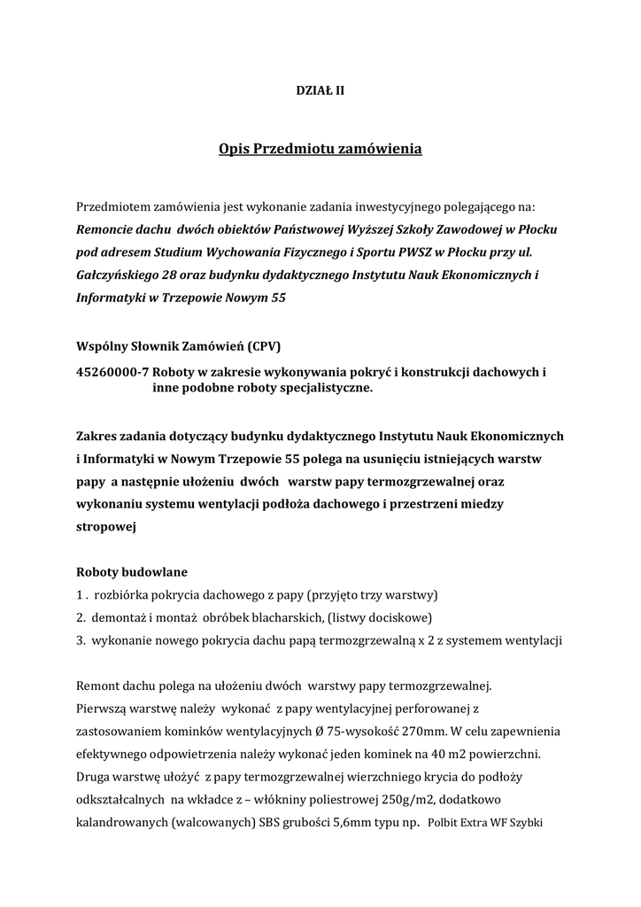 DZIAŁ II Opis Przedmiotu zamówienia Przedmiotem zamówienia jest wykonanie zadania inwestycyjnego polegającego na: Remoncie dachu dwóch obiektów Państwowej Wyższej Szkoły Zawodowej w Płocku pod adresem Studium Wychowania Fizycznego i Sportu PWSZ w Płocku przy ul. Gałczyńskiego 28 oraz budynku dydaktycznego Instytutu Nauk Ekonomicznych i Informatyki w Trzepowie Nowym 55 Wspólny Słownik Zamówień (CPV) 45260000-7 Roboty w zakresie wykonywania pokryć i konstrukcji dachowych i inne podobne roboty specjalistyczne. Zakres zadania dotyczący budynku dydaktycznego Instytutu Nauk Ekonomicznych i Informatyki w Nowym Trzepowie 55 polega na usunięciu istniejących warstw papy a następnie ułożeniu dwóch warstw papy termozgrzewalnej oraz wykonaniu systemu wentylacji podłoża dachowego i przestrzeni miedzy stropowej Roboty budowlane 1 . rozbiórka pokrycia dachowego z papy (przyjęto trzy warstwy) 2. demontaż i montaż obróbek blacharskich, (listwy dociskowe) 3. wykonanie nowego pokrycia dachu papą termozgrzewalną x 2 z systemem wentylacji Remont dachu polega na ułożeniu dwóch warstwy papy termozgrzewalnej. Pierwszą warstwę należy wykonać z papy wentylacyjnej perforowanej z zastosowaniem kominków wentylacyjnych Ø 75-wysokość 270mm. W celu zapewnienia efektywnego odpowietrzenia należy wykonać jeden kominek na 40 m2 powierzchni. Druga warstwę ułożyć z papy termozgrzewalnej wierzchniego krycia do podłoży odkształcalnych na wkładce z – włókniny poliestrowej 250g/m2, dodatkowo kalandrowanych (walcowanych) SBS grubości 5,6mm typu np. Polbit Extra WF Szybki Profil SBS Przestrzeń między stropową należy z wentylować wykonując otwory wentylacyjne w płytach OSB po trzy na każdej płaszczyźnie dachu w pobliżu kalenicy oraz zamontować wywiewki wentylacyjne Ø 110-wysokości 350mm. Przed ułożeniem wierzchniej warstwy papy należy uszczelnić wszystkie wywietrzaki dachowe, podpórki odgromników, kominy i wszystkie elementy wystające ponad dach Wywinięcia papy na ściany należy doszczelnić listwą dociskową Podłoże na którym przewidziano ułożenie papy stanowią dwie skręcone ze sobą warstwy płyty OSB-3. Po zdjęciu papy należy wykonać przegląd płyt OSB-3 pod względem ewentualnego zawilgocenia, spęcznienia, wyprofilowania podłoża, zespolenia obu warstw płyt oraz przydatności ich do dalszej eksploatacji. Powyższe uwagi należy uwzględnić w wycenie w celu ewentualnej wymiany uszkodzonych fragmentów płyt oraz zwiększeniu ilości zastosowanych wkrętów do osiągnięcia prawidłowej sztywności i wytrzymałości istniejącego podłoża Przed ułożeniem papy należy starannie oczyścić i zamieść stare podłoże. Wszystkie ewentualne ubytki podłoża powinny być uzupełnione i wyrównane Następnie zagruntować podłoże podkładem gruntującym Simplast Primer SBS szybki grunt. Wykonując prace demontażowe należy każdorazowo zabezpieczyć odkrytą powierzchnie poszycia dachu przed nasiąkaniem bądź zalaniem przez wody opadowe. Zakres zadania dotyczący budynku dydaktycznego Studium Wychowania Fizycznego i Sportu ; Roboty budowlane 1 . rozbiórka pokrycia dachowego z papy (przyjęto trzy warstwy) 2. rozbiórka rynien nie nadających się do użytku 3. rozbiórka rur spustowych z blachy nie nadających się do użytku 4. wymiana obróbek blacharskich ,gzymsów, okapów, kołnierzy itp. 5. wykonanie nowego pokrycia dachu papą termozgrzewalną x 2 6. montaż nowych rynien i rur spustowych Remont dachu polega na ułożeniu dwóch warstwy papy termozgrzewalnej. Pierwszą warstwę należy wykonać z papy wentylacyjnej perforowanej z zastosowaniem kominków wentylacyjnych. W celu zapewnienia efektywnego odpowietrzenia należy wykonać jeden kominek na 40 m2 powierzchni. Druga warstwę ułożyć z papy termozgrzewalnej wierzchniego krycia na wkładce z – włókniny poliestrowej 250g/m2, SBS grubości 5,6mm. typu np. Polbit Extra WF Szybki Profil SBS Przed ułożeniem wierzchniej warstwy papy należy doszczelnić wszystkie wywietrzaki dachowe, podpórki odgromników, kominy i wszystkie elementy wystające ponad dach Wywinięcia papy na ściany należy doszczelnić listwą dociskową Podłoże na którym przewidziano ułożenie papy stanowi betonowa warstwa spadkowa ułożona na żelbetowych płytach panwiowych stanowiących konstrukcję dachu. Przed ułożeniem papy należy starannie oczyścić i zamieść stare podłoże. Wszystkie ewentualne ubytki podłoża powinny być uzupełnione i wyrównane Następnie zagruntować podłoże podkładem gruntującym Simplast Primer SBS szybki grunt. Obróbki blacharskie typu pas pod rynnowy, ogniomury, rynny i rury spustowe należy odtworzyć według istniejących wymiarów (wzorów) Wykonując prace demontażowe należy każdorazowo zabezpieczyć odkrytą powierzchnie poszycia dachu przed nasiąkaniem bądź zalaniem istniejących pomieszczeń przez wody opadowe. Papę z rozbiórki oraz jej odpady należy wywieść i zutylizować oraz przedstawić dokument z utylizacji. Na zamontowane wyroby budowlane należy przedstawić aprobaty techniczne oraz deklaracje zgodności. Na zastosowane materiały należy przed ich wbudowaniem uzyskać akceptację Zamawiającego. Załączone przedmiary robót mają charakter informacyjny, i nie są obligatoryjne dla wykonawcy, mogą być traktowane tylko jako pomocnicze do przygotowania oferty cenowej. Oznacza to, że wykonawca sporządza przedmiar robót według własnego uznania i dokonuje całościowej wyceny przedmiotu. Zaleca się by wykonawca dokonał wizji lokalnej na obiekcie przed sporządzeniem kosztorysu ofertowego w celu uniknięcia ewentualnych błędów w wycenie robót. Podczas realizacji robót Wykonawca będzie przestrzegał przepisów dotyczących bezpieczeństwa i higieny pracy. W szczególności Wykonawca ma obowiązek zadbać, aby personel nie wykonywał pracy w warunkach niebezpiecznych, szkodliwych dla zdrowia oraz niespełniających o