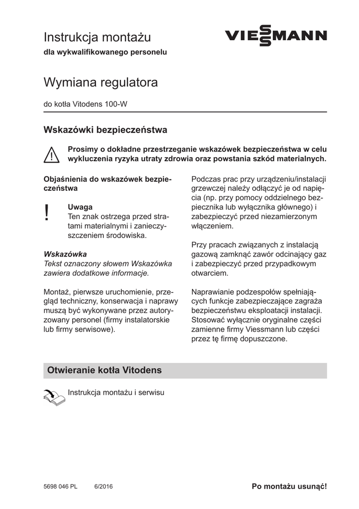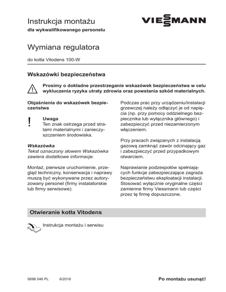 Instrukcja montażu VIESMANN dla wykwalifikowanego personelu Wymiana regulatora do kotła Vitodens 100-W Wskazówki bezpieczeństwa Prosimy o dokładne przestrzeganie wskazówek bezpieczeństwa w celu wykluczenia ryzyka utraty zdrowia oraz powstania szkód materialnych. Objaśnienia do wskazówek bezpieczeństwa ! Uwaga Ten znak ostrzega przed stratami materialnymi i zanieczyszczeniem środowiska. Wskazówka Tekst oznaczony słowem Wskazówka zawiera dodatkowe informacje. Montaż, pierwsze uruchomienie, przegląd techniczny, konserwacja i naprawy muszą być wykonywane przez autoryzowany personel (firmy instalatorskie lub firmy serwisowe). Podczas prac przy urządzeniu/instalacji grzewczej należy odłączyć je od napięcia (np. przy pomocy oddzielnego bezpiecznika lub wyłącznika głównego) i zabezpieczyć przed niezamierzonym włączeniem. Przy pracach związanych z instalacją gazową zamknąć zawór odcinający gaz i zabezpieczyć przed przypadkowym otwarciem. Naprawianie podzespołów spełniających funkcje zabezpieczające zagraża bezpieczeństwu eksploatacji instalacji. Stosować wyłącznie oryginalne części zamienne firmy Viessmann lub części przez tę firmę dopuszczone. Otwieranie kotła Vitodens Instrukcja montażu i serwisu 5698 046 PL 6/2016 Po montażu usunąć! Wymiana regulatora ! Uwaga Wyładowania elektrostatyczne mogą doprowadzić do uszkodzenia podzespołów elektronicznych. 4. Przed rozpoczęciem prac należy zetknąć uziemione obiekty, np. rury grzewcze i wodociągowe, w celu neutralizacji ładunków elektrostatycznych. 5. 7. 2. 6. 2x 1. 3. 01. Nacisnąć hak mocujący z boku. 04. Wyjąć wszystkie wtyki z regulatora. 02. Przechylić regulator do przodu. 05. Nacisnąć hak mocujący z boku i wyjąć manometr z obudowy regulatora. 03. Zdjąć pokrywę. 2 5698 046 PL 4x Wymiana regulatora (ciąg dalszy) 06. Odkręcić 2 śruby przy zawiasach i wyjąć regulator. 09. Zamontować manometr w obudowie regulatora. 07. Zdjąć regulator z komory powietrznej. 10. Włożyć wszystkie wtyki regulatora. 08. Zamocować nowy regulator na komorze powietrznej za pomocą 2 śrub. Dopasowanie regulatora do kotła grzewczego Dokonać ustawień nowego regulatora odpowiednio do kotła grzewczego. Wybrać i ustawić właściwy zestaw parametrów. 07. Za pomocą / ustawić „7”. 08. OK w celu potwierdzenia. Z prawej strony na wyświetlaczu miga „1”. 01. Włączyć zasilanie wyłącznikiem. 02. Nacisnąć przycisk MODE. 03. Naciskać przycisk / , aż CONFI zacznie migać. 04. OK w celu potwierdzenia. Z lewej strony na wyświetlaczu pojawia się „P”. Prawa strona wyświetlacza miga. 09. Zgodnie z poniższą tabelą i nr fabrycznym (patrz tabliczka znamionowa) wybrać zestaw parametrów odpowiedni dla danego kotła grzewczego. 10. Za pomocą / ustawić regulator odpowiednio do zestawu parametrów. 11. OK w celu potwierdzenia. 05. Za pomocą / ustawić „12”. 12. Wyłączyć i ponownie włączyć wyłącznik zasilania. Ustawiony zestaw parametrów zostaje zapamiętany. 5698 046 PL 06. OK w celu potwierdzenia. Z lewej strony na wyświetlaczu miga „1”. 3 Dopasowanie regulatora do kotła grzewczego (ciąg dalszy) Zestaw parametrów Nr 2 3 1 4 6 2 10 12 3 5 1 9 11 4 6 13 7 8 10 12 1 11 4 6 2 10 14 1 11 2 10 12 3 5 1 5698 046 PL Nr fabryczny (Tabliczka znamionowa) 7560853 7560854 7560855 7570661 7570662 7570663 7570664 7570665 7570666 7570667 7570668 7570669 7570670 7570671 7570672 7570673 7570674 7570675 7570676 7570677 7570678 7570679 7570680 7570681 7570682 7570683 7570684 7570685 7570686 7570689 7570690 7570691 7570692 7570693 7570694 4 Zmiana rodzaju gazu na regulatorze Wskazówka Tylko przy eksploatacji z gazem płynnym należy zmienić rodzaj gazu. W stanie fabrycznym regulator ustawiony jest na eksploatację z gazem ziemnym. 01. Włączyć zasilanie wyłącznikiem. 02. Nacisnąć przycisk MODE. 03. Naciskać przycisk / aż CONFI zacznie migać. 08. OK w celu potwierdzenia. Z prawej strony na wyświetlaczu miga „0”. 04. OK w celu potwierdzenia. Z lewej strony na wyświetlaczu pojawia się „P”. Prawa strona wyświetlacza miga. 09. Przyciskami / przestawić regulator na dostępny rodzaj gazu. ■ „0” dla eksploatacji z gazem ziemnym lub ■ „1” dla eksploatacji na gaz płynny. 05. Za pomocą / ustawić „12”. 10. OK w celu potwierdzenia. 06. OK w celu potwierdzenia. Z lewej strony na wyświetlaczu miga „1”. 11. Wyłączyć i ponownie włączyć wyłącznik zasilania. Ustawiony tryb pracy zostaje zapamiętany. 07. Za pomocą / ustawić „5”. Dopasowanie mocy palnika do instalacji spalinowej Instrukcja montażu i serwisu Zamykanie regulatora i uruchamianie kotła 3. Uruchomić kocioł grzewczy i sprawdzić działanie instalacji. 2. Zamontować blachę przednią. Instrukcja montażu i serwisu 5698 046 PL 1. Zamknąć obudowę regulator i odchylić regulator do góry. 5 6 5698 046 PL 7 5698 046 PL 8 Zmiany techniczne zastrzeżone! 5698 046 PL Viessmann Sp. z o.o. ul. Gen. Ziętka 126 41 - 400 Mysłowice tel.: (801) 0801 24 (32) 22 20 330 mail: [email protected] www.viessmann.pl