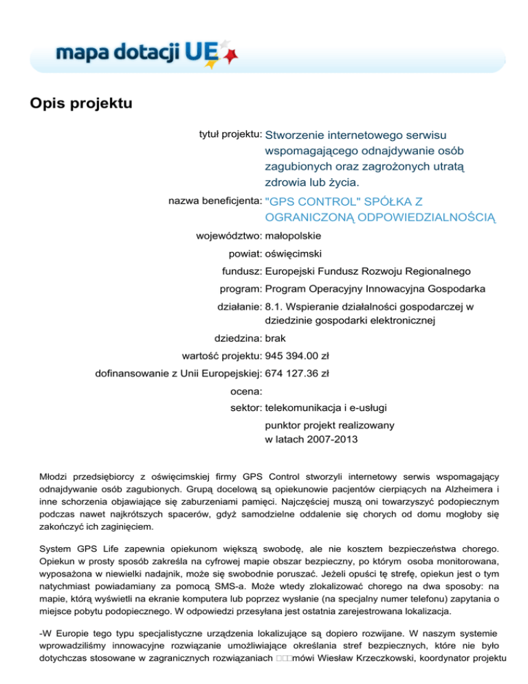 Opis projektu tytuł projektu: Stworzenie internetowego serwisu wspomagającego odnajdywanie osób zagubionych oraz zagrożonych utratą zdrowia lub życia. nazwa beneficjenta: "GPS CONTROL" SPÓŁKA Z OGRANICZONĄ ODPOWIEDZIALNOŚCIĄ województwo: małopolskie powiat: oświęcimski fundusz: Europejski Fundusz Rozwoju Regionalnego program: Program Operacyjny Innowacyjna Gospodarka działanie: 8.1. Wspieranie działalności gospodarczej w dziedzinie gospodarki elektronicznej dziedzina: brak wartość projektu: 945 394.00 zł dofinansowanie z Unii Europejskiej: 674 127.36 zł ocena: sektor: telekomunikacja i e-usługi punktor projekt realizowany w latach 2007-2013 Młodzi przedsiębiorcy z oświęcimskiej firmy GPS Control stworzyli internetowy serwis wspomagający odnajdywanie osób zagubionych. Grupą docelową są opiekunowie pacjentów cierpiących na Alzheimera i inne schorzenia objawiające się zaburzeniami pamięci. Najczęściej muszą oni towarzyszyć podopiecznym podczas nawet najkrótszych spacerów, gdyż samodzielne oddalenie się chorych od domu mogłoby się zakończyć ich zaginięciem. System GPS Life zapewnia opiekunom większą swobodę, ale nie kosztem bezpieczeństwa chorego. Opiekun w prosty sposób zakreśla na cyfrowej mapie obszar bezpieczny, po którym osoba monitorowana, wyposażona w niewielki nadajnik, może się swobodnie poruszać. Jeżeli opuści tę strefę, opiekun jest o tym natychmiast powiadamiany za pomocą SMS-a. Może wtedy zlokalizować chorego na dwa sposoby: na mapie, którą wyświetli na ekranie komputera lub poprzez wysłanie (na specjalny numer telefonu) zapytania o miejsce pobytu podopiecznego. W odpowiedzi przesyłana jest ostatnia zarejestrowana lokalizacja. -W Europie tego typu specjalistyczne urządzenia lokalizujące są dopiero rozwijane. W naszym systemie wprowadziliśmy innowacyjne rozwiązanie umożliwiające określania stref bezpiecznych, które nie było dotychczas stosowane w zagranicznych rozwiązaniach ጀ mówi Wiesław Krzeczkowski, koordynator projektu GPS Life. Z aplikacji mogą korzystać także osoby po zawale, epileptycy, cukrzycy, czyli wszyscy obawiający się, że w chwili zagrożenia nie zdążą powiadomić swoich bliskich. Naciśnięcie w urządzeniu lokalizującym mobilnego Ḁ瀀爀稀礀挀椀猀欀甀 życia ᴀ sprawia, że rodzina otrzymuje SMS-a informującego o tym, gdzie w danej chwili znajduje się chory.