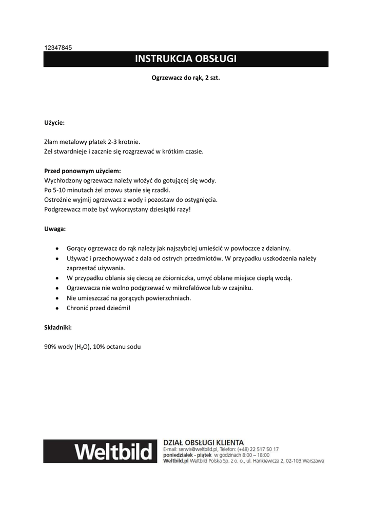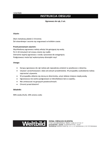 12347845 INSTRUKCJA OBSŁUGI Ogrzewacz do rąk, 2 szt. Użycie: Złam metalowy płatek 2-3 krotnie. Żel stwardnieje i zacznie się rozgrzewać w krótkim czasie. Przed ponownym użyciem: Wychłodzony ogrzewacz należy włożyć do gotującej się wody. Po 5-10 minutach żel znowu stanie się rzadki. Ostrożnie wyjmij ogrzewacz z wody i pozostaw do ostygnięcia. Podgrzewacz może być wykorzystany dziesiątki razy! Uwaga: Gorący ogrzewacz do rąk należy jak najszybciej umieścić w powłoczce z dzianiny. Używać i przechowywać z dala od ostrych przedmiotów. W przypadku uszkodzenia należy zaprzestać używania. W przypadku oblania się cieczą ze zbiorniczka, umyć oblane miejsce ciepłą wodą. Ogrzewacza nie wolno podgrzewać w mikrofalówce lub w czajniku. Nie umieszczać na gorących powierzchniach. Chronić przed dziećmi! Składniki: 90% wody (H2O), 10% octanu sodu