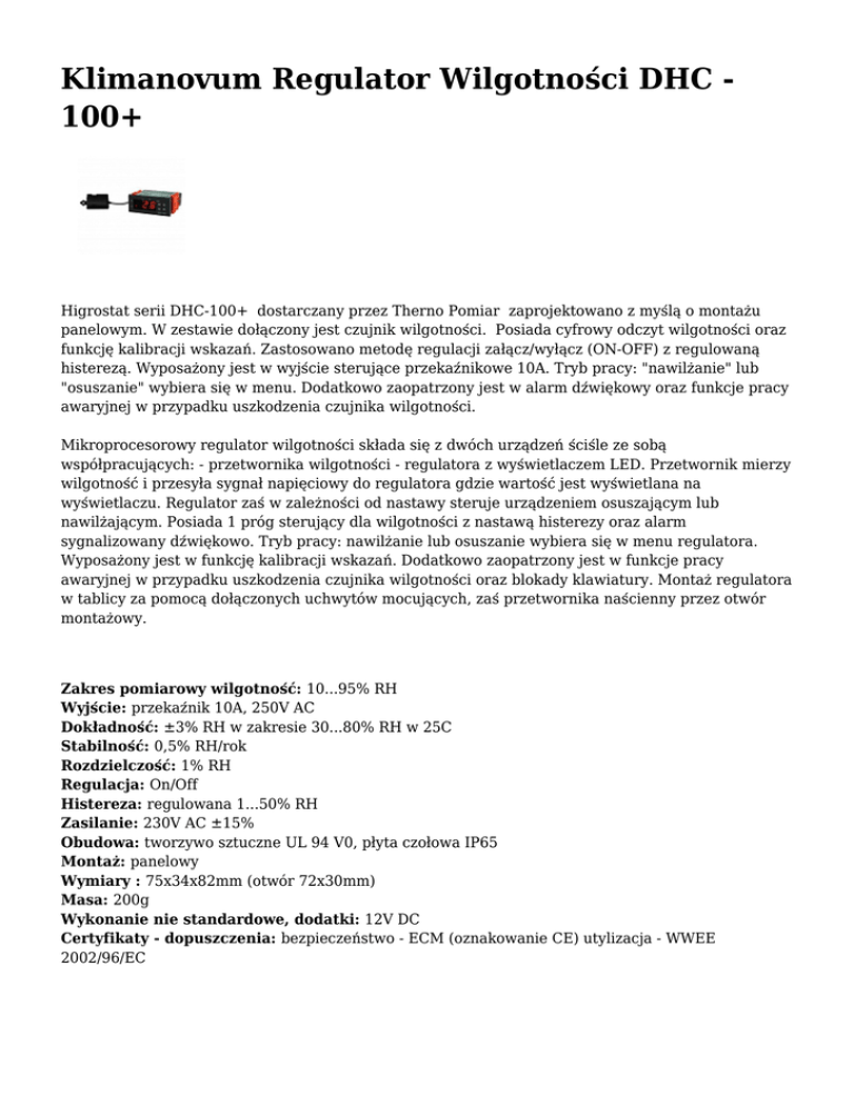Klimanovum Regulator Wilgotności DHC 100+ Higrostat serii DHC-100+ dostarczany przez Therno Pomiar zaprojektowano z myślą o montażu panelowym. W zestawie dołączony jest czujnik wilgotności. Posiada cyfrowy odczyt wilgotności oraz funkcję kalibracji wskazań. Zastosowano metodę regulacji załącz/wyłącz (ON-OFF) z regulowaną histerezą. Wyposażony jest w wyjście sterujące przekaźnikowe 10A. Tryb pracy: "nawilżanie" lub "osuszanie" wybiera się w menu. Dodatkowo zaopatrzony jest w alarm dźwiękowy oraz funkcje pracy awaryjnej w przypadku uszkodzenia czujnika wilgotności. Mikroprocesorowy regulator wilgotności składa się z dwóch urządzeń ściśle ze sobą współpracujących: - przetwornika wilgotności - regulatora z wyświetlaczem LED. Przetwornik mierzy wilgotność i przesyła sygnał napięciowy do regulatora gdzie wartość jest wyświetlana na wyświetlaczu. Regulator zaś w zależności od nastawy steruje urządzeniem osuszającym lub nawilżającym. Posiada 1 próg sterujący dla wilgotności z nastawą histerezy oraz alarm sygnalizowany dźwiękowo. Tryb pracy: nawilżanie lub osuszanie wybiera się w menu regulatora. Wyposażony jest w funkcję kalibracji wskazań. Dodatkowo zaopatrzony jest w funkcje pracy awaryjnej w przypadku uszkodzenia czujnika wilgotności oraz blokady klawiatury. Montaż regulatora w tablicy za pomocą dołączonych uchwytów mocujących, zaś przetwornika naścienny przez otwór montażowy. Zakres pomiarowy wilgotność: 10...95% RH Wyjście: przekaźnik 10A, 250V AC Dokładność: ±3% RH w zakresie 30...80% RH w 25C Stabilność: 0,5% RH/rok Rozdzielczość: 1% RH Regulacja: On/Off Histereza: regulowana 1...50% RH Zasilanie: 230V AC ±15% Obudowa: tworzywo sztuczne UL 94 V0, płyta czołowa IP65 Montaż: panelowy Wymiary : 75x34x82mm (otwór 72x30mm) Masa: 200g Wykonanie nie standardowe, dodatki: 12V DC Certyfikaty - dopuszczenia: bezpieczeństwo - ECM (oznakowanie CE) utylizacja - WWEE 2002/96/EC KONTAKT Klimanovum E-mail: [email protected] WWW: www.klimanovum.pl Tel: 792 432 145 Adres: gen. Franciszka Włada 1 99-400 Łowicz