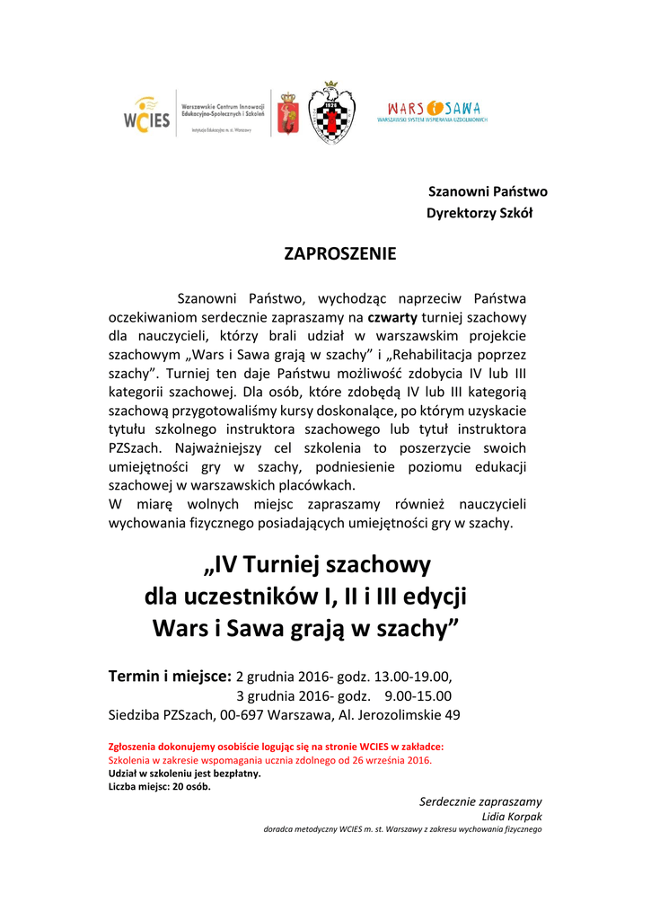 Szanowni Państwo Dyrektorzy Szkół ZAPROSZENIE Szanowni Państwo, wychodząc naprzeciw Państwa oczekiwaniom serdecznie zapraszamy na czwarty turniej szachowy dla nauczycieli, którzy brali udział w warszawskim projekcie szachowym „Wars i Sawa grają w szachy” i „Rehabilitacja poprzez szachy”. Turniej ten daje Państwu możliwość zdobycia IV lub III kategorii szachowej. Dla osób, które zdobędą IV lub III kategorią szachową przygotowaliśmy kursy doskonalące, po którym uzyskacie tytułu szkolnego instruktora szachowego lub tytuł instruktora PZSzach. Najważniejszy cel szkolenia to poszerzycie swoich umiejętności gry w szachy, podniesienie poziomu edukacji szachowej w warszawskich placówkach. W miarę wolnych miejsc zapraszamy również nauczycieli wychowania fizycznego posiadających umiejętności gry w szachy. „IV Turniej szachowy dla uczestników I, II i III edycji Wars i Sawa grają w szachy” Termin i miejsce: 2 grudnia 2016- godz. 13.00-19.00, 3 grudnia 2016- godz. 9.00-15.00 Siedziba PZSzach, 00-697 Warszawa, Al. Jerozolimskie 49 Zgłoszenia dokonujemy osobiście logując się na stronie WCIES w zakładce: Szkolenia w zakresie wspomagania ucznia zdolnego od 26 września 2016. Udział w szkoleniu jest bezpłatny. Liczba miejsc: 20 osób. Serdecznie zapraszamy Lidia Korpak doradca metodyczny WCIES m. st. Warszawy z zakresu wychowania fizycznego