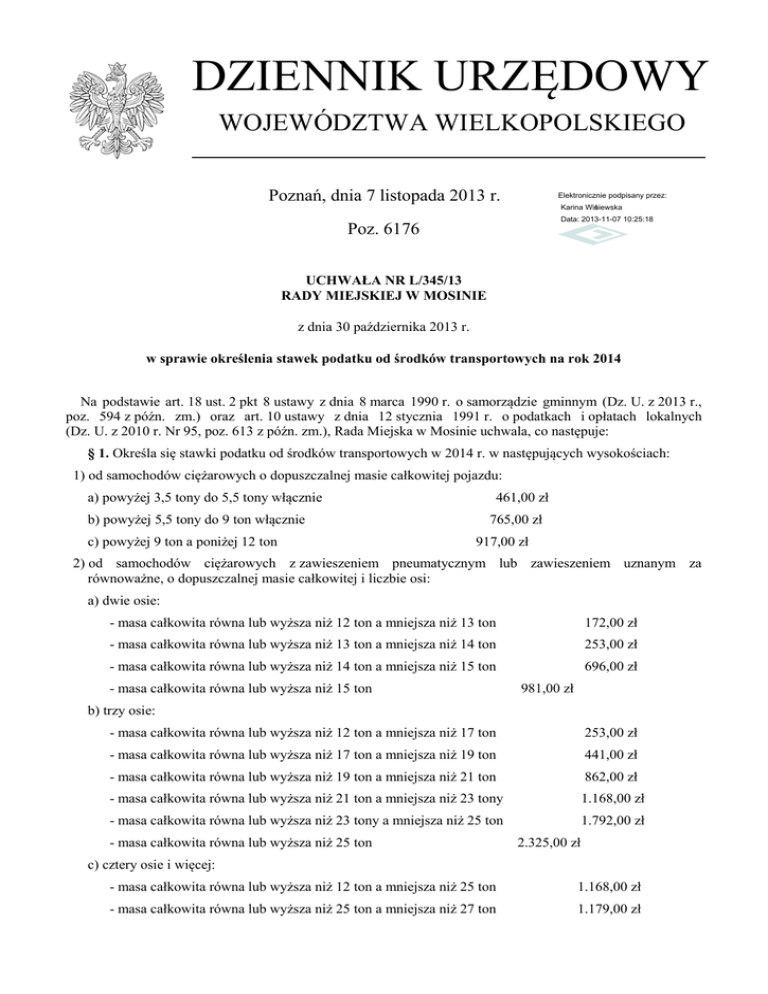 DZIENNIK URZĘDOWY WOJEWÓDZTWA WIELKOPOLSKIEGO Poznań, dnia 7 listopada 2013 r. Elektronicznie podpisany przez: Karina Wiśniewska Data: 2013-11-07 10:25:18 Poz. 6176 UCHWAŁA NR L/345/13 RADY MIEJSKIEJ W MOSINIE z dnia 30 października 2013 r. w sprawie określenia stawek podatku od środków transportowych na rok 2014 Na podstawie art. 18 ust. 2 pkt 8 ustawy z dnia 8 marca 1990 r. o samorządzie gminnym (Dz. U. z 2013 r., poz. 594 z późn. zm.) oraz art. 10 ustawy z dnia 12 stycznia 1991 r. o podatkach i opłatach lokalnych (Dz. U. z 2010 r. Nr 95, poz. 613 z późn. zm.), Rada Miejska w Mosinie uchwala, co następuje: § 1. Określa się stawki podatku od środków transportowych w 2014 r. w następujących wysokościach: 1) od samochodów ciężarowych o dopuszczalnej masie całkowitej pojazdu: a) powyżej 3,5 tony do 5,5 tony włącznie b) powyżej 5,5 tony do 9 ton włącznie c) powyżej 9 ton a poniżej 12 ton 461,00 zł 765,00 zł 917,00 zł 2) od samochodów ciężarowych z zawieszeniem pneumatycznym lub zawieszeniem uznanym za równoważne, o dopuszczalnej masie całkowitej i liczbie osi: a) dwie osie: - masa całkowita równa lub wyższa niż 12 ton a mniejsza niż 13 ton 172,00 zł - masa całkowita równa lub wyższa niż 13 ton a mniejsza niż 14 ton 253,00 zł - masa całkowita równa lub wyższa niż 14 ton a mniejsza niż 15 ton 696,00 zł - masa całkowita równa lub wyższa niż 15 ton 981,00 zł b) trzy osie: - masa całkowita równa lub wyższa niż 12 ton a mniejsza niż 17 ton 253,00 zł - masa całkowita równa lub wyższa niż 17 ton a mniejsza niż 19 ton 441,00 zł - masa całkowita równa lub wyższa niż 19 ton a mniejsza niż 21 ton 862,00 zł - masa całkowita równa lub wyższa niż 21 ton a mniejsza niż 23 tony 1.168,00 zł - masa całkowita równa lub wyższa niż 23 tony a mniejsza niż 25 ton 1.792,00 zł - masa całkowita równa lub wyższa niż 25 ton 2.325,00 zł c) cztery osie i więcej: - masa całkowita równa lub wyższa niż 12 ton a mniejsza niż 25 ton 1.168,00 zł - masa całkowita równa lub wyższa niż 25 ton a mniejsza niż 27 ton 1.179,00 zł Dziennik Urzędowy Województwa Wielkopolskiego –2– Poz. 6176 - masa całkowita równa lub wyższa niż 27 ton a mniejsza niż 29 ton 1.847,00 zł - masa całkowita równa lub wyższa niż 29 ton a mniejsza niż 31 ton 2.933,00 zł - masa całkowita równa lub wyższa niż 31 ton 3.000,00 zł 3) od samochodów ciężarowych z innym systemem zawieszenia osi jezdnych, o dopuszczalnej masie całkowitej i liczbie osi: a) dwie osie: - masa całkowita równa lub wyższa niż 12 ton a mniejsza niż 13 ton 253,00 zł - masa całkowita równa lub wyższa niż 13 ton a mniejsza niż 14 ton 696,00 zł - masa całkowita równa lub wyższa niż 14 ton a mniejsza niż 15 ton 981,00 zł - masa całkowita równa lub wyższa niż 15 ton 2.219,00 zł b) trzy osie: - masa całkowita równa lub wyższa niż 12 ton a mniejsza niż 17 ton 439,00 zł - masa całkowita równa lub wyższa niż 17 ton a mniejsza niż 19 ton 899,00 zł - masa całkowita równa lub wyższa niż 19 ton a mniejsza niż 21 ton 1.125,00 zł - masa całkowita równa lub wyższa niż 21 ton a mniejsza niż 23 tony 1.733,00 zł - masa całkowita równa lub wyższa niż 23 tony a mniejsza niż 25 ton 2.797,00 zł - masa całkowita równa lub wyższa niż 25 ton 3.000,00 zł c) cztery osie i więcej: - masa całkowita równa lub wyższa niż 12 ton a mniejsza niż 25 ton 1.186,00 zł - masa całkowita równa lub wyższa niż 25 ton a mniejsza niż 27 ton 1.847,00 zł - masa całkowita równa lub wyższa niż 27 ton a mniejsza niż 29 ton 2.933,00 zł - masa całkowita równa lub wyższa niż 29 ton a mniejsza niż 31 ton 3.000,00 zł - masa całkowita równa lub wyższa niż 31 ton 3.000,00 zł 4) od ciągników siodłowych i balastowych przystosowanych do używania łącznie z naczepą lub przyczepą, o dopuszczalnej masie całkowitej zespołu pojazdów: a) od 3,5 tony i poniżej 5,5 tony b) od 5,5 tony i poniżej 9 ton c) od 9 ton i poniżej 12 ton 1.070,00 zł 1.238,00 zł 1.770,00 zł 5) od ciągników siodłowych i balastowych przystosowanych do używania łącznie z naczepą lub przyczepą, z zawieszeniem pneumatycznym lub zawieszeniem uznanym za równoważne, o dopuszczalnej masie całkowitej zespołu pojazdów i liczbie osi: a) dwie osie: - masa całkowita równa lub wyższa niż 12 ton a mniejsza niż 18 ton 340,00 zł - masa całkowita równa lub wyższa niż 18 ton a mniejsza niż 25 ton 471,00 zł - masa całkowita równa lub wyższa niż 25 ton a mniejsza niż 31 ton 994,00 zł - masa całkowita równa lub wyższa niż 31 ton 2.322,00 zł b) trzy osie: - masa całkowita równa lub wyższa niż 12 ton a mniejsza niż 40 ton - masa całkowita równa lub wyższa niż 40 ton 2.211,00 zł 3.035,00 zł Dziennik Urzędowy Województwa Wielkopolskiego –3– Poz. 6176 6) od ciągników siodłowych i balastowych przystosowanych do używania łącznie z naczepą lub przyczepą, z innym systemem zawieszenia osi jezdnych, o dopuszczalnej masie całkowitej zespołu pojazdów i liczbie osi: a) dwie osie: - masa całkowita równa lub wyższa niż 12 ton a mniejsza niż 18 ton 684,00 zł - masa całkowita równa lub wyższa niż 18 ton a mniejsza niż 25 ton 854,00 zł - masa całkowita równa lub wyższa niż 25 ton a mniejsza niż 31 ton 1.631,00 zł - masa całkowita równa lub wyższa niż 31 ton 2.366,00 zł b) trzy osie: - masa całkowita równa lub wyższa niż 12 ton a mniejsza niż 40 ton - masa całkowita równa lub wyższa niż 40 ton 2.322,00 zł 3.035,00 zł 7) od przyczep i naczep, które łącznie z pojazdem silnikowym posiadają dopuszczalną masę całkowitą od 7 ton i poniżej 12 ton, z wyjątkiem związanych wyłącznie z działalnością rolniczą prowadzoną przez podatnika podatku rolnego: - od 7 ton i poniżej 9 ton 526,00 zł - od 9 ton i poniżej 12 ton 631,00 zł 8) od przyczep lub naczep z zawieszeniem pneumatycznym l