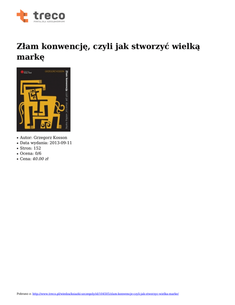 Złam konwencję, czyli jak stworzyć wielką markę ● ● ● ● ● Autor: Grzegorz Kosson Data wydania: 2013-09-11 Stron: 152 Ocena: 0/6 Cena: 40.00 zł Pobrano z: http://www.treco.pl/wiedza/ksiazki-szczegoly/id/104505/zlam-konwencje-czyli-jak-stworzyc-wielka-marke/