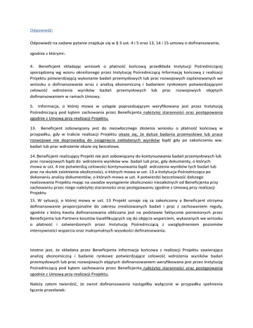 Odpowiedź: Odpowiedź na zadane pytanie znajduje się w § 3 ust. 4 i 5 oraz 13, 14 i 15 umowy o dofinansowanie, zgodnie z którymi:. 4. Beneficjent składając wniosek o płatność końcową przedkłada Instytucji Pośredniczącej sporządzoną wg wzoru określonego przez Instytucję Pośredniczącą Informację końcową z realizacji Projektu potwierdzającą wykonanie badań przemysłowych lub prac rozwojowych zaplanowanych we wniosku o dofinansowanie wraz z analizą ekonomiczną i badaniem rynkowym potwierdzającymi celowość wdrożenia wyników badań przemysłowych lub prac rozwojowych objętych dofinansowaniem w ramach Umowy. 5. Informacja, o której mowa w ustępie poprzedzającym weryfikowana jest przez Instytucję Pośredniczącą pod kątem zachowania przez Beneficjenta należytej staranności oraz postępowania zgodnie z Umową przy realizacji Projektu. 13. Beneficjent zobowiązany jest do niezwłocznego złożenia wniosku o płatność końcową w przypadku, gdy w trakcie realizacji Projektu okaże się, że dalsze badania przemysłowe lub prace rozwojowe nie doprowadzą do osiągnięcia zakładanych wyników bądź gdy po zakończeniu ww. badań lub prac wdrożenie okaże się bezcelowe. 14. Beneficjent realizujący Projekt nie jest zobowiązany do kontynuowania badań przemysłowych lub prac rozwojowych bądź do wdrożenia wyników ww. badań lub prac, gdy dokumenty, o których mowa w ust. 4 nie potwierdzą celowości kontynuowania bądź wdrożenia wyników tych badań lub prac na skutek zaistnienia okoliczności, o których mowa w ust. 13 a Instytucja Pośrednicząca po dokonaniu analizy dokumentów, o których mowa w ust. 4 potwierdzi bezcelowość dalszego realizowania Projektu mając na uwadze wystąpienie okoliczności niezależnych od Beneficjenta przy zachowaniu przez niego należytej staranności oraz postępowaniu zgodnie z Umową przy realizacji Projektu 15. W sytuacji, o której mowa w ust. 13 Projekt uznaje się za zakończony a Beneficjent otrzyma dofinansowanie proporcjonalne do zakresu zrealizowanych badań i prac z zachowaniem reguły, zgodnie z którą kwota dofinansowania obliczana jest na podstawie faktycznie poniesionych przez Beneficjenta lub Partnera kosztów kwalifikujących się do objęcia wsparciem, wykazanych we wniosku o płatność i zatwierdzonych przez Instytucję Pośredniczącą z uwzględnieniem poziomów intensywności wsparcia oraz maksymalnych wysokości dofinansowania. Istotne jest, że składana przez Beneficjenta informacja końcowa z realizacji Projektu zawierająca analizę ekonomiczną i badanie rynkowe potwierdzające celowość wdrożenia wyników badań przemysłowych lub prac rozwojowych objętych dofinansowaniem weryfikowana jest przez Instytucję Pośredniczącą pod kątem zachowania przez Beneficjenta należytej staranności oraz postępowania zgodnie z Umową przy realizacji Projektu. Należy zatem twierdzić, że zwrot dofinansowania nastąpiłby wyłącznie w przypadku spełnienia łącznie przesłanek: 1) po zakończeniu badań przemysłowych lub prac rozwojowych wdrożenie okaże się bezcelowe; 2) bezcelowość wdrożenia wynikła z niezachowania przez Beneficjenta należytej staranności oraz postępowaniu niezgodnie z umową o dofinansowanie.