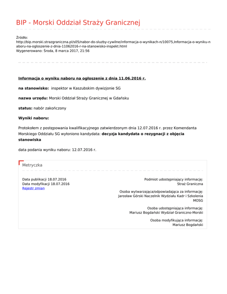 BIP - Morski Oddział Straży Granicznej Źródło: http://bip.morski.strazgraniczna.pl/s05/nabor-do-sluzby-cywilne/informacja-o-wynikach-n/10075,Informacja-o-wyniku-n aboru-na-ogloszenie-z-dnia-11062016-r-na-stanowisko-inspekt.html Wygenerowano: Środa, 8 marca 2017, 21:56 Informacja o wyniku naboru na ogłoszenie z dnia 11.06.2016 r. na stanowisko: inspektor w Kaszubskim dywizjonie SG nazwa urzędu: Morski Oddział Straży Granicznej w Gdańsku status: nabór zakończony Wyniki naboru: Protokołem z postępowania kwalifikacyjnego zatwierdzonym dnia 12.07.2016 r. przez Komendanta Morskiego Oddziału SG wyłoniono kandydata: decyzja kandydata o rezygnacji z objęcia stanowiska data podania wyniku naboru: 12.07.2016 r. Metryczka Data publikacji 18.07.2016 Data modyfikacji 18.07.2016 Rejestr zmian Podmiot udostępniający informację: Straż Graniczna Osoba wytwarzająca/odpowiadająca za informację: Jarosław Górski Naczelnik Wydziału Kadr i Szkolenia MOSG Osoba udostępniająca informację: Mariusz Bogdański Wydział Graniczno-Morski Osoba modyfikująca informację: Mariusz Bogdański