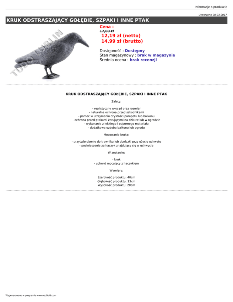 Informacje o produkcie Utworzono 08-03-2017 KRUK ODSTRASZAJĄCY GOŁĘBIE, SZPAKI I INNE PTAK Cena : 17,00 zł 12,19 zł (netto) 14,99 zł (brutto) Dostępność : Dostępny Stan magazynowy : brak w magazynie Średnia ocena : brak recenzji KRUK ODSTRASZAJĄCY GOŁĘBIE, SZPAKI I INNE PTAK Zalety: - realistyczny wygląd oraz rozmiar - naturalna ochrona przed szkodnikami - pomoc w utrzymaniu czystości parapetu lub balkonu - ochrona przed ptakami żerującymi na działce lub w ogrodzie - wykonanie z lekkiego i odpornego materiału - dodatkowa ozdoba balkonu lub ogrodu Mocowanie kruka: - przytwierdzenie do trawnika lub doniczki przy użyciu uchwytu - podwieszenie za haczyk znajdujący się w uchwycie W zestawie: - kruk - uchwyt mocujący z haczykiem Wymiary: Szerokość produktu: 40cm Głębokość produktu: 13cm Wysokość produktu: 20cm Wygenerowano w programie www.oscGold.com
