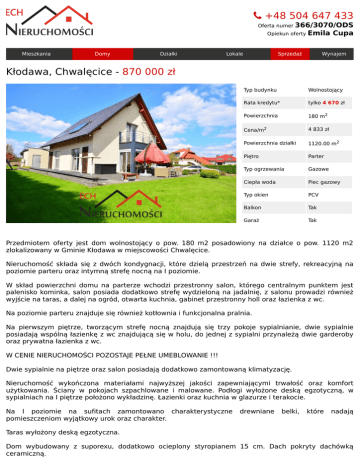 +48504647433 Ofertanumer366/3070/ODS OpiekunofertyEmilaCupa Mieszkania Domy Działki Lokale Sprzedaż Wynajem Kłodawa,Chwalęcice-870000zł Typbudynku Wolnostojący Ratakredytu* tylko4670zł Powierzchnia 180m2 Cena/m2 4833zł Powierzchniadziałki 1120.00m2 Piętro Parter Typogrzewania Gazowe Ciepławoda Piecgazowy Typokien PCV Balkon Tak Garaż Tak Przedmiotem oferty jest dom wolnostojący o pow. 180 m2 posadowiony na działce o pow. 1120 m2 zlokalizowanywGminieKłodawawmiejscowościChwalęcice. Nieruchomość składa się z dwóch kondygnacji, które dzielą przestrzeń na dwie strefy, rekreacyjną na poziomieparteruorazintymnąstrefęnocnąnaIpoziomie. W skład powierzchni domu na parterze wchodzi przestronny salon, którego centralnym punktem jest palenisko kominka, salon posiada dodatkowo strefę wydzieloną na jadalnię, z salonu prowadzi również wyjścienataras,adalejnaogród,otwartakuchnia,gabinetprzestronnyhollorazłazienkazwc. Napoziomieparteruznajdujesięrównieżkotłowniaifunkcjonalnapralnia. Na pierwszym piętrze, tworzącym strefę nocną znajdują się trzy pokoje sypialnianie, dwie sypialnie posiadająwspólnąłazienkęzwcznajdującąsięwholu,dojednejzsypialniprzynależądwiegarderoby orazprywatnałazienkazwc. WCENIENIERUCHOMOŚCIPOZOSTAJEPEŁNEUMEBLOWANIE!!! Dwiesypialnienapiętrzeorazsalonposiadajądodatkowozamontowanąklimatyzację. Nieruchomość wykończona materiałami najwyższej jakości zapewniającymi trwałość oraz komfort użytkowania. Ściany w pokojach szpachlowane i malowane. Podłogi wyłożone deską egzotyczną, w sypialniachnaIpiętrzepołożonowykładzinę.Łazienkiorazkuchniawglazurzeiterakocie. Na I poziomie na sufitach zamontowano charakterystyczne drewniane belki, które nadają pomieszczeniomwyjątkowyurokorazcharakter. Taraswyłożonydeskąegzotyczna. Dom wybudowany z suporexu, dodatkowo ocieplony styropianem 15 cm. Dach pokryty dachówką ceramiczną. Ogrzewanie domu za pomocą pieca gazowego oraz kominkowe, ciepła woda z pompy ciepła oraz ogrzewana w okresie słonecznym za pomocą paneli solarowych. W łazienkach, kuchni, holu oraz pomieszczeniu gospodarczym rozprowadzono ogrzewanie podłogowe w pozostałych pokojach zamontowanogrzejniki. Posesja wokół nieruchomości zadbana i zagospodarowana z licznymi nasadzeniami. Na terenie posesji znajdujesięrównieżstrzecharekreacyjna,którastanowiidealnemiejscenaspotkaniawokresieletnim w grodzie rodziny oraz przyjaciół. Teren wokół domu w całości ogrodzony siatką, od frontu metaloplastyką. Posesja dodatkowo wyłożona polbrukiem wysokiej klasy. Dla zwiększenia wygody domownikówwogrodzierozprowadzonorównieżsystemsamonawadniający. Naterenieposesjiznajdujesięgarażwolnostojącyjednostanowiskowyopow.30m2doktóregoprzylega dodatkowowiatasamochodowa. Dla zwiększenia poczucia bezpieczeństwa domowników oraz zabezpieczenia mienia rozprowadzony został system alarmowy, zamontowano drzwi wejściowe antywłamaniowe typu GERDA oraz rolety zewnętrzneantywłamanioweotwieraneelektrycznie. Niewątpliwym atutem nieruchomości jest jej lokalizacja w spokojnej okolicy w otoczeniu zieleni oraz domówjednorodzinnych.ChwalęcicesąbardzodobrzeskomunikowanezGorzowemWielkopolskim. Media:prąd,woda,kanalizacja,gaz. ZAPRASZAMYNAPREZENTACJĘNIERUCHOMOŚCI!!! BEZPŁATNIEPORÓWNAMYKREDYTYHIPOTECZNE25BANKÓW!!! ul.MieszkaI-go2/3,66-400GorzówWlkp.,telefon:+48504647443,e-mail:[email protected]
