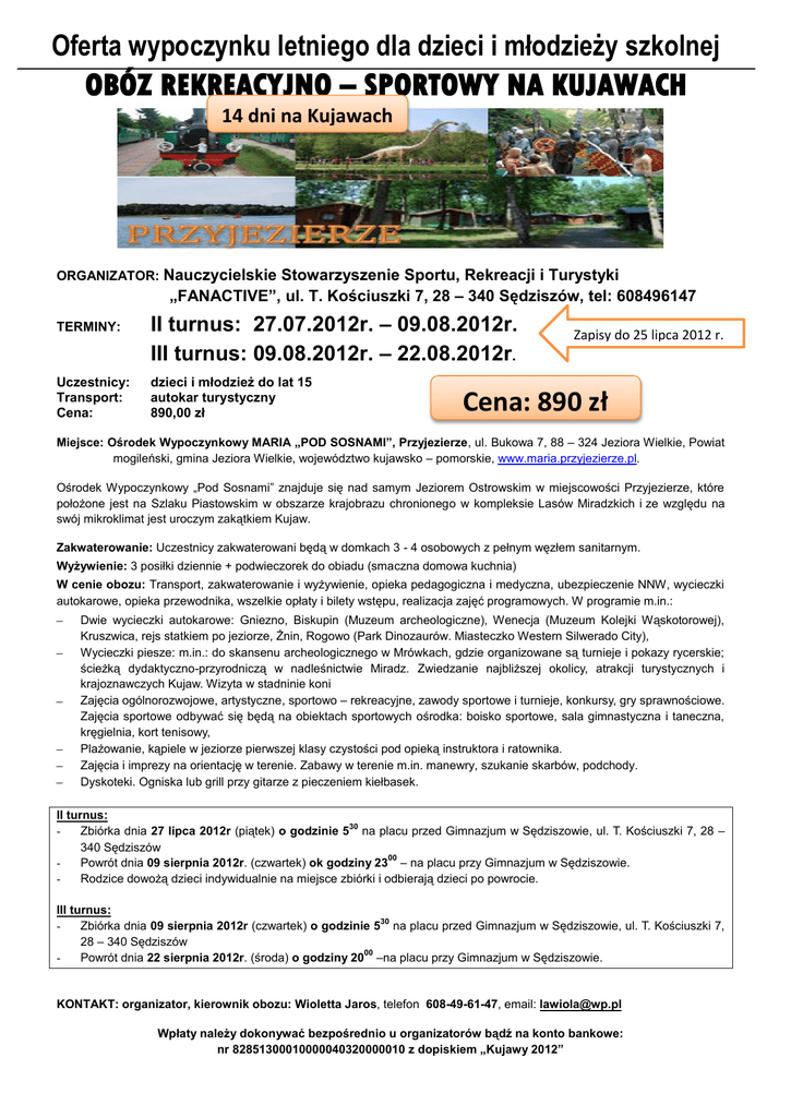 Oferta wypoczynku letniego dla dzieci i młodzieży szkolnej OBÓZ REKREACYJNO – SPORTOWY NA KUJAWACH 14 dni na Kujawach ORGANIZATOR: Nauczycielskie Stowarzyszenie Sportu, Rekreacji i Turystyki „FANACTIVE”, ul. T. Kościuszki 7, 28 – 340 Sędziszów, tel: 608496147 TERMINY: Uczestnicy: Transport: Cena: II turnus: 27.07.2012r. – 09.08.2012r. III turnus: 09.08.2012r. – 22.08.2012r. dzieci i młodzież do lat 15 autokar turystyczny 890,00 zł Zapisy do 25 lipca 2012 r. Cena: 890 zł Miejsce: Ośrodek Wypoczynkowy MARIA „POD SOSNAMI”, Przyjezierze, ul. Bukowa 7, 88 – 324 Jeziora Wielkie, Powiat mogileński, gmina Jeziora Wielkie, województwo kujawsko – pomorskie, www.maria.przyjezierze.pl. Ośrodek Wypoczynkowy „Pod Sosnami” znajduje się nad samym Jeziorem Ostrowskim w miejscowości Przyjezierze, które położone jest na Szlaku Piastowskim w obszarze krajobrazu chronionego w kompleksie Lasów Miradzkich i ze względu na swój mikroklimat jest uroczym zakątkiem Kujaw. Zakwaterowanie: Uczestnicy zakwaterowani będą w domkach 3 - 4 osobowych z pełnym węzłem sanitarnym. Wyżywienie: 3 posiłki dziennie + podwieczorek do obiadu (smaczna domowa kuchnia) W cenie obozu: Transport, zakwaterowanie i wyżywienie, opieka pedagogiczna i medyczna, ubezpieczenie NNW, wycieczki autokarowe, opieka przewodnika, wszelkie opłaty i bilety wstępu, realizacja zajęć programowych. W programie m.in.: Dwie wycieczki autokarowe: Gniezno, Biskupin (Muzeum archeologiczne), Wenecja (Muzeum Kolejki Wąskotorowej), Kruszwica, rejs statkiem po jeziorze, Żnin, Rogowo (Park Dinozaurów. Miasteczko Western Silwerado City), Wycieczki piesze: m.in.: do skansenu archeologicznego w Mrówkach, gdzie organizowane są turnieje i pokazy rycerskie; ścieżką dydaktyczno-przyrodniczą w nadleśnictwie Miradz. Zwiedzanie najbliższej okolicy, atrakcji turystycznych i krajoznawczych Kujaw. Wizyta w stadninie koni Zajęcia ogólnorozwojowe, artystyczne, sportowo – rekreacyjne, zawody sportowe i turnieje, konkursy, gry sprawnościowe. Zajęcia sportowe odbywać się będą na obiektach sportowych ośrodka: boisko sportowe, sala gimnastyczna i taneczna, kręgielnia, kort tenisowy, Plażowanie, kąpiele w jeziorze pierwszej klasy czystości pod opieką instruktora i ratownika. Zajęcia i imprezy na orientację w terenie. Zabawy w terenie m.in. manewry, szukanie skarbów, podchody. Dyskoteki. Ogniska lub grill przy gitarze z pieczeniem kiełbasek. II turnus: 30 Zbiórka dnia 27 lipca 2012r (piątek) o godzinie 5 na placu przed Gimnazjum w Sędziszowie, ul. T. Kościuszki 7, 28 – 340 Sędziszów 00 Powrót dnia 09 sierpnia 2012r. (czwartek) ok godziny 23 – na placu przy Gimnazjum w Sędziszowie. Rodzice dowożą dzieci indywidualnie na miejsce zbiórki i odbierają dzieci po powrocie. III turnus: 30 Zbiórka dnia 09 sierpnia 2012r (czwartek) o godzinie 5 na placu przed Gimnazjum w Sędziszowie, ul. T. Kościuszki 7, 28 – 340 Sędziszów 00 Powrót dnia 22 sierpnia 2012r. (środa) o godziny 20 –na placu przy Gimnazjum w Sędziszowie. KONTAKT: organizator, kierownik obozu: Wioletta Jaros, telefon 608-49-61-47, email: [email protected] Wpłaty należy dokonywać bezpośrednio u organizatorów bądź na konto bankowe: nr 82851300010000040320000010 z dopiskiem „Kujawy 2012”