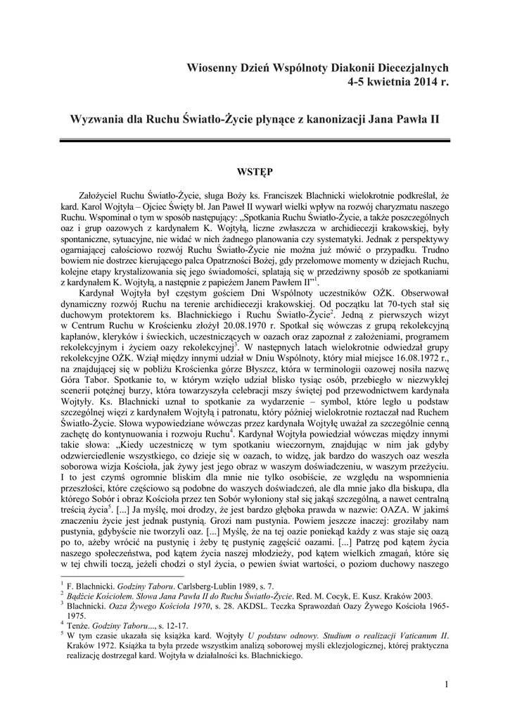 Wiosenny Dzień Wspólnoty Diakonii Diecezjalnych 4-5 kwietnia 2014 r. Wyzwania dla Ruchu Światło-Życie płynące z kanonizacji Jana Pawła II WSTĘP Założyciel Ruchu Światło-Życie, sługa Boży ks. Franciszek Blachnicki wielokrotnie podkreślał, że kard. Karol Wojtyła – Ojciec Święty bł. Jan Paweł II wywarł wielki wpływ na rozwój charyzmatu naszego Ruchu. Wspominał o tym w sposób następujący: „Spotkania Ruchu Światło-Życie, a także poszczególnych oaz i grup oazowych z kardynałem K. Wojtyłą, liczne zwłaszcza w archidiecezji krakowskiej, były spontaniczne, sytuacyjne, nie widać w nich żadnego planowania czy systematyki. Jednak z perspektywy ogarniającej całościowo rozwój Ruchu Światło-Życie nie można już mówić o przypadku. Trudno bowiem nie dostrzec kierującego palca Opatrzności Bożej, gdy przełomowe momenty w dziejach Ruchu, kolejne etapy krystalizowania się jego świadomości, splatają się w przedziwny sposób ze spotkaniami z kardynałem K. Wojtyłą, a następnie z papieżem Janem Pawłem II”1. Kardynał Wojtyła był częstym gościem Dni Wspólnoty uczestników OŻK. Obserwował dynamiczny rozwój Ruchu na terenie archidiecezji krakowskiej. Od początku lat 70-tych stał się duchowym protektorem ks. Blachnickiego i Ruchu Światło-Życie2. Jedną z pierwszych wizyt w Centrum Ruchu w Krościenku złożył 20.08.1970 r. Spotkał się wówczas z grupą rekolekcyjną kapłanów, kleryków i świeckich, uczestniczących w oazach oraz zapoznał z założeniami, programem rekolekcyjnym i życiem oazy rekolekcyjnej3. W następnych latach wielokrotnie odwiedzał grupy rekolekcyjne OŻK. Wziął między innymi udział w Dniu Wspólnoty, który miał miejsce 16.08.1972 r., na znajdującej się w pobliżu Krościenka górze Błyszcz, która w terminologii oazowej nosiła nazwę Góra Tabor. Spotkanie to, w którym wzięło udział blisko tysiąc osób, przebiegło w niezwykłej scenerii potężnej burzy, która towarzyszyła celebracji mszy świętej pod przewodnictwem kardynała Wojtyły. Ks. Blachnicki uznał to spotkanie za wydarzenie – symbol, które legło u podstaw szczególnej więzi z kardynałem Wojtyłą i patronatu, który później wielokrotnie roztaczał nad Ruchem Światło-Życie. Słowa wypowiedziane wówczas przez kardynała Wojtyłę uważał za szczególnie cenną zachętę do kontynuowania i rozwoju Ruchu4. Kardynał Wojtyła powiedział wówczas między innymi takie słowa: „Kiedy uczestniczę w tym spotkaniu wieczornym, znajdując w nim jak gdyby odzwierciedlenie wszystkiego, co dzieje się w oazach, to widzę, jak bardzo do waszych oaz weszła soborowa wizja Kościoła, jak żywy jest jego obraz w waszym doświadczeniu, w waszym przeżyciu. I to jest czymś ogromnie bliskim dla mnie nie tylko osobiście, ze względu na wspomnienia przeszłości, które częściowo są podobne do waszych doświadczeń, ale dla mnie jako dla biskupa, dla którego Sobór i obraz Kościoła przez ten Sobór wyłoniony stał się jakąś szczególną, a nawet centralną treścią życia5. [...] Ja myślę, moi drodzy, że jest bardzo głęboka prawda w nazwie: OAZA. W jakimś znaczeniu życie jest jednak pustynią. Grozi nam pustynia. Powiem jeszcze inaczej: groziłaby nam pustynia, gdybyście nie tworzyli oaz. [...] Myślę, że na tej oazie poniekąd każdy z was staje się oazą po to, ażeby wrócić na pustynię i żeby tę pustynię zagęścić oazami. [...] Patrzę pod kątem życia naszego społeczeństwa, pod kątem życia naszej młodzieży, pod kątem wielkich zmagań, które się w tej chwili toczą, jeżeli chodzi o styl życia, o pewien świat wartości, o poziom duchowy naszego 1 2 3 4 5 F. Blachnicki. Godziny Taboru. Carlsberg-Lublin 1989, s. 7. Bądźcie Kościołem. Słowa Jana Pawła II do Ruchu Światło-Życie. Red. M. Cocyk, E. Kusz. Kraków 2003. Blachnicki. Oaza Żywego Kościoła 1970, s. 28. AKDSL. Teczka Sprawozdań Oazy Żywego Kościoła 19651975. Tenże. Godziny Taboru..., s. 12-17. W tym czasie ukazała się książka kard. Wojtyły U podstaw odnowy. Studium o realizacji Vaticanum II. Kraków 1972. Książka ta była przede wszystkim analizą soborowej myśli eklezjologicznej, której praktyczna realizację dostrzegał kard. Wojtyła w działalności ks. Blachnickiego. 1 społeczeństwa, a zwłaszcza młodzieży. Od tego zależy cała nasza przyszłość, społeczeństwo jutra. Dlatego wracam do mojego wniosku: jesteście tutaj na oazie, trzeba, ażeby każdy z was wziął tę oazę w siebie i żeby się stał taką oazą i żeby tymi oazami zagęścić jak najbardziej pustynię. Wtedy ona nie będzie groźna. To jest równocześnie życzenie, które wam przekazuję z całego serca, wszystkim tutaj zgromadzonym, wszystkim oazom i waszemu Ojcu i organizatorowi, który ten Ruch Żywego Kościoła zainicjował i rozwija z roku na rok. Niech Bóg za wstawiennictwem Matki Niepokalanej i Jej umiłowanego sługi, błogosławionego Maksymiliana, pozwoli oazami zagęścić pustynię, która nam grozi, aby już nie była groźna”6. Kardynał Wojtyła, uczestnicząc w spotkaniach oazowych, nabrał przekonania, że zarówno praca i apostolat ks. Blachnickiego, jak i powstający Ruch Światło-Życie, są szczególnie istotnym darem dla życia Kościoła w Polsce. W czasie jednego ze spotkań moderatorów Ruchu Światło-Życie archidiecezji krakowskiej w 1972 r., w którym uczestniczył ks. Blachnicki, kardynał Wojtyła zwrócił się do niego w następujący sposób: „Chcę w tym miejscu skierować szczególne słowa do animatora tego Ruchu, który wszystkim nam pokazał, że w epoce, zdawać by się mogło tak przedziwnej, tkwią takie wielkie możliwości. Trzeba tylko je zobaczyć i obudzić, po prostu trzeba uwierzyć w Kościół i dać tej wierze wyraz, nie tylko słowny, nie tylko teoretyczny, abstrakcyjny, nie tylko kulturowy, ale życiowy wyraz, sięgający całej prawdy o człowieku, o wspólnocie