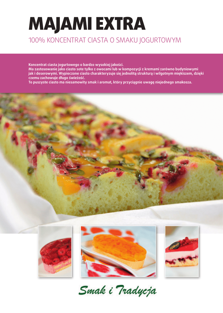 MAJAMI EXTRA 100% koncentrat ciasta o smaku jogurtowym Koncentrat ciasta jogurtowego o bardzo wysokiej jakości. Ma zastosowanie jako ciasto sote tylko z owocami lub w kompozycji z kremami zarówno budyniowymi jak i deserowymi. Wypieczone ciasto charakteryzuje się jednolitą strukturą i wilgotnym miękiszem, dzięki czemu zachowuje długo świeżość. To puszyste ciasto ma niesamowity smak i aromat, który przyciągnie uwagę niejednego smakosza. MAJAMI EXTRA 100% koncentrat ciasta o smaku jogurtowym RECEPTURA PODSTAWOWA MAJAMI EXTRA 1000 g Jaja 400 g Olej 400 g Woda 200 g Sposób wykonania: Wszystkie składniki wymieszać w maszynie cukierniczej na wolnych obrotach przez ok 3 min. Piec w temperaturze ok. 180 °C przez ok. 30 min. MAJAMI EXTRA Z OWOCAMI Blacha 60x20 cm CIASTO JOGURTOWE MAJAMI EXTRA 500 g KREM ŚMIETANOWO-MALINOWY Śmietana 30 % 1000 g Jaja 200 g Woda 250 g Olej 200 g 200 g Woda 100 g Stabilizator żelatynowy Malinowy Malina 300 g Porzeczka 300 g Żel-mix 50 g ŻEL DEKORACYJNY Golden Glaze o smaku truskawkowym 200 g Sposób wykonania: Do ubitej śmietany dodać stabilizator uprzednio wymieszany z zimną wodą. Sposób wykonania: Wszystkie składniki na CIASTO JOGURTOWE połączyć na wolnych obrotach ok. 3 min. Ciasto wylać na blaszkę 60/20cm przeprószyć żel-mixem, następnie wyłożyć maliny i porzeczki (w przypadku owoców mrożonych można obtoczyć je w żel-mixie i bezpośrednio wyłożyć na ciasto). Wypiec w temp. 180 °C przez ok. 30 min. Na wystudzone ciasto wyłożyć KREM ŚMIETANOWO-MALINOWY i schłodzić. Całość pokrywamy cienką warstwą Golden Glaze o smaku truskawkowym. Producent dodatków dla piekarstwa i cukiernictwa Eco Trade Sp. z o.o. ul. Okrężna 8, 44-100 Gliwice, tel./fax +48 32 231 20 87–88, www.ecotrade.pl, e‑mail [email protected] www.facebook.com/Ecotrade.gliwice