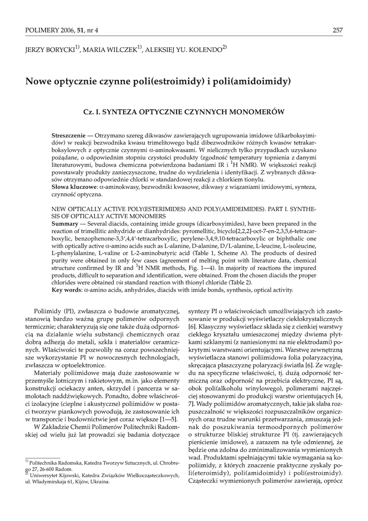 POLIMERY 2006, 51, nr 4 257 JERZY BORYCKI1), MARIA WILCZEK1), ALEKSIEJ YU. KOLENDO2) Nowe optycznie czynne poli(estroimidy) i poli(amidoimidy) Cz. I. SYNTEZA OPTYCZNIE CZYNNYCH MONOMERÓW Streszczenie — Otrzymano szereg dikwasów zawieraj¹cych ugrupowania imidowe (dikarboksyimidów) w reakcji bezwodnika kwasu trimelitowego b¹dŸ dibezwodników ró¿nych kwasów tetrakarboksylowych z optycznie czynnymi α-aminokwasami. W nielicznych tylko przypadkach uzyskano po¿¹dane, o odpowiednim stopniu czystoœci produkty (zgodnoœæ temperatury topnienia z danymi literaturowymi, budowa chemiczna potwierdzona badaniami IR i 1H NMR). W wiêkszoœci reakcji powstawa³y produkty zanieczyszczone, trudne do wydzielenia i identyfikacji. Z wybranych dikwasów otrzymano odpowiednie chlorki w standardowej reakcji z chlorkiem tionylu. S³owa kluczowe: α-aminokwasy, bezwodniki kwasowe, dikwasy z wi¹zaniami imidowymi, synteza, czynnoœæ optyczna. NEW OPTICALLY ACTIVE POLY(ESTERIMIDES) AND POLY(AMIDEIMIDES). PART I. SYNTHESIS OF OPTICALLY ACTIVE MONOMERS Summary — Several diacids, containing imide groups (dicarboxyimides), have been prepared in the reaction of trimellitic anhydride or dianhydrides: pyromellitic, bicyclo[2,2,2]-oct-7-en-2,3,5,6-tetracarboxylic, benzophenone-3,3‘,4,4‘-tetracarboxylic, perylene-3,4,9,10-tetracarboxylic or biphthalic one with optically active α-amino acids such as L-alanine, D-alanine, D/L-alanine, L-leucine, L-isoleucine, L-phenylalanine, L-valine or L-2-aminobutyric acid (Table 1, Scheme A). The products of desired purity were obtained in only few cases (agreement of melting point with literature data, chemical structure confirmed by IR and 1H NMR methods, Fig. 1—4). In majority of reactions the impured products, difficult to separation and identification, were obtained. From the chosen diacids the proper chlorides were obtained via standard reaction with thionyl chloride (Table 2). Key words: α-amino acids, anhydrides, diacids with imide bonds, synthesis, optical activity. Poliimidy (PI), zw³aszcza o budowie aromatycznej, stanowi¹ bardzo wa¿n¹ grupê polimerów odpornych termicznie; charakteryzuj¹ siê one tak¿e du¿¹ odpornoœci¹ na dzia³anie wielu substancji chemicznych oraz dobr¹ adhezj¹ do metali, szk³a i materia³ów ceramicznych. W³aœciwoœci te pozwoli³y na coraz powszechniejsze wykorzystanie PI w nowoczesnych technologiach, zw³aszcza w optoelektronice. Materia³y poliimidowe maj¹ du¿e zastosowanie w przemyœle lotniczym i rakietowym, m.in. jako elementy konstrukcji ociekaczy anten, skrzyde³ i pancerza w samolotach naddŸwiêkowych. Ponadto, dobre w³aœciwoœci izolacyjne (cieplne i akustyczne) poliimidów w postaci tworzyw piankowych powoduj¹, ¿e zastosowanie ich w transporcie i budownictwie jest coraz wiêksze [1—5]. W Zak³adzie Chemii Polimerów Politechniki Radomskiej od wielu ju¿ lat prowadzi siê badania dotycz¹ce 1) Politechnika Radomska, Katedra Tworzyw Sztucznych, ul. Chrobrego 27, 26-600 Radom. 2) Uniwersytet Kijowski, Katedra Zwi¹zków Wielkocz¹steczkowych, ul. W³adymirskaja 61, Kijów, Ukraina. syntezy PI o w³aœciwoœciach umo¿liwiaj¹cych ich zastosowanie w produkcji wyœwietlaczy ciek³okrystalicznych [6]. Klasyczny wyœwietlacz sk³ada siê z cienkiej warstwy ciek³ego kryszta³u umieszczonej miêdzy dwiema p³ytkami szklanymi (z naniesionymi na nie elektrodami) pokrytymi warstwami orientuj¹cymi. Warstwê zewnêtrzn¹ wyœwietlacza stanowi poliimidowa folia polaryzacyjna, skrêcaj¹ca p³aszczyznê polaryzacji œwiat³a [6]. Ze wzglêdu na specyficzne w³aœciwoœci, tj. du¿¹ odpornoœæ termiczn¹ oraz odpornoœæ na przebicia elektryczne, PI s¹, obok poli(alkoholu winylowego), polimerami najczêœciej stosowanymi do produkcji warstw orientuj¹cych [4, 7]. Wady poliimidów aromatycznych, takie jak s³aba rozpuszczalnoœæ w wiêkszoœci rozpuszczalników organicznych oraz trudne warunki przetwarzania, zmuszaj¹ jednak do poszukiwania termoodpornych polimerów o strukturze bliskiej strukturze PI (tj. zawieraj¹cych pierœcienie imidowe), a zarazem na tyle odmiennej, ¿e bêdzie ona zdolna do zminimalizowania wymienionych wad. Produktami spe³niaj¹cymi takie wymagania s¹ kopoliimidy, z których znaczenie praktyczne zyska³y poli(eteroimidy), poli(amidoimidy) i poli(estroimidy). Cz¹steczki wymienionych polimerów zawieraj¹, oprócz POLIMERY 2006, 51, nr 4 258 pierœcieni imidowych, tak¿e odpowiadaj¹ce ich nazwie ugrupowania. Obecnoœæ takich grup zak³óca symetriê cz¹steczki, wystêpowanie zaœ dodatkowych atomów tlenu lub azotu, powoduje, ¿e kopolimery tego typu wykazuj¹ lepsz¹, w porównaniu z klasycznymi poliimidami, rozpuszczalnoœæ, p³ynnoœæ i przetwarzalnoœæ, z zachowaniem du¿ej odpornoœci termicznej. Podstawowe metody syntezy kopoliimidów prezentowane s¹ w wielu publikacjach, np. [1—4, 8, 9]. Dostêpna literatura zawiera niewiele tylko doniesieñ odnosz¹cych siê do optycznie czynnych PI. Pojedyncze publikacje dotycz¹ optycznie czynnych poli(eteroimidów) otrzymywanych z optycznie czynnego dibezwodnika 2,2‘-bis(3,4-dikarboksyfenoksy)-1,1‘-binaftalenowego oraz amin aromatycznych w typowej dwuetapowej metodzie obejmuj¹cej reakcjê polikondensacji i cyklodehydratacjê [10], a tak¿e optycznie czynnych poli(estroimidów) uzyskiwanych z glikolu polioksyetylenowego oraz produktów reakcji bezwodnika piromelitowego i D- oraz L-alaniny [11]. Realizuj¹c prezentowan¹ tu pracê, przyjêliœmy za³o¿enie, ¿e polimery zawieraj¹ce ugrupowanie imidowe, otrzymane w reakcji optycznie czynnych kwasów dikarboksylowych z glikolami, bisfenolami lub diaminami, mog¹ ³¹czyæ w sobie zdolnoœæ zarówno do orientowania ciek³ych kryszta³ów, jak i skrêcania p³aszczyzny polaryzacji œwiat³a. Zgodnie z tym za³o¿eniem, na pierwszym, przedstawionym w niniejszym artykule etapie naszej pracy, celem by³o otrzymanie optycznie czynnych kwasów dikarboksylowych. Kolejny etap obejmowa³