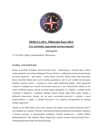 DEBATA SEA Piłkarskie Euro 2012. Czy jesteśmy zagrożeni terroryzmem? stenogram 27.10.2010, Pałac Lubomirskich, Warszawa MAREK GOLISZEWSKI: Witam wszystkich członków Stowarzyszenia Euro –Atlantyckiego i naszych gości, którzy zechcą podzielić się swoimi refleksjami. Proszę Państwa, o piłkarskich mistrzostwach Europy od strony sportowej – jako kibice – wiemy chyba wszystko. Mniej wiemy jako obywatele, którzy chcieliby śledzić jaki to jest wysiłek gospodarczy, jaki to jest wysiłek inwestycyjny. Zupełnie niewiele wiemy – a pytania ze strony opinii publicznej padają – jakie zagrożenia związane z krążącym po świecie terroryzmem łączą się z tym wydarzeniem. Myślę, że nie mamy wielkiego pojęcia, tak jak nie mieli pojęcia Hiszpanie czy Anglicy, a jednak bomby wybuchły w Madrycie i Londynie. Dlatego chcemy dzisiaj zadać kilka pytań, właśnie o piłkarskie mistrzostwa Europy, ale też nasze rozważania poszerzyć o pytanie o nasze bezpieczeństwo w ogóle, o sytuacje kryzysowe. Czy jesteśmy przygotowani na różnego rodzaju zagrożenia? Myślę, że nie tylko ludzie chcą o tym wiedzieć, ale bardzo wiele różnych instytucji, które z tym tematem są związane. Wnioski z dzisiejszej dyskusji przekażemy prezydentowi państwa, z którym jesteśmy w bezpośrednim kontakcie; również premierowi i szefom klubów parlamentarnych. Pani minister Maria Wągrowska, członek zarządu Stowarzyszenia Euro – Atlantyckiego poprowadzi dzisiejszą dyskusję. MARIA WĄGROWSKA: Dziękuję Panie Prezesie, dziękuję wszystkim Państwu za tak liczne przybycie. W Stowarzyszeniu Euro – Atlantyckim, które ma teraz ambicje zajęcia się nie tylko sensu stricto politycznymi aspektami różnych wydarzeń, postanowiliśmy zająć się również pionem nazywanym zarządzaniem kryzysowym. Rozpoczynamy od piłki: czy EURO 2012, które odbędzie się za półtora roku (przypominam: 8 czerwca mecz otwarcia w Warszawie) jest zagrożeniem samo w sobie, czy może koncentrować na sobie zagrożenia? Udało nam się zaprosić do tej dyskusji przedstawicieli władz Warszawy i agend rządowych oraz osoby mogące uchodzić za niezależnych ekspertów, które będą odpowiadać na te pytania. Pragnę przedstawić jedyną kobietę w naszym gremium: Ewę Gawor, uważaną za „silną osobę” w Warszawie, odpowiedzialną w Urzędzie Miasta Stołecznego Warszawy właśnie za bezpieczeństwo. Przedstawiam także dyrektora Rządowego Centrum Bezpieczeństwa Marcina Samsonowicza – Górskiego oraz Dariusza Deptałę, doradcę wiceministra Spraw Wewnętrznych i Administracji, który bardzo przeprasza, że nie mógł się stawić osobiście, ale akurat odbywa się komisja sejmowa właśnie spraw wewnętrznych i administracji. Następnie nasi wyśmienici eksperci, których znają Państwo również z ekranów telewizyjnych: Stefan Dziewulski, który jest ekspertem do spraw Bezpieczeństwa Imprez Masowych; Zbigniew Boniek – tu oczywiście jako ekspert sportowy. Następnie Gromosław Czempiński, również znany nam wszystkim. Także nam wszystkim znany Krzysztof Lidel, teraz w Biurze Bezpieczeństwa Narodowego, a jednocześnie redaktor naczelny wydawnictwa „Terroryzm”, szalenie interesującego i wieloaspektowo mówiącego o tym problemie. Witam bardzo serdecznie. Proszę Państwa, od razu powiem, że podzieliliśmy nasze spotkanie na dwie części. Część pierwsza – bardziej o mistrzostwach w Warszawie, a druga część to zarządzanie kryzysowe jako pewien system, do którego zarówno paneliści, jak i mam nadzieję – Państwo, będą chcieli się ustosunkować. Jako pierwszą do zabrania głosu zapraszam Panią Ewę Gawor. Pragnę jeszcze tylko powiedzieć, że za stołem prezydialnym zasiadł właśnie jeden z pierwszych ministrów obrony narodowej, kreator tych wszystkich spraw, które były związane z wejściem Polski do NATO, a teraz prezes Rady Stowarzyszenia Euro – Atlantyckiego - Pan Janusz Onyszkiewicz, którego specjalnie serdecznie witam. EWA GAWOR: Cieszę się, że Państwo zauważyli rolę samorządu, postaram się powiedzieć krótko na temat stanu bezpieczeństwa, jak rozumiemy realizację zadań, jakich mamy partnerów. Rzeczywiście, ciągle zadajemy sobie pytanie, co jeszcze możemy zrobić dla mieszkańców, żeby było bezpieczniej. My, samorządowcy jesteśmy najbliżej mieszkańców i swoją pracę postrzegamy jako służebną rolę wobec mieszkańców. Jeżeli mówimy o terroryzmie i o bezpieczeństwie –to mówimy o długofalowych i systematycznych działaniach ; nie rozwiązuje się tych problemów akcyjnością. Rozumiem, że EURO jest dla większości z nas hasłem; powodem, żeby mówić o bezpieczeństwie, o stanie bezpieczeństwa wewnętrznego w kraju, bo tak też rozumiem swoją obecność tutaj. W Warszawie zameldowanych jest milion siedemset tysięcy osób, ale na co dzień przebywa w nim od trzech do trzech i pół miliona osób. Gdybyśmy mówili o działaniach na skalę masową, o ewakuacji miasta, to mówimy o trzech - trzech i pół milionie osób. Nie chciałabym tu moim kolegom z resortu spraw wewnętrznych większych przytyków robić, ale ciągle mówię, że siły i środki powinny uwzględniać te osoby, które u nas przebywają, a nie według stanu meldunkowego. Myślę tutaj o etatach policyjnych, straży pożarnej. Koledzy sobie doskonale radzą, ale wiem, jak czasem jest trudno – przy tym stanie etatowym – wywiązać się należycie, czy bardzo dobrze, z zadań. Według ustawy o samorządzie gminnym, o samorządzie powiatowym (Warszawa jest miastem na prawach powiatu) ma on wykonywać następujące zadania: zadbać o bezpieczeństwo mieszkańców, o porządek publiczny; cały temat zarządzania kryzysowego. Mamy zadania, mamy dużą odpowiedzialność, ale ustawodawca kompetencje zostawił poza samorządem. Nie mamy tych zadań określonych; nie jest powiedziane, w jaki sposób samorząd ma te zadania realizować. Proszę