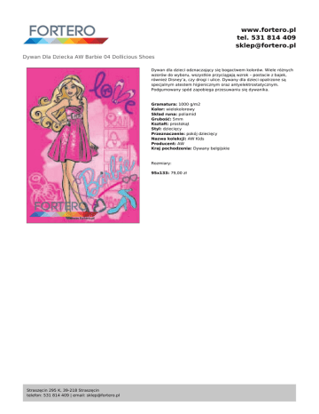 www.fortero.pl tel. 531 814 409 [email protected] Dywan Dla Dziecka AW Barbie 04 Dollicious Shoes Dywan dla dzieci odznaczający się bogactwem kolorów. Wiele różnych wzorów do wyboru, wszystkie przyciągają wzrok – postacie z bajek, również Disney’a, czy drogi i ulice. Dywany dla dzieci opatrzone są specjalnym atestem higienicznym oraz antyelektrostatycznym. Podgumowany spód zapobiega przesuwaniu się dywanika. Gramatura: 1000 g/m2 Kolor: wielokolorowy Skład runa: poliamid Grubość: 5mm Kształt: prostokąt Styl: dziecięcy Przeznaczenie: pokój dziecięcy Nazwa kolekcji: AW Kids Producent: AW Kraj pochodzenia: Dywany belgijskie Rozmiary: 95x133: 79,00 zł Straszęcin 295 K, 39-218 Straszęcin telefon: 531 814 409 | email: [email protected]