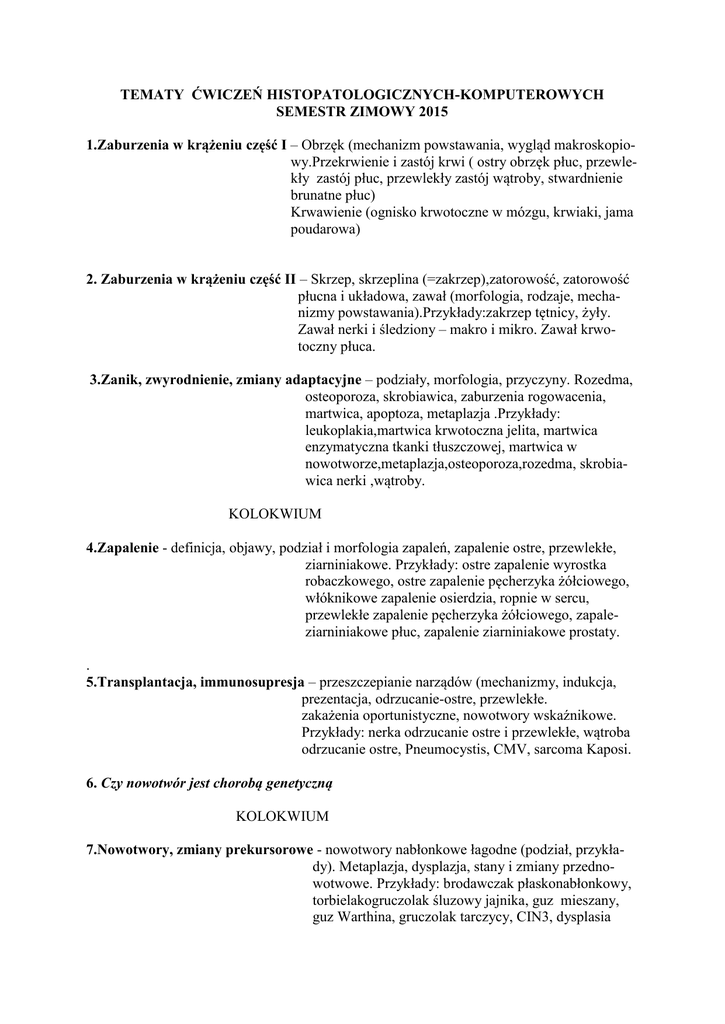 TEMATY ĆWICZEŃ HISTOPATOLOGICZNYCH-KOMPUTEROWYCH SEMESTR ZIMOWY 2015 1.Zaburzenia w krążeniu część I – Obrzęk (mechanizm powstawania, wygląd makroskopiowy.Przekrwienie i zastój krwi ( ostry obrzęk płuc, przewlekły zastój płuc, przewlekły zastój wątroby, stwardnienie brunatne płuc) Krwawienie (ognisko krwotoczne w mózgu, krwiaki, jama poudarowa) 2. Zaburzenia w krążeniu część II – Skrzep, skrzeplina (=zakrzep),zatorowość, zatorowość płucna i układowa, zawał (morfologia, rodzaje, mechanizmy powstawania).Przykłady:zakrzep tętnicy, żyły. Zawał nerki i śledziony – makro i mikro. Zawał krwotoczny płuca. 3.Zanik, zwyrodnienie, zmiany adaptacyjne – podziały, morfologia, przyczyny. Rozedma, osteoporoza, skrobiawica, zaburzenia rogowacenia, martwica, apoptoza, metaplazja .Przykłady: leukoplakia,martwica krwotoczna jelita, martwica enzymatyczna tkanki tłuszczowej, martwica w nowotworze,metaplazja,osteoporoza,rozedma, skrobiawica nerki ,wątroby. KOLOKWIUM 4.Zapalenie - definicja, objawy, podział i morfologia zapaleń, zapalenie ostre, przewlekłe, ziarniniakowe. Przykłady: ostre zapalenie wyrostka robaczkowego, ostre zapalenie pęcherzyka żółciowego, włóknikowe zapalenie osierdzia, ropnie w sercu, przewlekłe zapalenie pęcherzyka żółciowego, zapaleziarniniakowe płuc, zapalenie ziarniniakowe prostaty. . 5.Transplantacja, immunosupresja – przeszczepianie narządów (mechanizmy, indukcja, prezentacja, odrzucanie-ostre, przewlekłe. zakażenia oportunistyczne, nowotwory wskaźnikowe. Przykłady: nerka odrzucanie ostre i przewlekłe, wątroba odrzucanie ostre, Pneumocystis, CMV, sarcoma Kaposi. 6. Czy nowotwór jest chorobą genetyczną KOLOKWIUM 7.Nowotwory, zmiany prekursorowe - nowotwory nabłonkowe łagodne (podział, przykłady). Metaplazja, dysplazja, stany i zmiany przednowotwowe. Przykłady: brodawczak płaskonabłonkowy, torbielakogruczolak śluzowy jajnika, guz mieszany, guz Warthina, gruczolak tarczycy, CIN3, dysplasia w nabłonku płaskim, gruczolak cewkowo-kosmkowy z dużą dysplazją, gruczolak cewkowy, gruczolak cewkowo-kosmkowy, metaplazja jelitowa, leukoplakia. 8.Nowotwory złośliwe, nowotwory złośliwe nabłonkowe – wiadomości ogólne: cechy korek nowotworowych złośliwych, karcynogeneza, epidemiologia, grading (TNM), staging. Nowotwory złośliwe nabłonkowe ( podziały, terminologia, histologia).Przykłady: nowotwór neuroendokrynny, rak płaskonabłonkowy, rak podstawnokomórkowy, rak gruczołowy. 9.Nowotwory łagodne i złośliwe tkanek miękkich – klasyfikacja WHO, podziały,histologia. Przykłady: tłuszczak, naczyniak jamisty, naczyniak włosowaty, mięsak Kaposiego, mięśniak, mięśniak gładkokomórkowy mięsakowy(leiomyosarcoma), tłuszczakomięsak (liposarcoma). 10.Analiza danych otrzymanych w NGS. Biologiczna i medyczna interpretacja wyniku 11.Nowotwory skóry, nowotwory kości – zmiany i nowotwór tkanki barwnikotwórczej , nowotwory nabłonkowe. Nowotwory kości. Przykłady: naevus dermalis, melanoma malignum,osteosarcoma, chondrosarcoma, sarcoma Ewing. 12. Nowotwory układu chłonnego i krwiotwórczego – odczyny,CLL/SLL, chłoniak Hodgkina, szpiczak mnogi, samoistne włóknienie szpiku, chłoniak rozlany z dużych komórek B. Przykłady: KOLOKWIUM