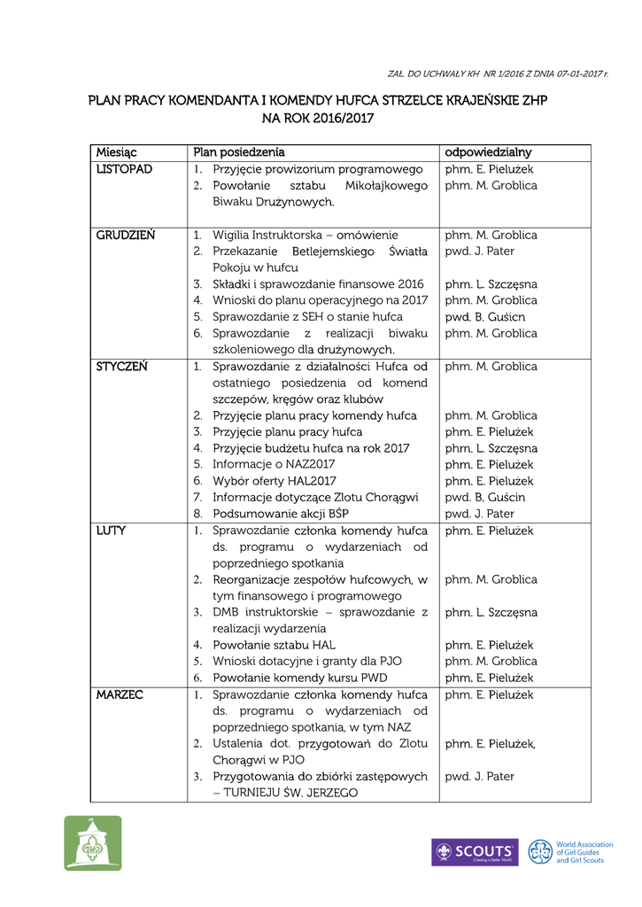 PLAN PRACY KOMENDANTA I KOMENDY HUFCA NA ROK 2016/2017 LISTOPAD LUTY MARZEC Plan posiedzenia 1. 2. Biwaku odpowiedzialny 1. Wigilia Instruktorska 2. Przekazani Pokoju w hufcu 3. i sprawozdanie finansowe 2016 4. Wnioski do planu operacyjnego na 2017 5. Sprawozdanie z SEH o stanie hufca 6. Sprawozdanie z realizacji biwaku szkoleniowego dl 1. ostatniego posiedzenia od komend phm. M. Groblica pwd. J. Pater 2. 3. 4. 5. Informacje o NAZ2017 6. 7. 8. 1. Sprawozdanie ds. programu o wydarzeniach od poprzedniego spotkania 2. tym finansowego i programowego 3. DMB instruktorskie sprawozdanie z realizacji wydarzenia 4. 5. Wnioski dotacyjne i granty dla PJO 6. 1. Sprawozdanie ds. programu o wydarzeniach od poprzedniego spotkania, w tym NAZ 2. Ustalenia dot. p do Zlotu wi w PJO 3. TURNIEJU phm. M. Groblica phm. M. Groblica na phm. M. Groblica phm. M. Groblica phm. M. Groblica pwd. pwd. J. Pater phm. M. Groblica phm. M. Groblica phm. E. pwd. J. Pater ne 4. cin, phm. Mariusz Groblica 5. ramach phm. M. Groblica 1. ostatniego posiedzenia od komend 2. hufcowego inwentaryzacyjnego-kasacyjnego pwd. J. Pater 3. obozowych podsumowanie 4. 5. Podsumowanie list wyjazdowych na MAJ CZERWIEC 1. Sprawozdanie ds. programu o wydarzeniach od poprzedniego spotkania 2. Inwentaryzacja hufca 3. Podsumowanie turnieju 4. Sprawy organizacyjne 5. Przygotowania do HAL - finanse 6. kampanii bohater 60-lecia na terenie hufca i w PJO 1. Sprawozdanie ds. programu o wydarzeniach od poprzedniego spotkania 2. Przygotowania do HAL zatwierdzenie pwd. J. Pater pwd. J. Pater phm. M. Groblica 3. Sprawozdanie z inwentaryzacji hufca 4. lan pracy Hufca oraz KH na rok 2017/2016 5. pwd. J. Pater 6. Przygotowania do zjazdu sprawozdawczego hufca strategii hufca i planu operacyjnego phm. M. Groblica phm. M Groblica CELE STRATEGICZNE PLANU OPERACYJNEGO HUFCA NA ROK 2016/17 -2019 Osoba Komendant hufca Skarbnik hufca hufca ds. programu Zadania operacyjne - reorganizacja biura KH - archiwizacja dokumentacji hufca - wprowadzenie kadry w hufcu - reorg nie i rozliczanie hufca w terminie zgodnie z przepisami ZHP - inwentaryzacja hufca - -lecia ds. promocji i ewidencji hufca - w PJO d HSI, w tym Odpowiedzialny za zadania programowe w hufcu Wigilia Hufca - dla kadry hufca Instruktorskiej (luty) przybocznych oraz Kurs przewodnikowski - dla funkcyjnych bez przeszkolenia (marzec- - Komendant szczepu CZARNA JEDYNKA - wspieranie merytoryczne kadry i w realizacji programu i S hufca HOGWART Komendant szczepu - pomoc przy organizacji akcji zarobkowych na - Festiwal harcPATA i biwak pofestiwalowy (listopad) 2016 - wspieranie kadry instruktorskiej w rozwoju - wspieranie d i specjalistycznych w Monografia hufca (maks. do kwietnia) Gry i szkolenia ratownicze (maj) Komendant szczepu PUSZCZA instr. BASZTA harcerskiego klubu ratowniczego hufca